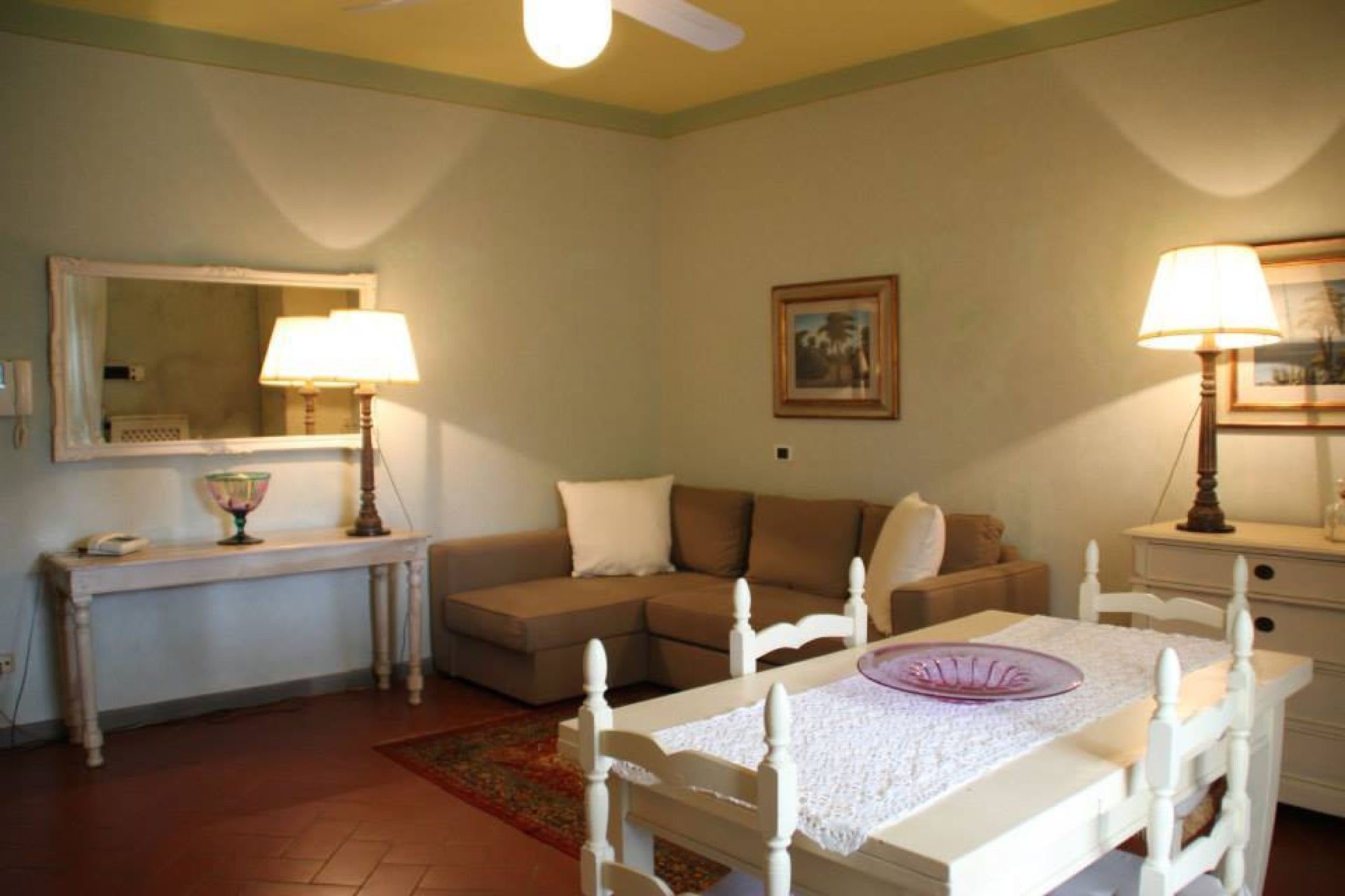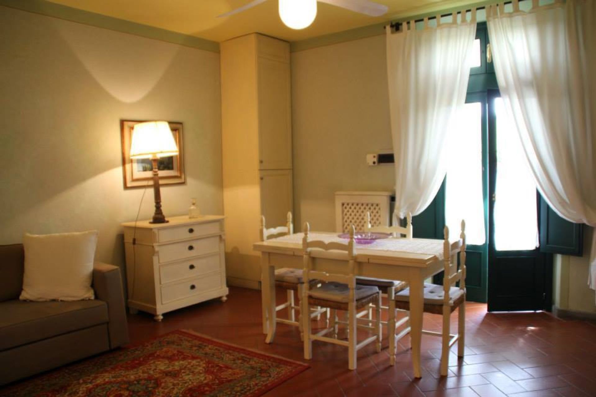 Piano terreno: ingresso su soggiorno (ventilatore a soffitto) con divano letto matrimoniale e zona pranzo con angolo cottura (forno, freezer, lavastoviglie, macchina da caffè espresso), camera matrimoniale, bagno con doccia.