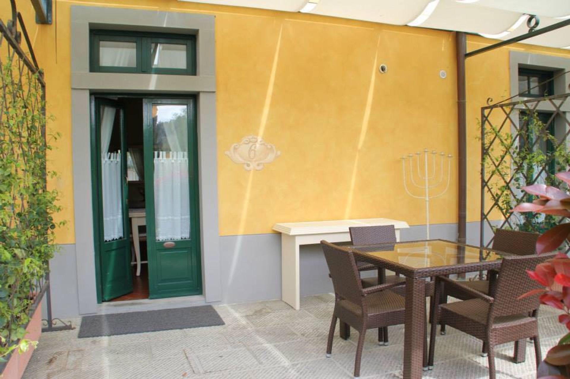 Questo appartamento dispone di due spazi esterni privati ed attrezzati: ad uno vi si accede dalla camera e all'altro dalla zona giorno.
