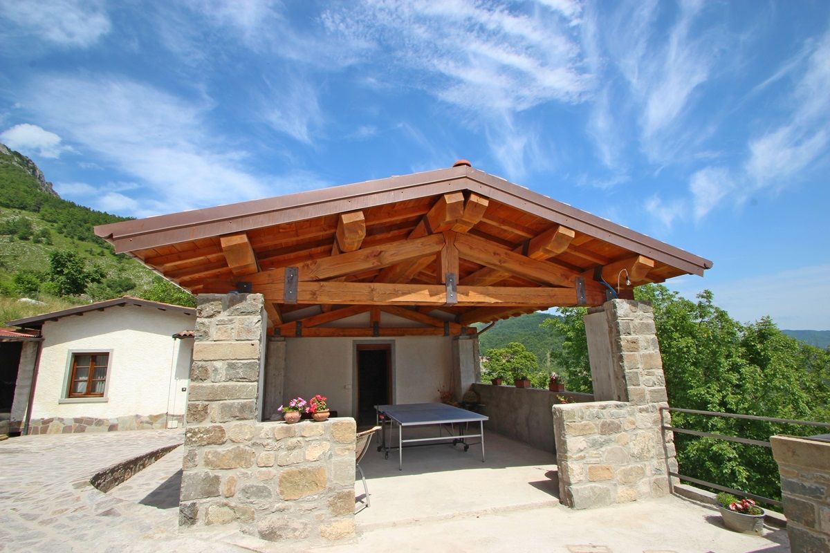Nella parte alta invece a disposizione una terrazza coperta con vista panoramica e zona pranzo e ulteriore barbecue.