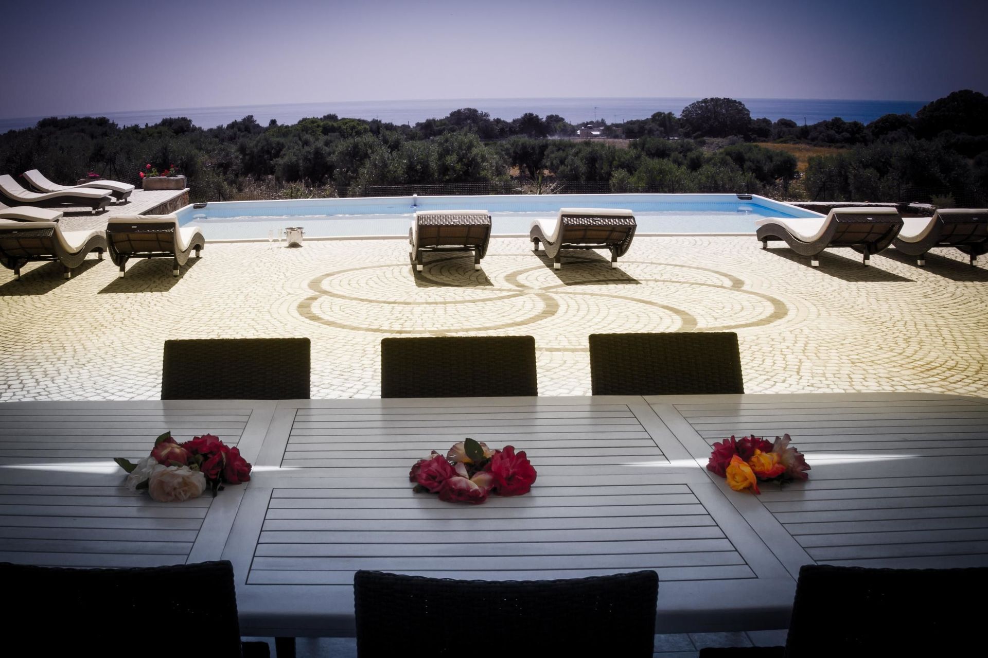 L'ampia piscina è ad uso esclusivo degli ospiti e regala momenti di puro relax grazie anche alla meravigliosa visuale panoramica del mare antistante.