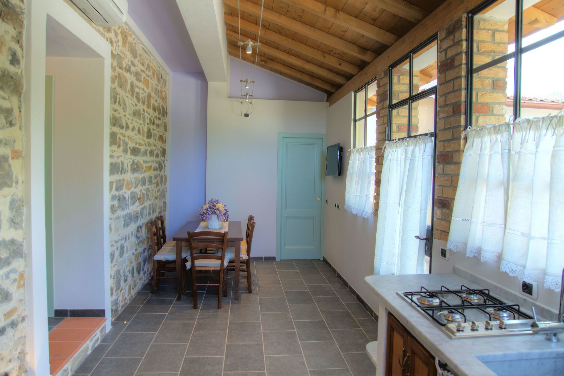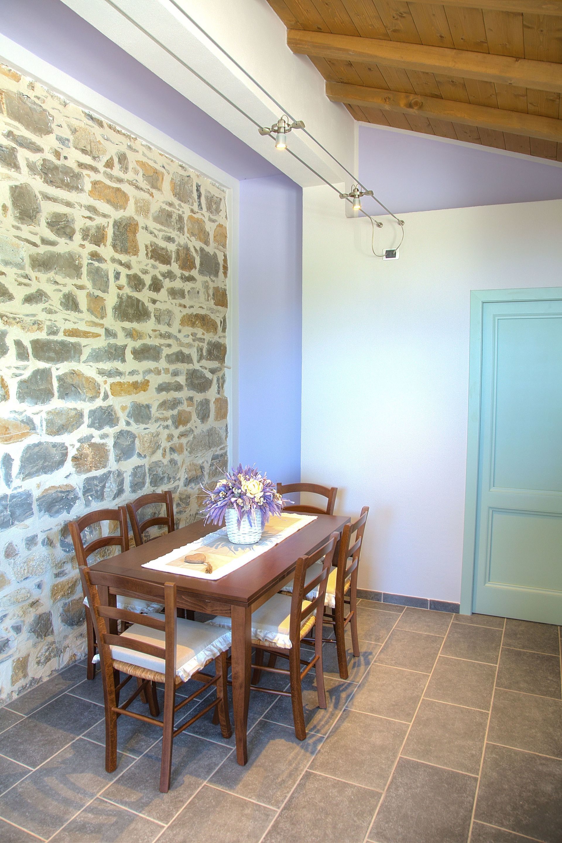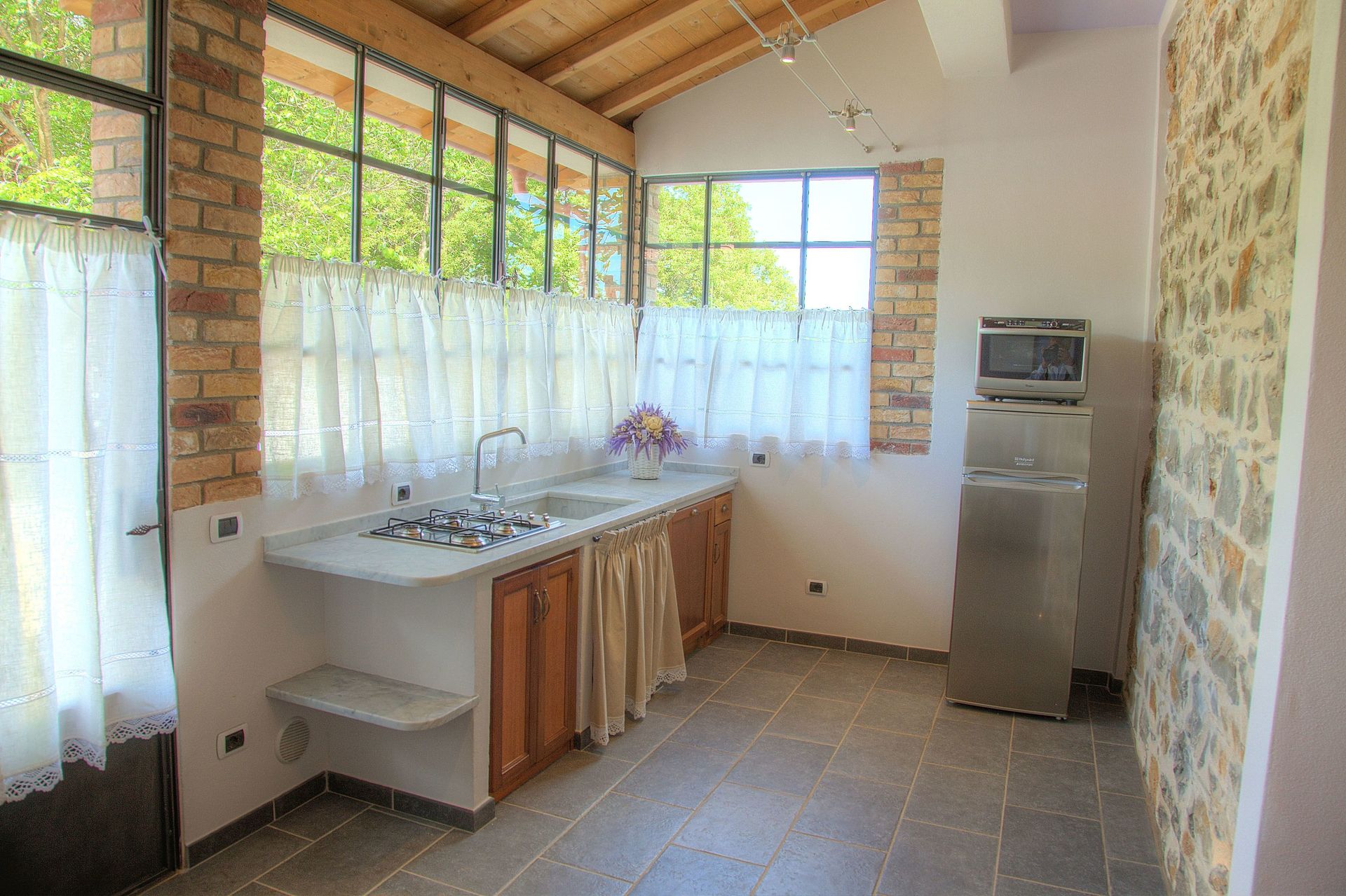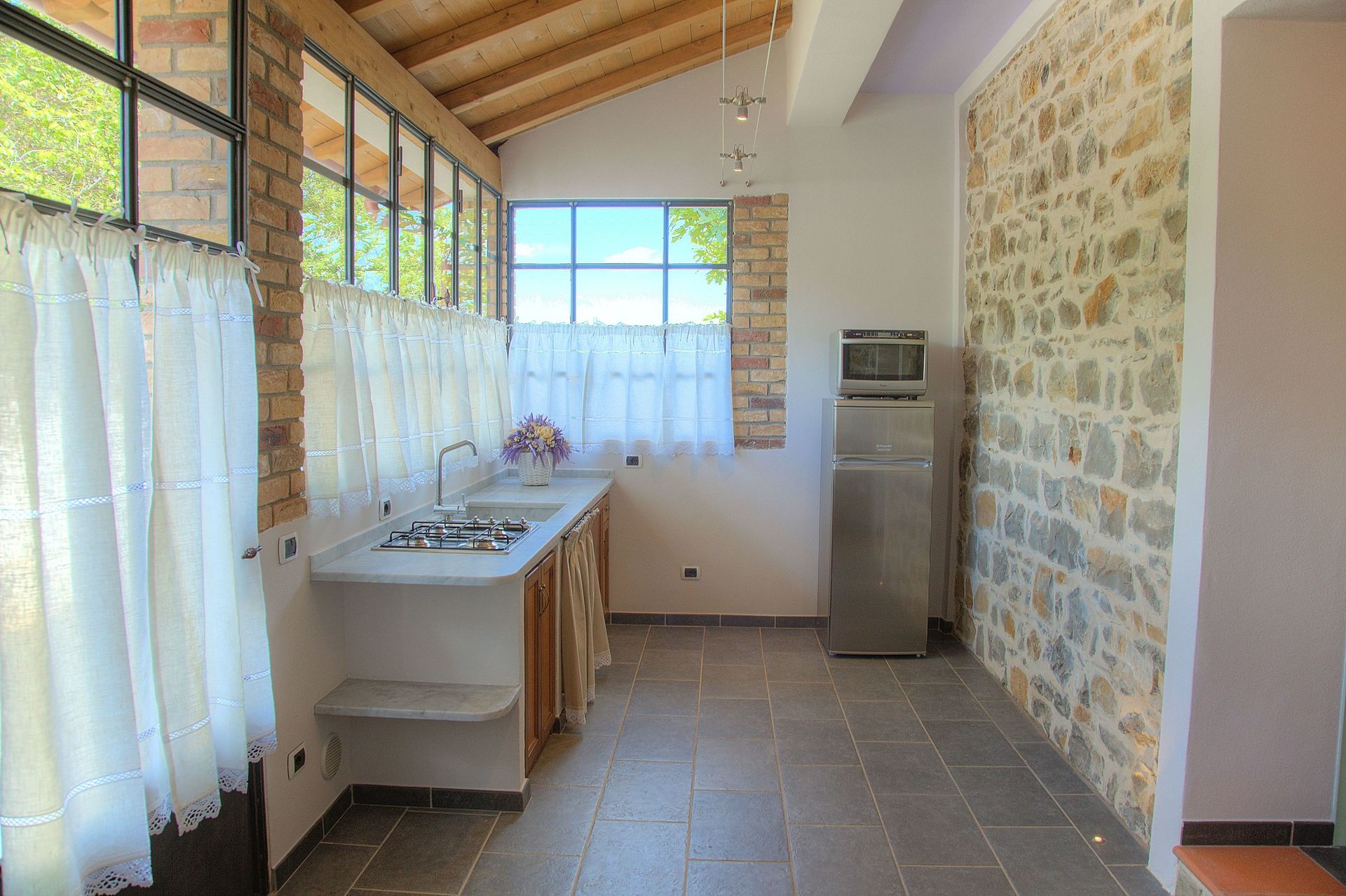 Si affaccia su una piccola corte che delimita un tappeto erboso. Deriva dal restauro di un deposito in pietra per le olive e di una legnaia.