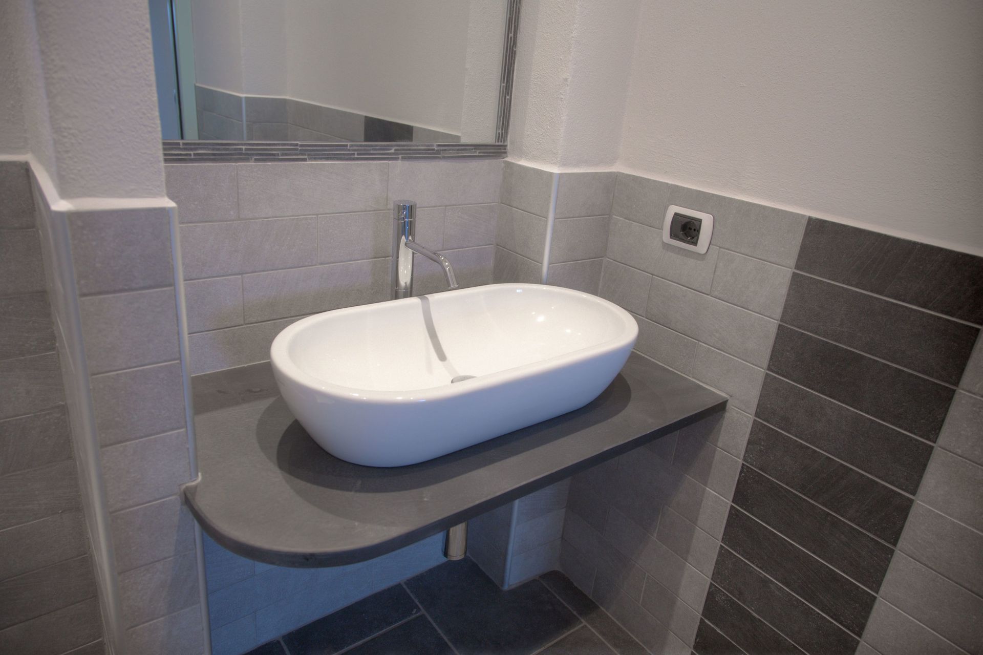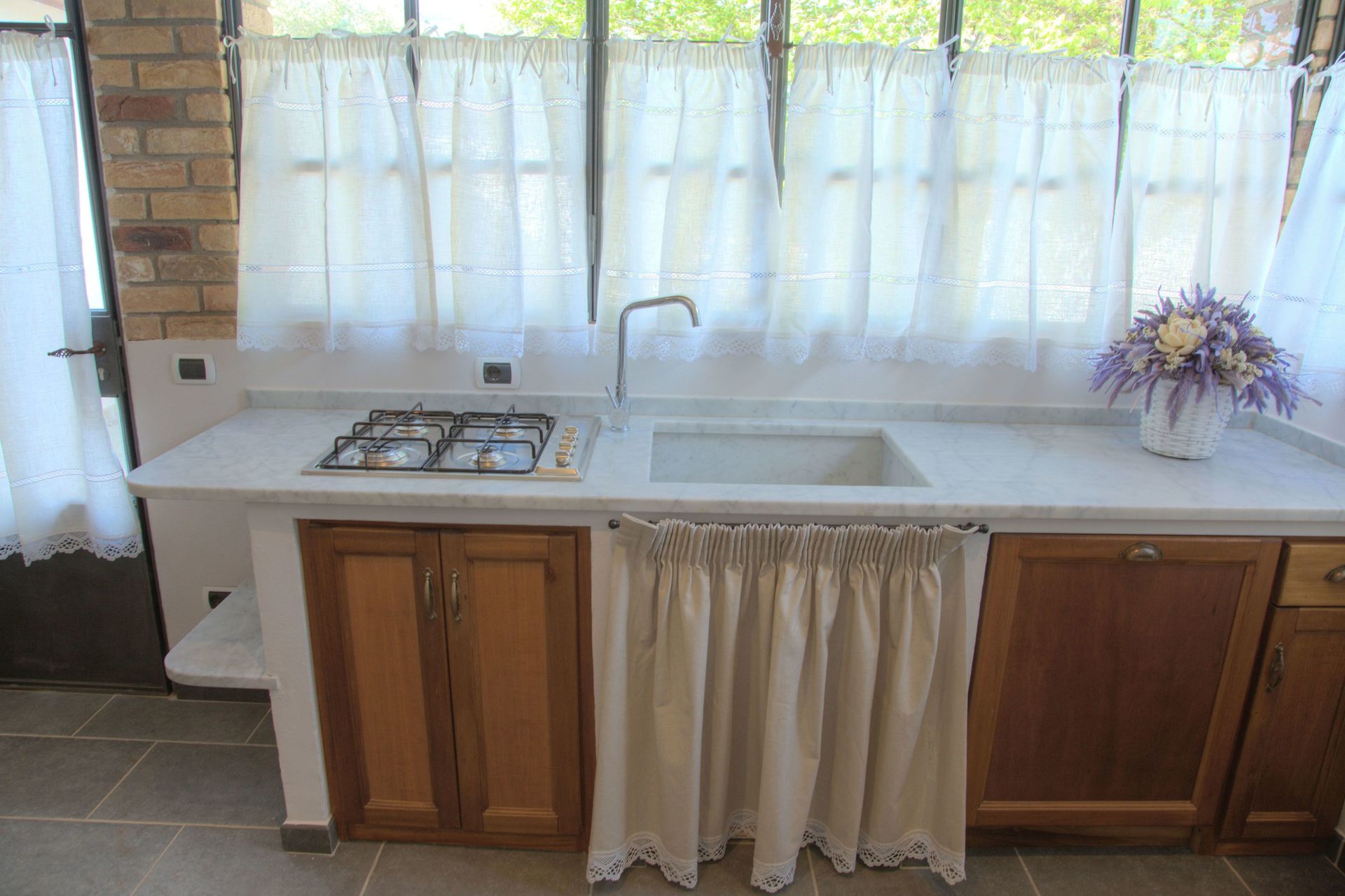 Lavello e piano della cucina sono stati realizzati con il tipico marmo delle cucine liguri.