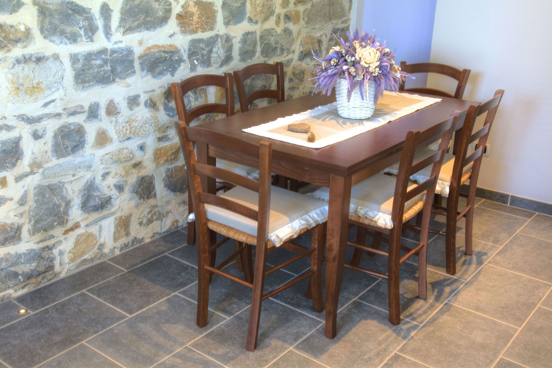 Sotto l’alto soffitto di travi di legno l’ampia zona giorno ha un’intera parete con pietra a vista e due lati disegnati da ampie vetrate con intelaiatura di ferro battuto che conferiscono grande luminosità all’ambiente.