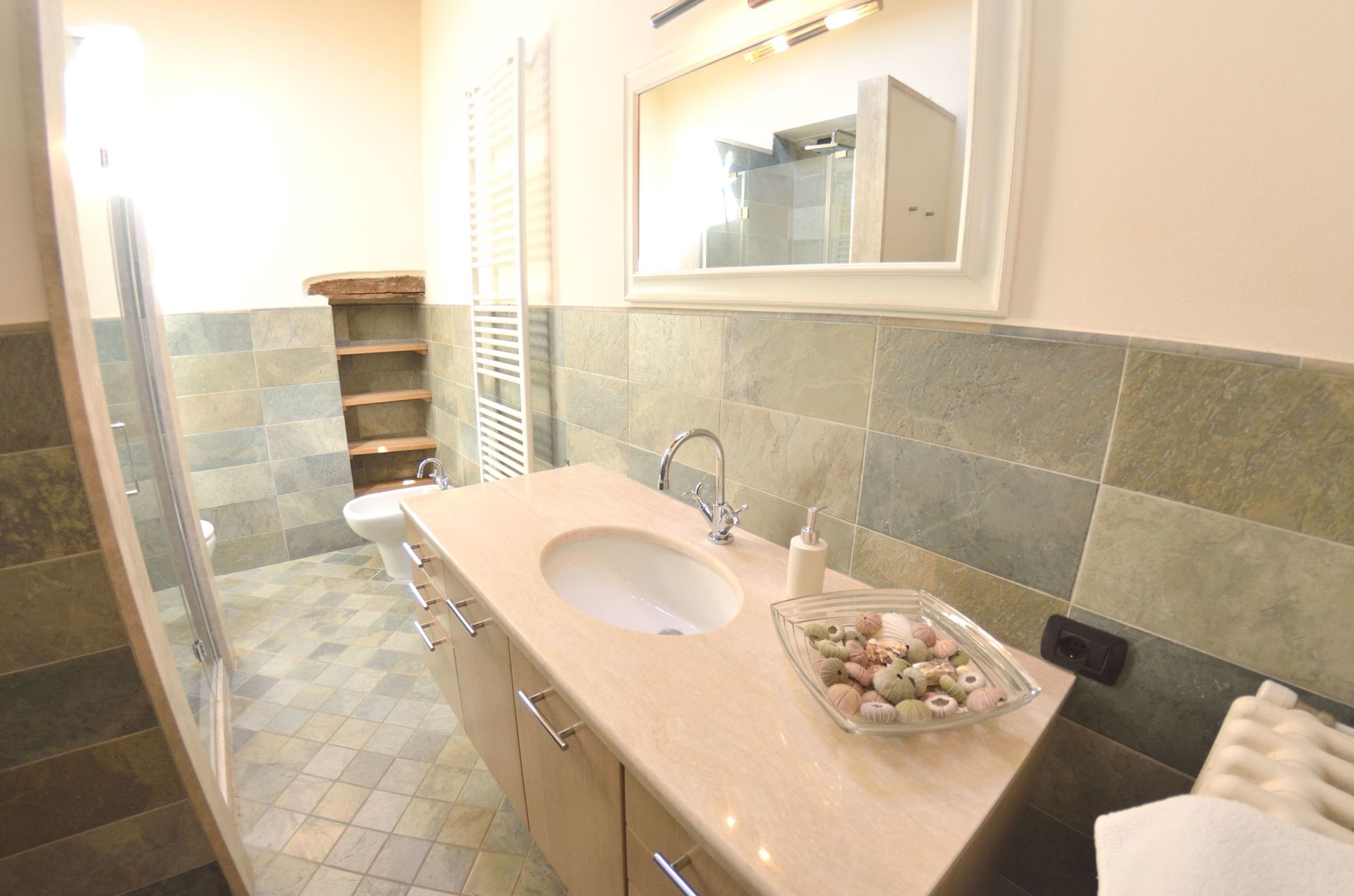 Bagno: lavandino, wc, bidet, doccia.