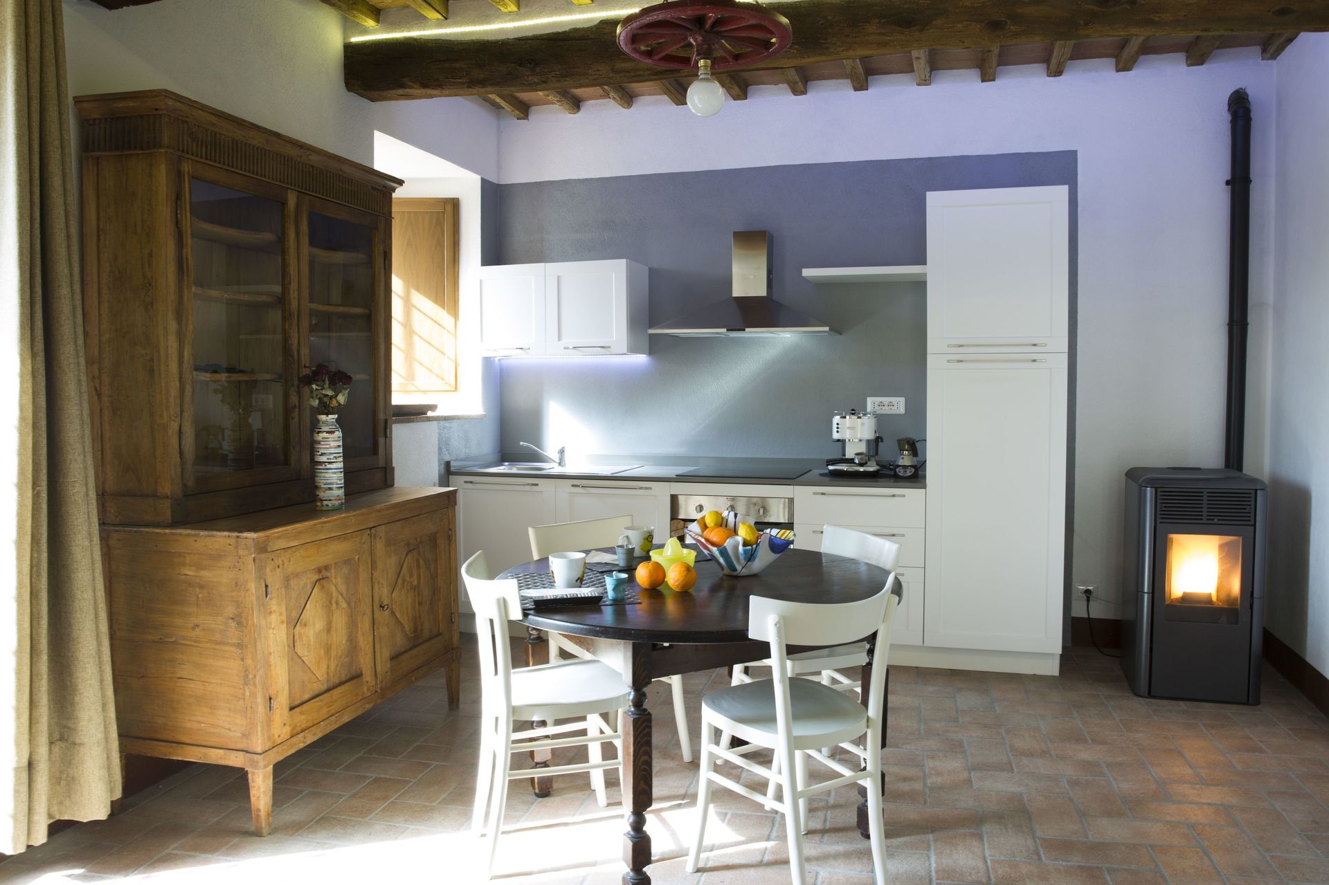 Cucina - soggiorno (30 m2): cucina ben attrezzata, tavolo da pranzo (persone: 6), lavastoviglie, frigo, freezer, piano cottura, stufa a legna, forno, macchina da caffè (italiana), lavatrice, poltrona, divano letto matrimoniale (larghezza: 160m, lunghezza: 190m), internet WIFI, zanzariere, televisione, uscita sul giardino.