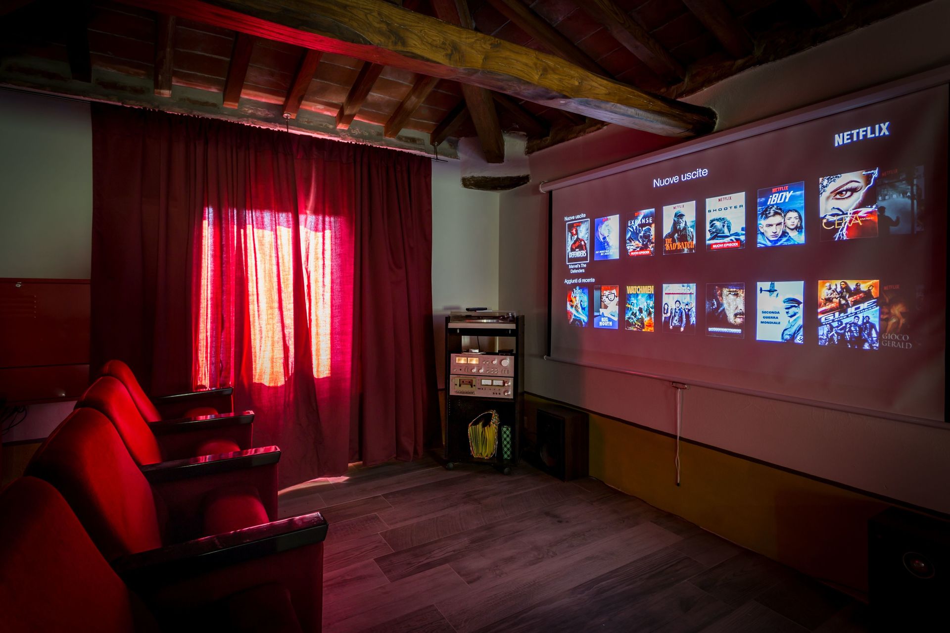 L'attico è arredato con una zona lettura con due divani e un Cinema con vere sedie vintage!