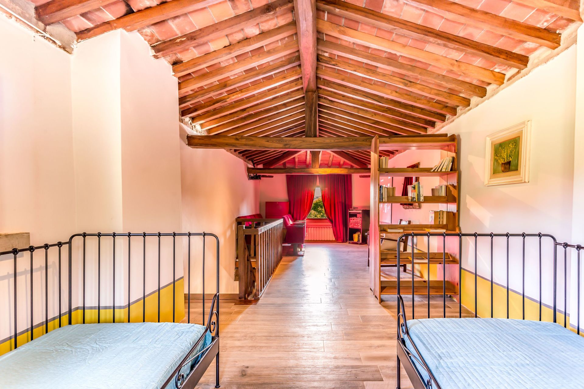 Primo Piano: salendo le scale si arriva al primo piano, corridoio con scrivania /studio e zona notte con 3 camere da letto e bagno privato (due matrimoniali e una con due letti singoli).