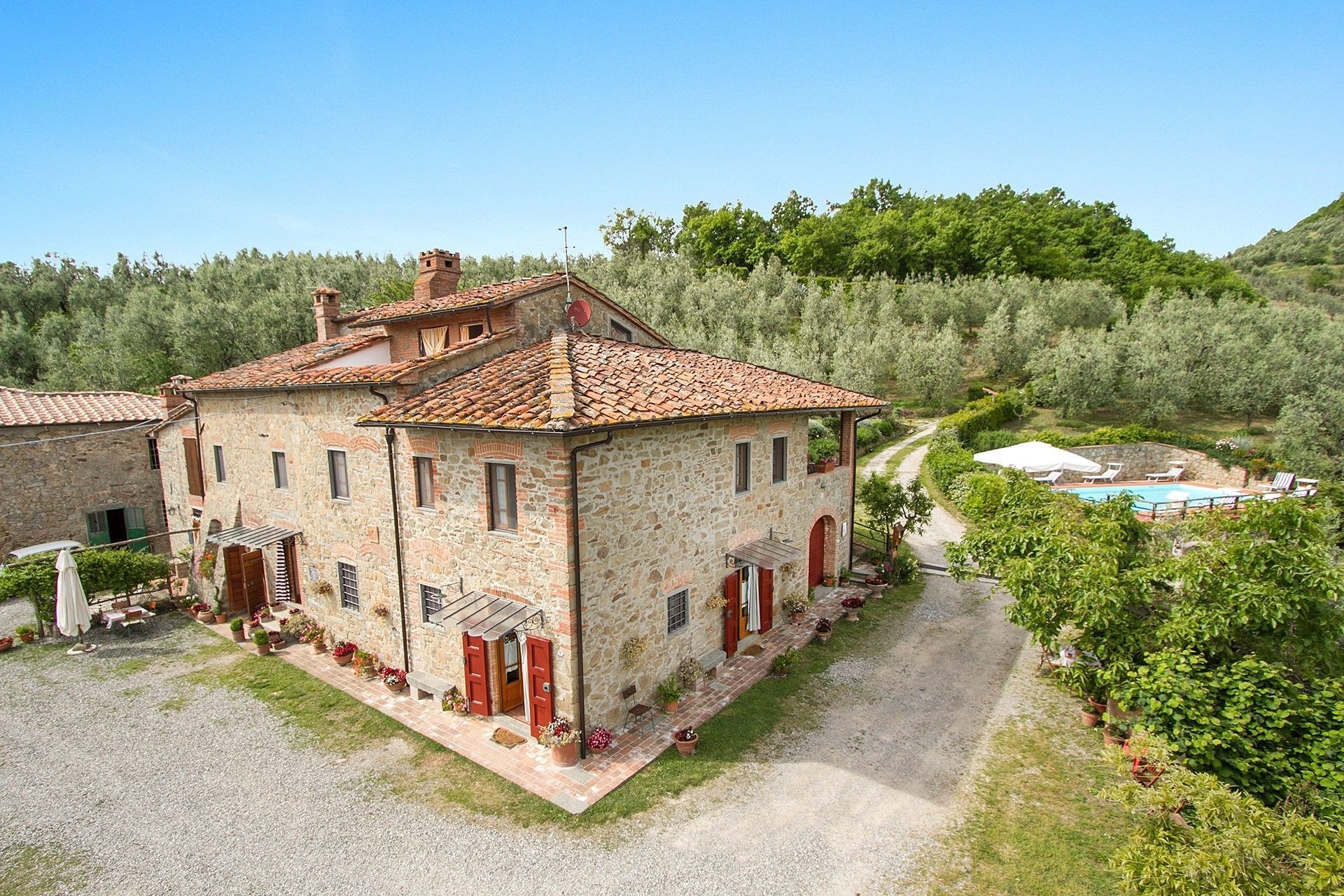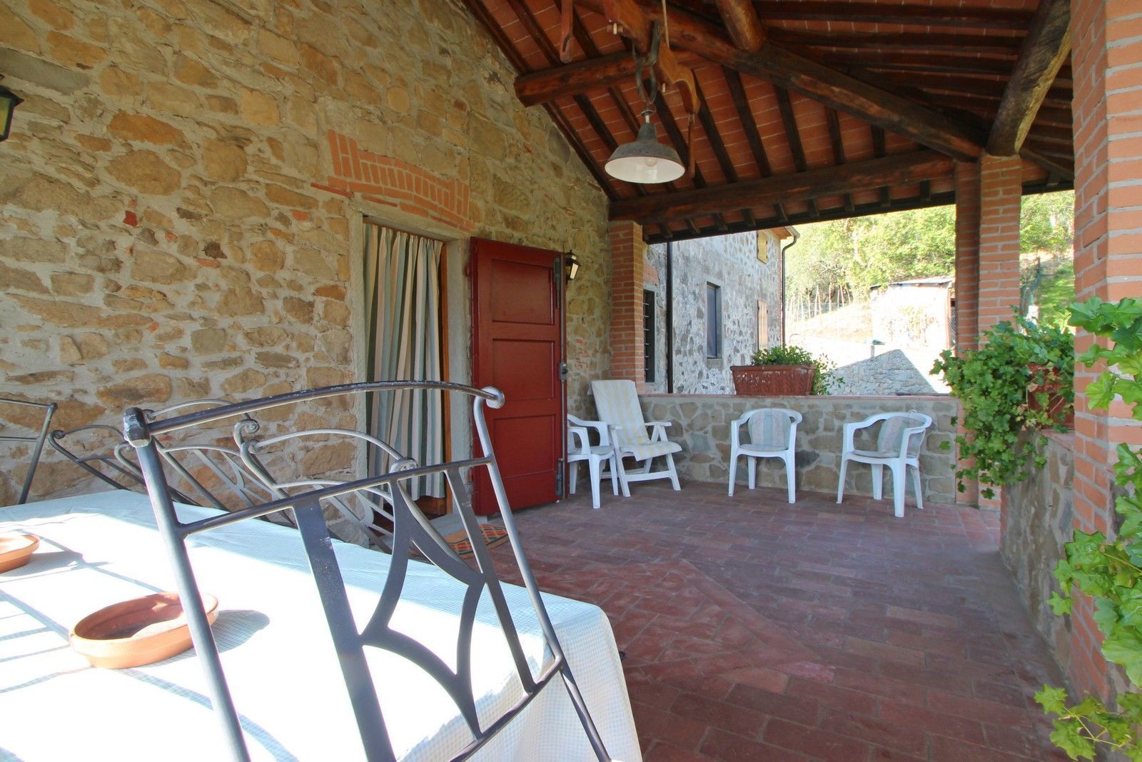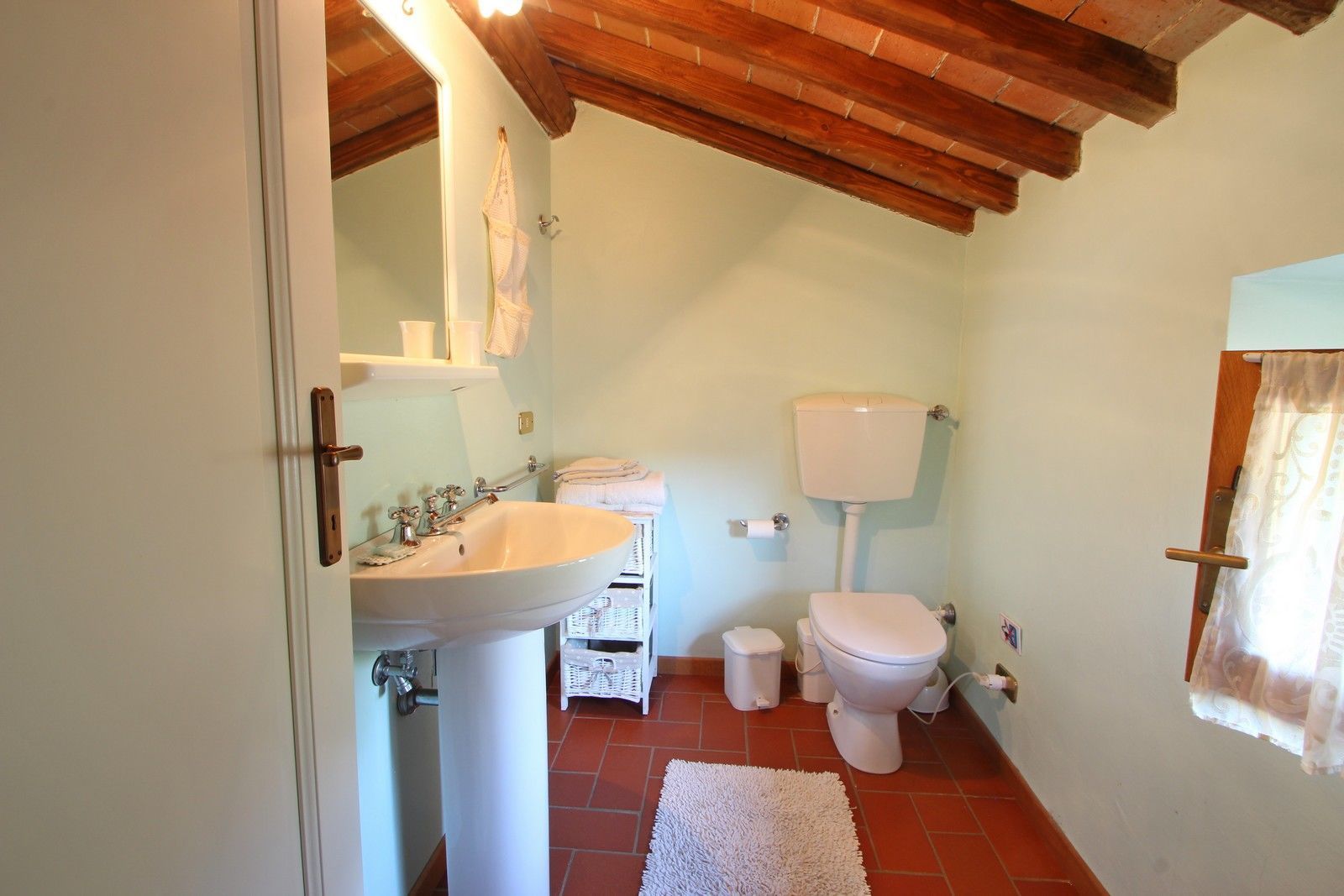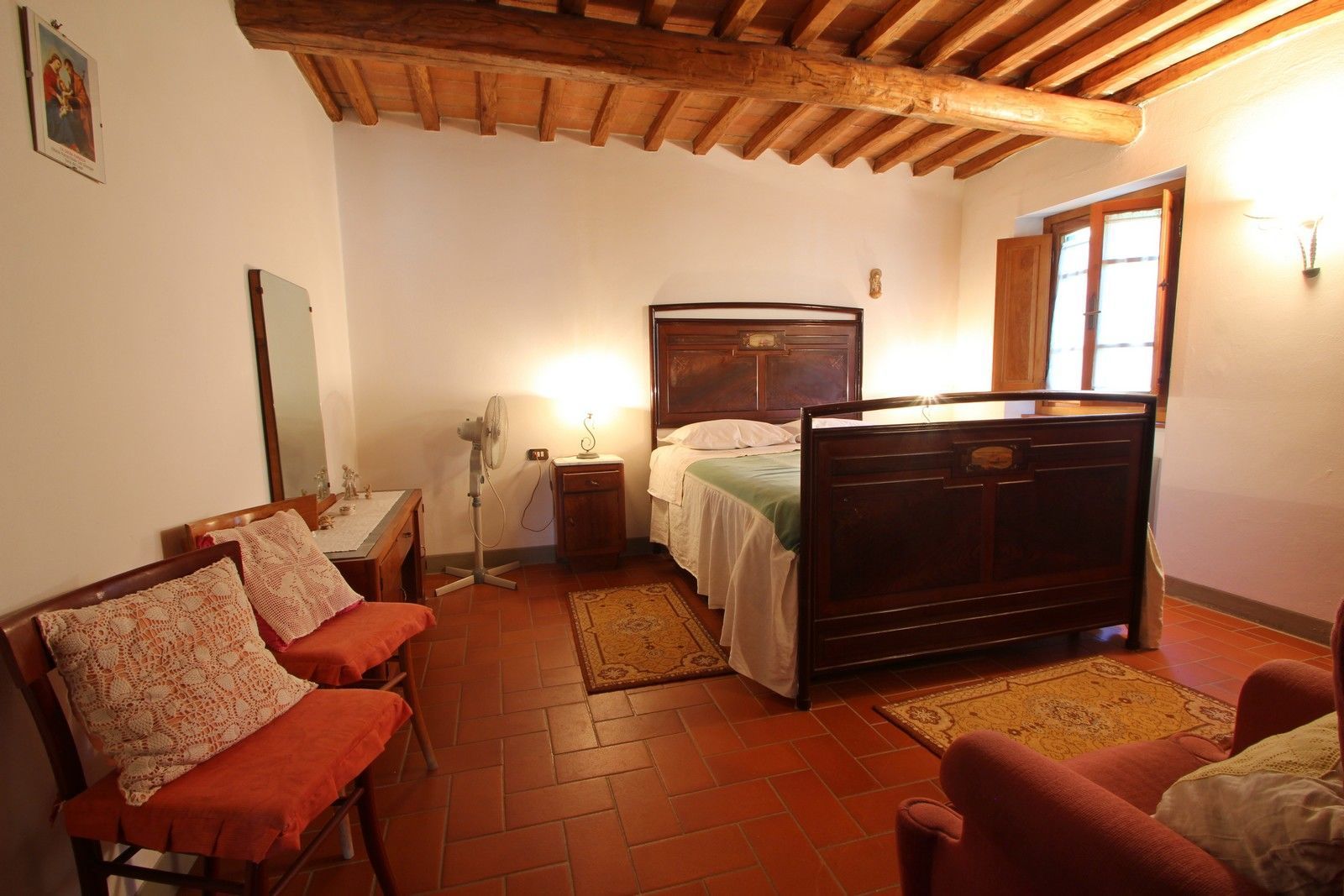 una camera matrimoniale con letto di ferro con bandone, una camera con letto matrimoniale, un bagno con cabina-doccia, una camera singola con un letto e accesso verso la veranda (terrazza coperta a travi con vista sulla piscina e con scale esterne in pietra serena verso il giardino e tavolo da pranzo) , una camera matrimoniale con letto in ferro battuto da cui si accede al secondo piano con scale in pietra serena.