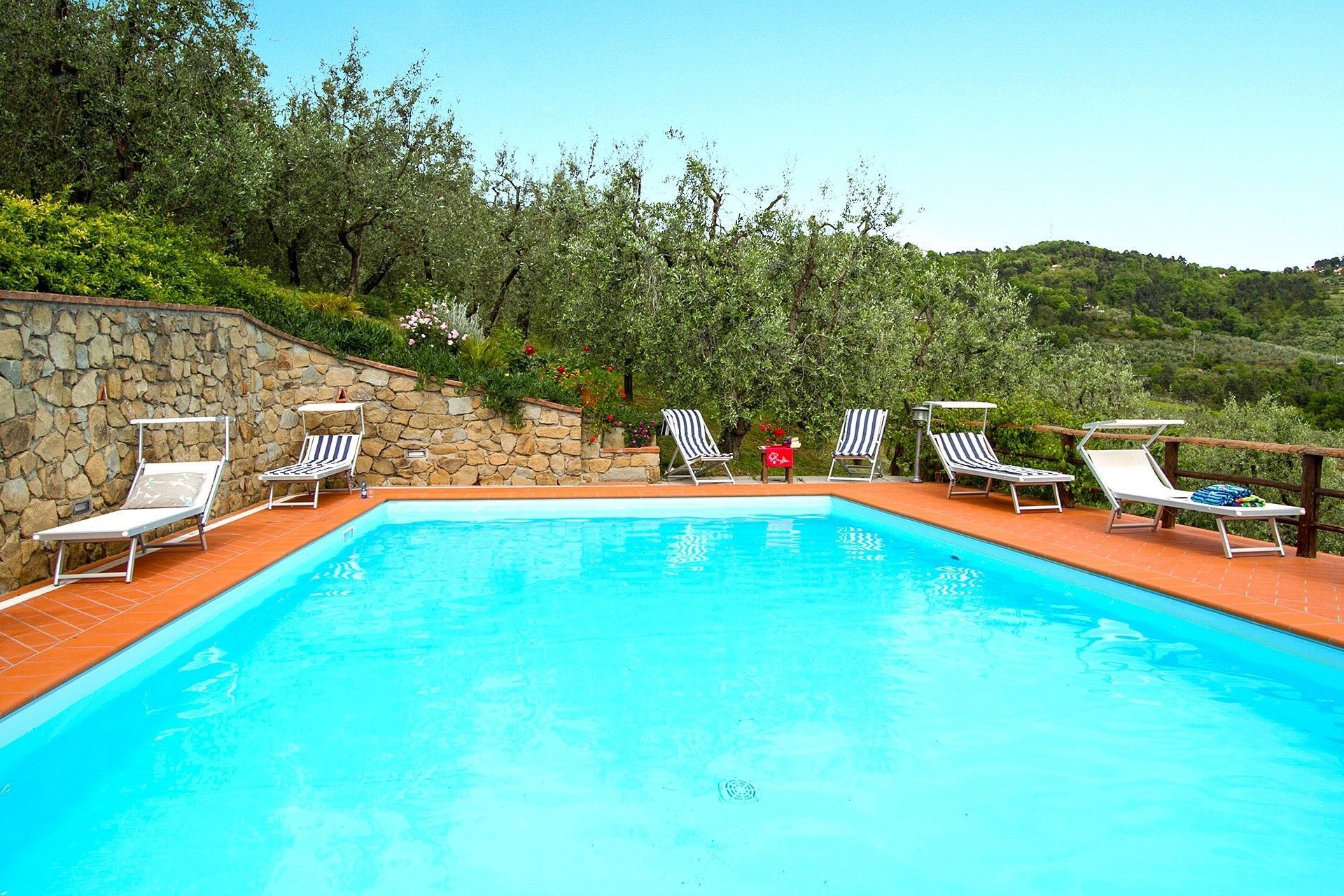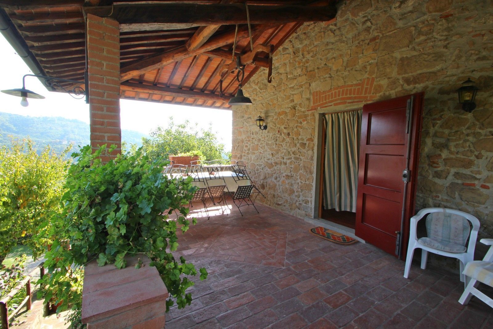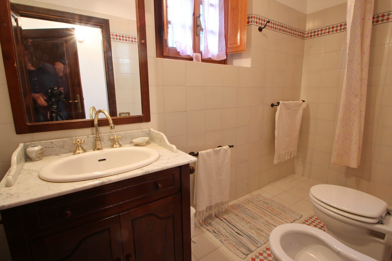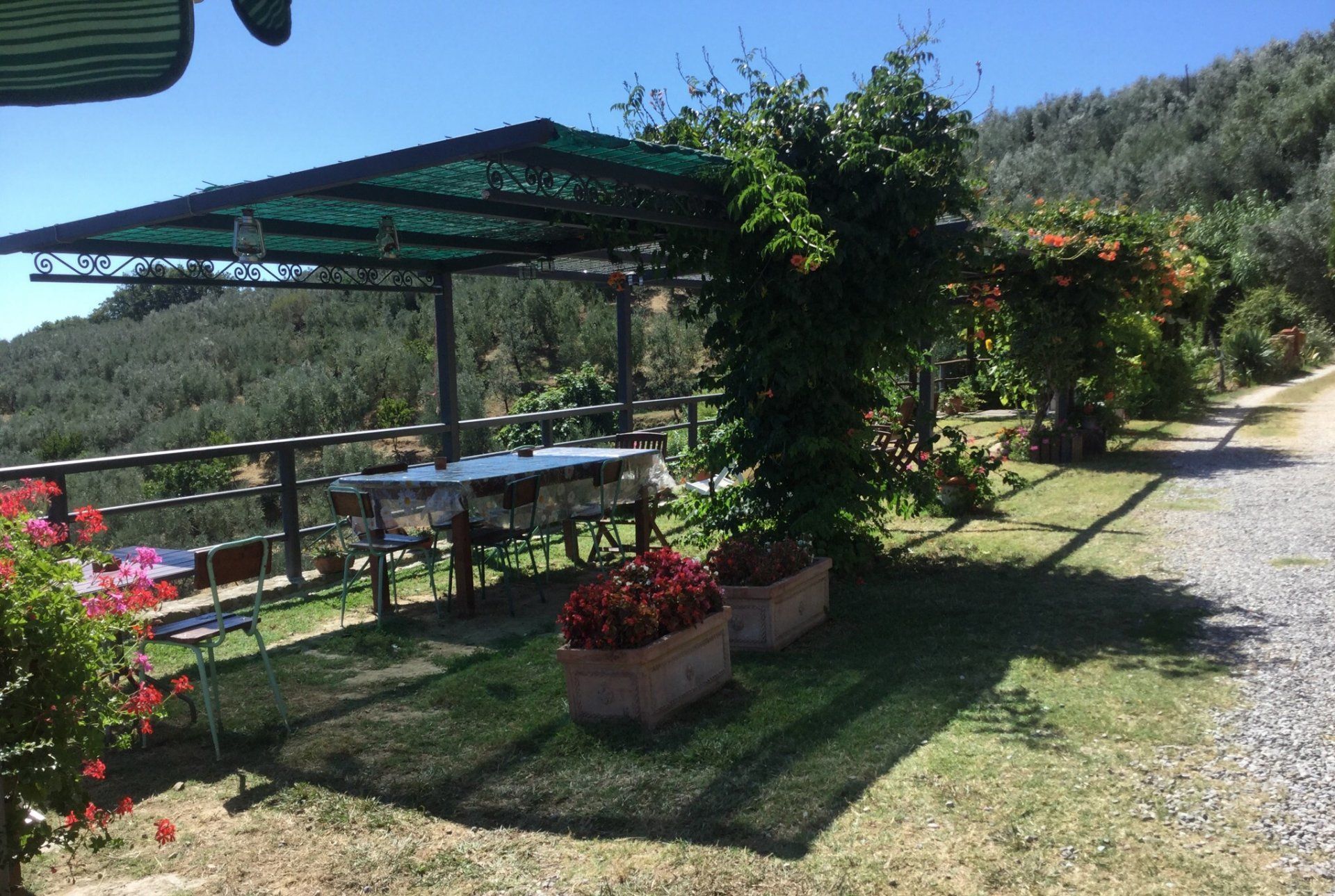 una camera matrimoniale con letto di ferro con bandone, una camera con letto matrimoniale, un bagno con cabina-doccia, una camera singola con un letto e accesso verso la veranda (terrazza coperta a travi con vista sulla piscina e con scale esterne in pietra serena verso il giardino e tavolo da pranzo) , una camera matrimoniale con letto in ferro battuto da cui si accede al secondo piano con scale in pietra serena.