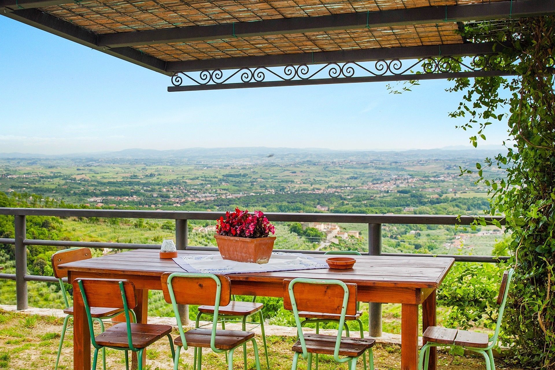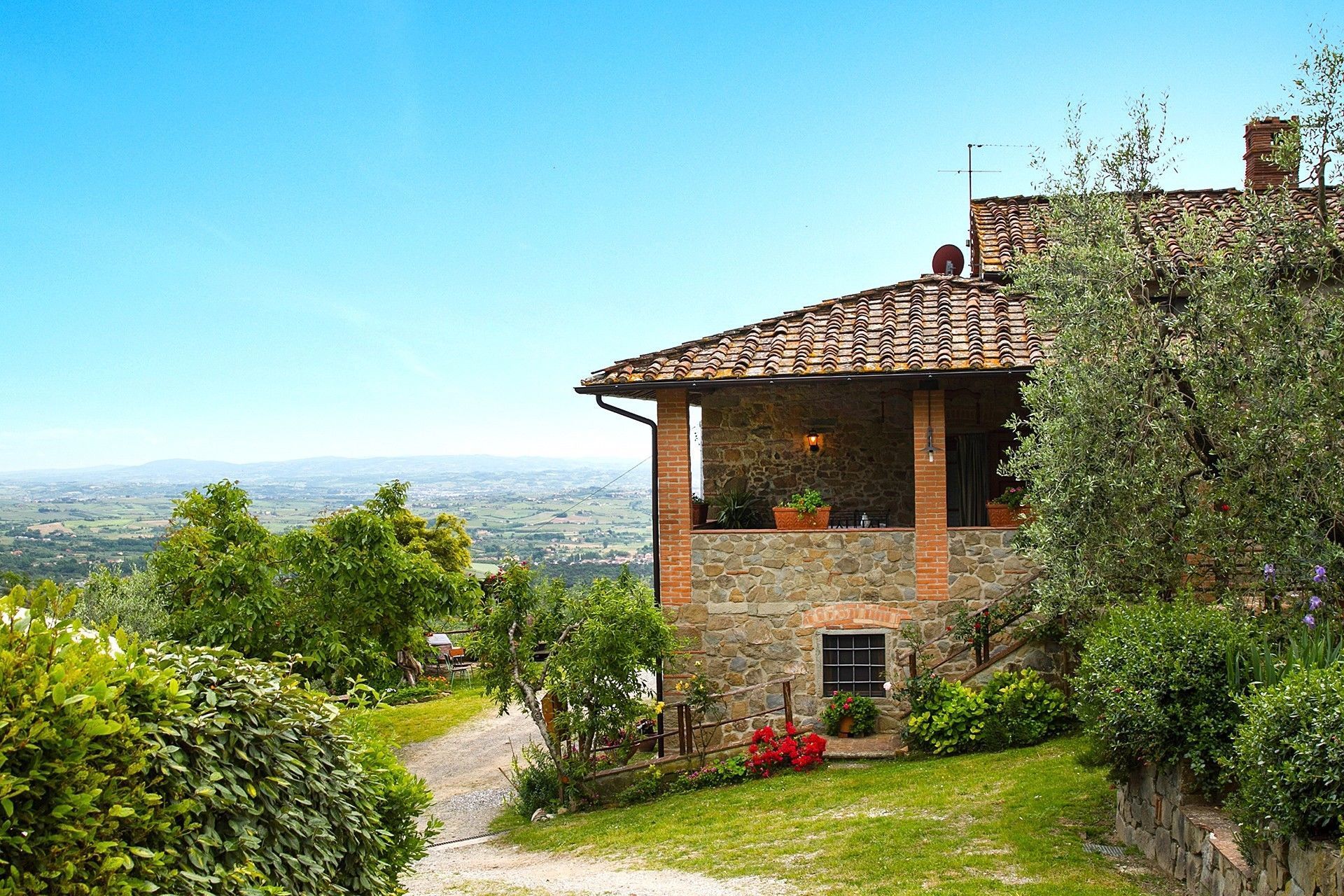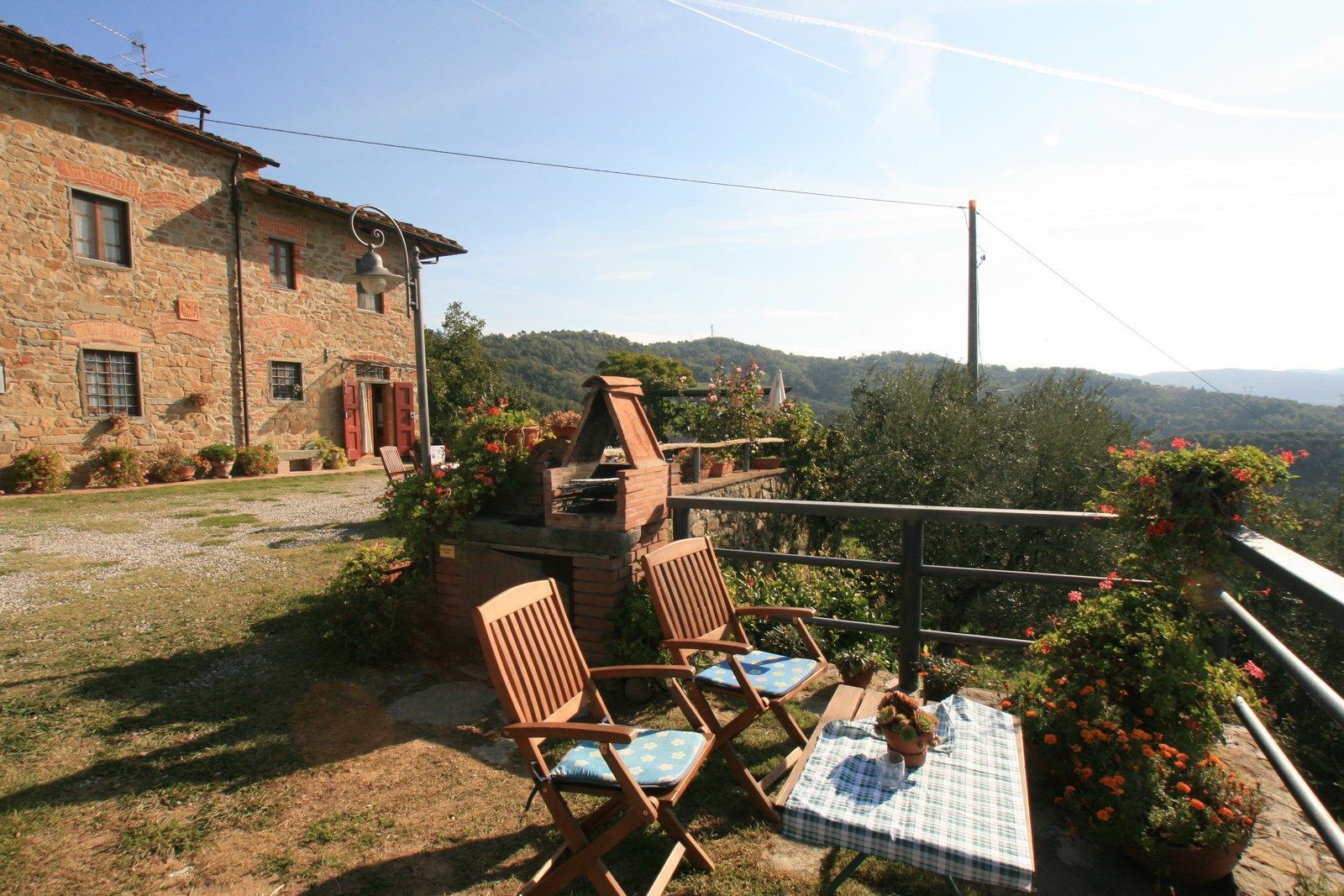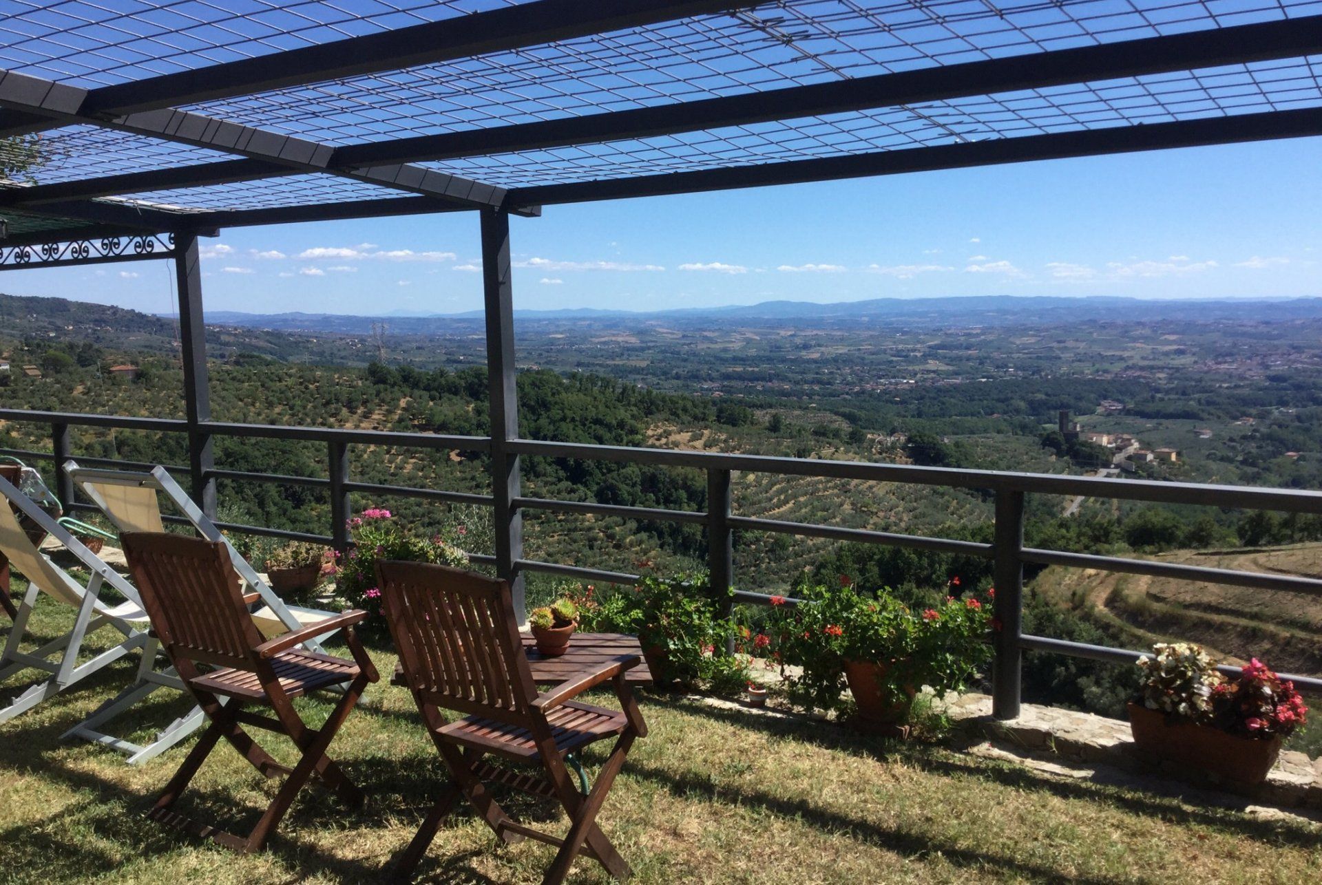 una camera matrimoniale con letto di ferro con bandone, una camera con letto matrimoniale, un bagno con cabina-doccia, una camera singola con un letto e accesso verso la veranda (terrazza coperta a travi con vista sulla piscina e con scale esterne in pietra serena verso il giardino e tavolo da pranzo) , una camera matrimoniale con letto in ferro battuto da cui si accede al secondo piano con scale in pietra serena.