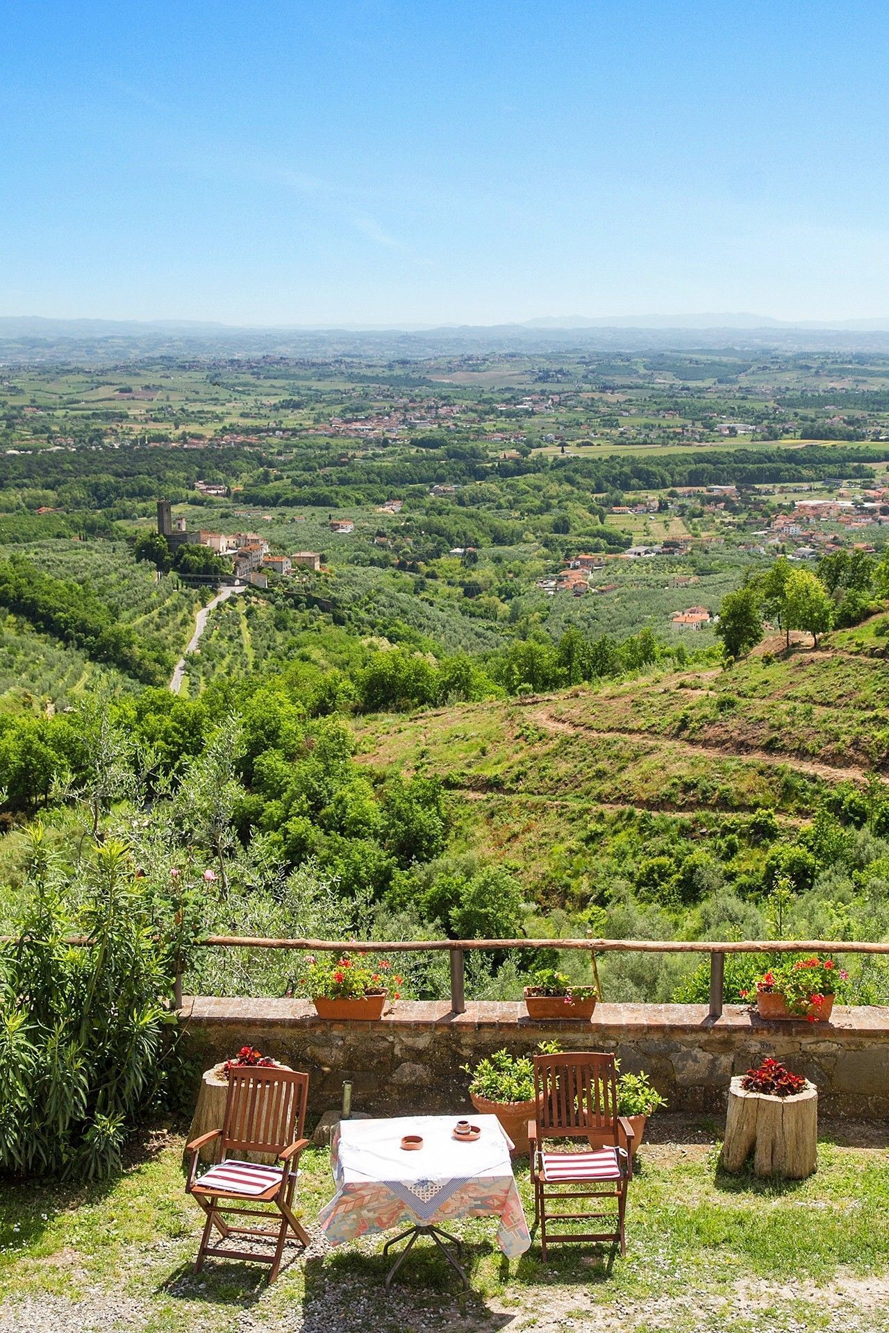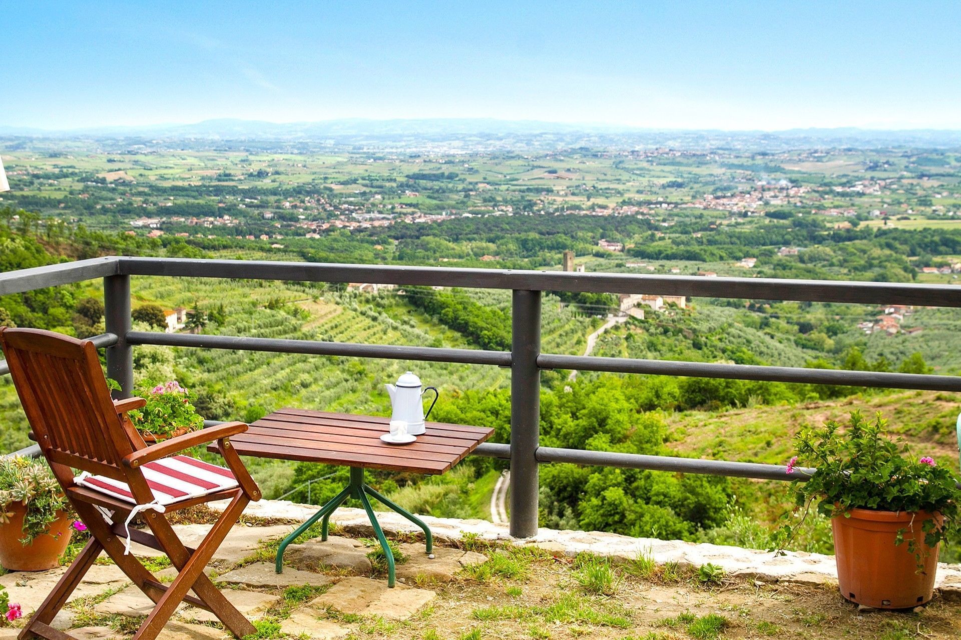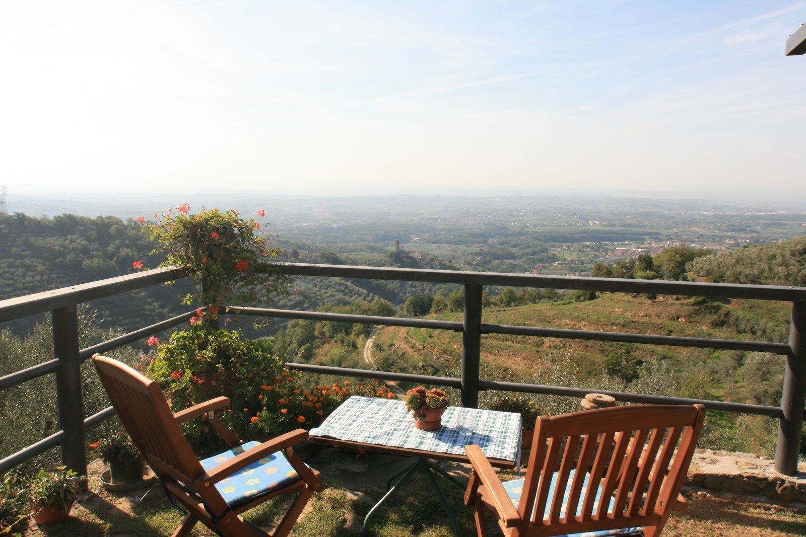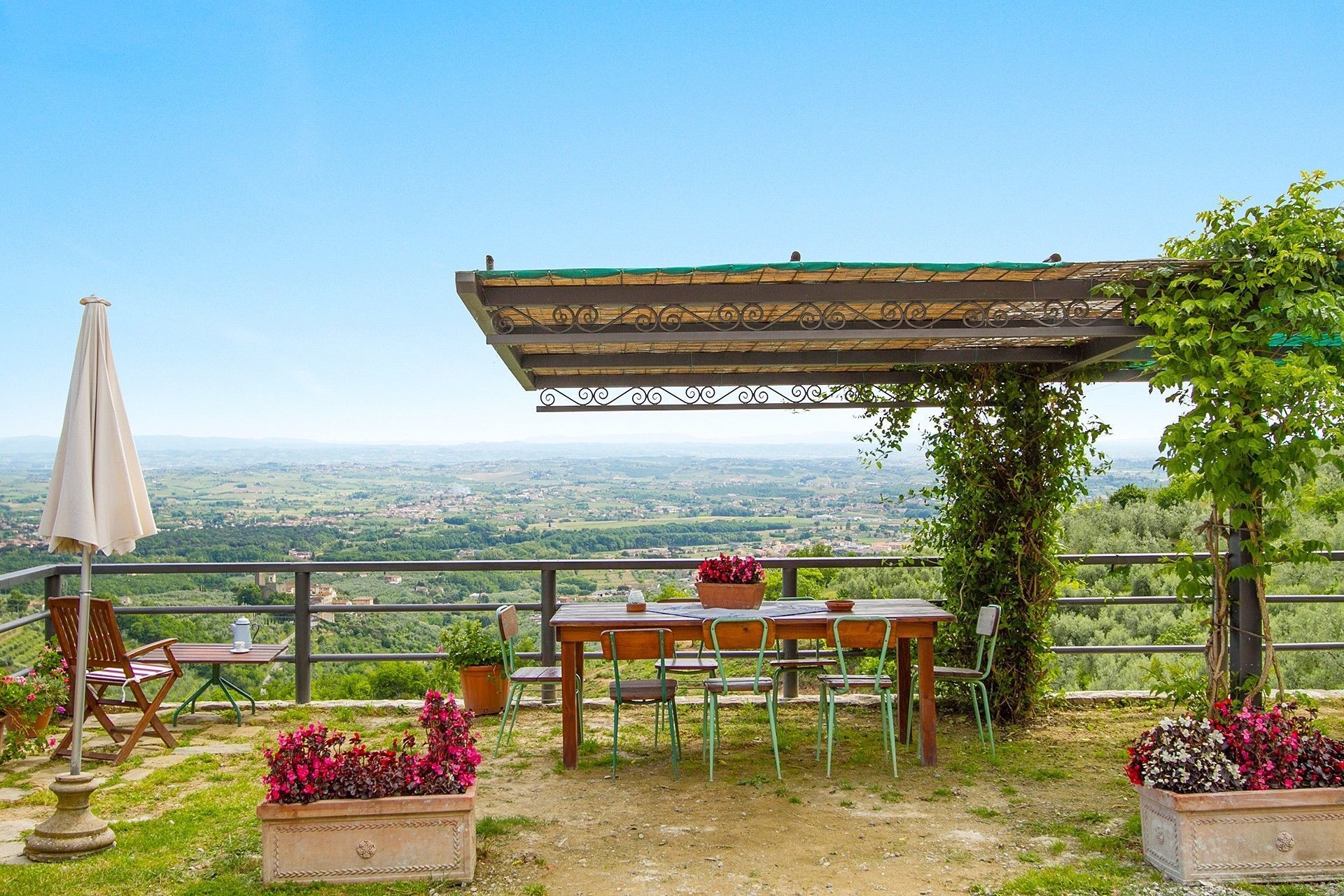 una camera matrimoniale con letto di ferro con bandone, una camera con letto matrimoniale, un bagno con cabina-doccia, una camera singola con un letto e accesso verso la veranda (terrazza coperta a travi con vista sulla piscina e con scale esterne in pietra serena verso il giardino e tavolo da pranzo) , una camera matrimoniale con letto in ferro battuto da cui si accede al secondo piano con scale in pietra serena.