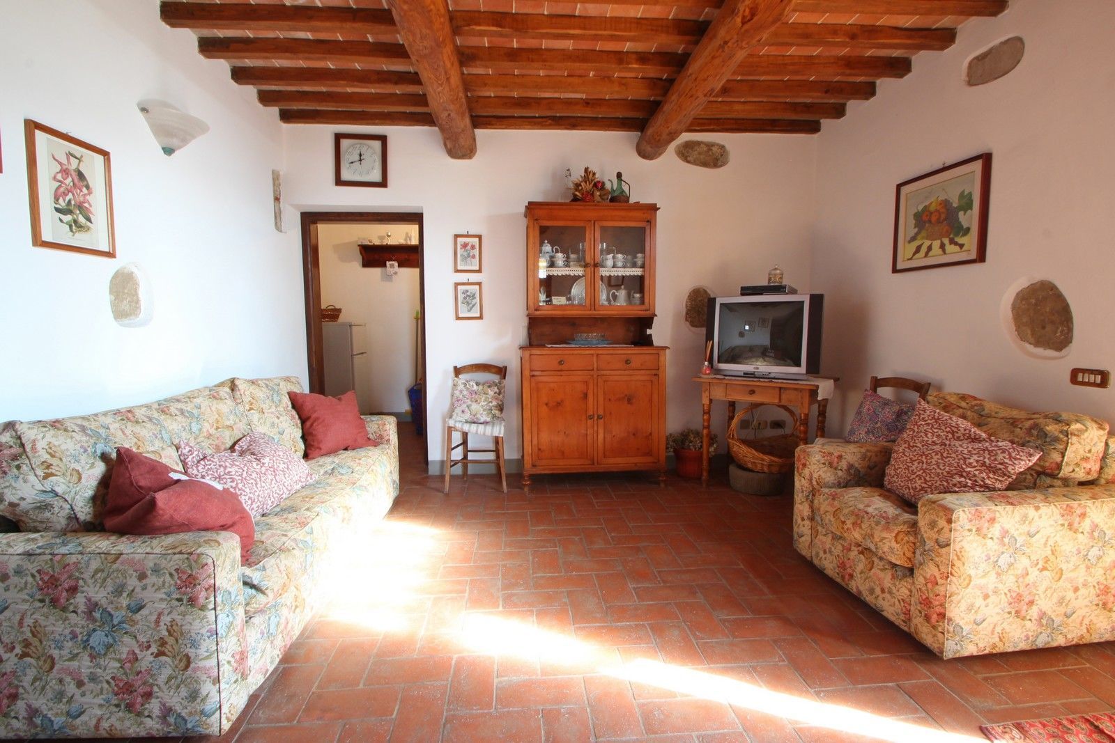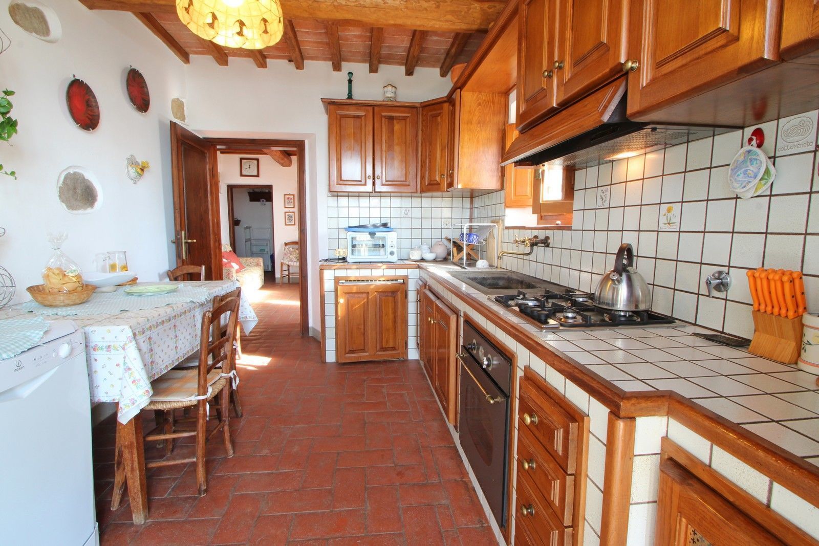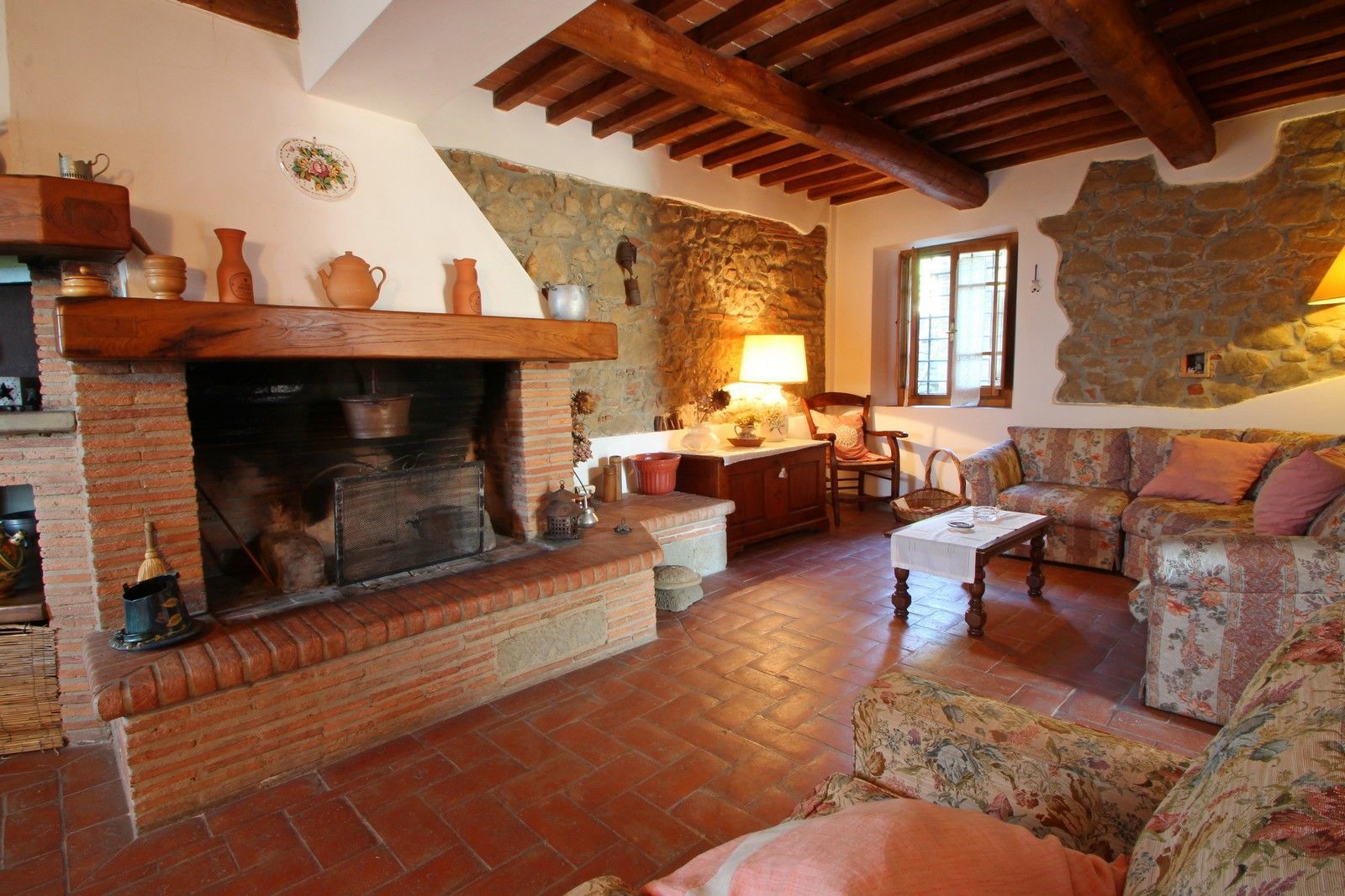 una cucina in muratura (un forno elettrico e quattro fuochi), un soggiorno-pranzo con ampio caminetto e forno a legna, un sottoscala, un salotto con divani, bagno con doccia; pavimenti in cotto toscano imprunetino fatto a mano e soffitti a travi in legno e mezzane.