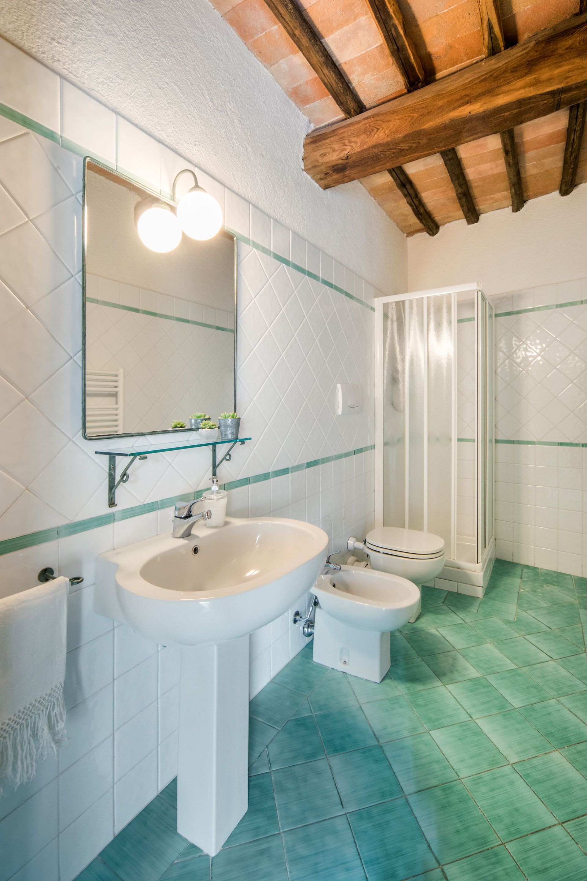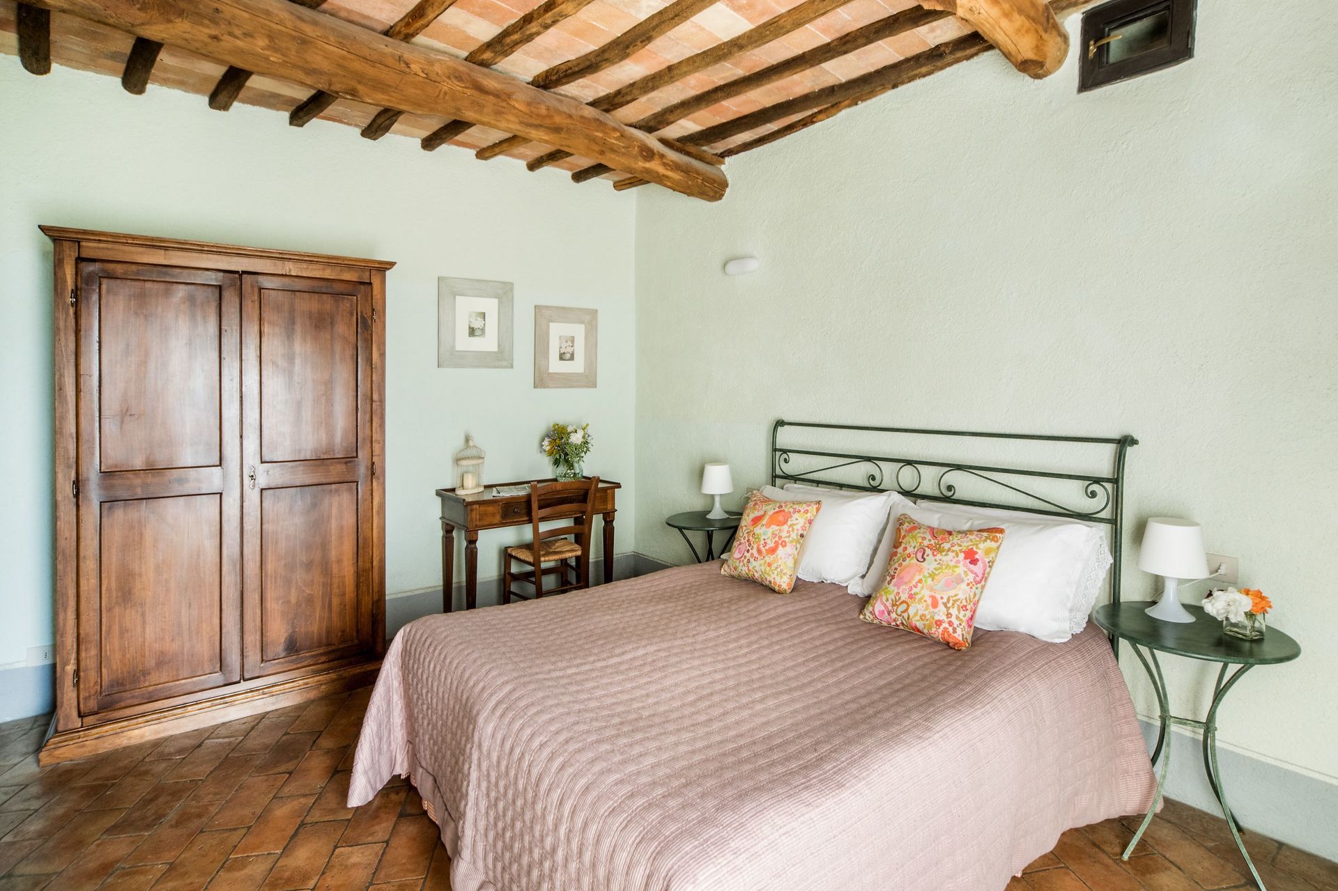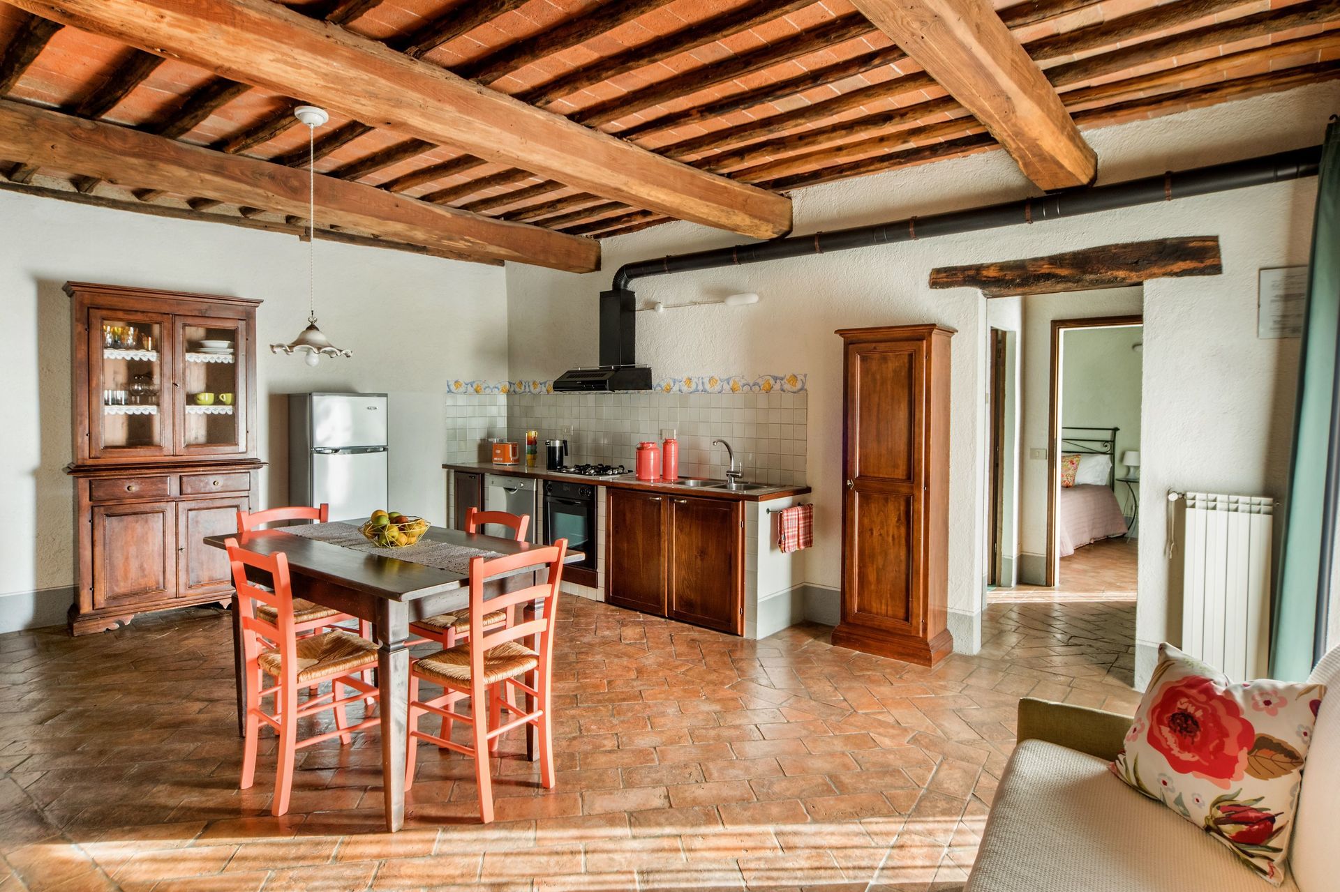 Interamente al piano terra, ha un ampio soggiorno con cucina, una camera matrimoniale e un bagno con doccia. Dal suggestivo terrazzo panoramico, attrezzato con tavolo, sedie, sdraio e un barbecue, potrete ammirare la magia della campagna toscana. Le travi a vista e il pavimento in cotto rendono l’atmosfera accogliente e richiamano lo stile rurale di questo ambiente adibito anticamente a frantoio.