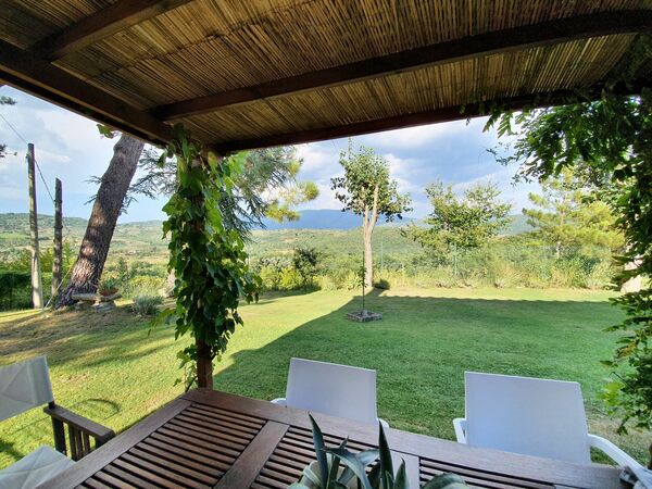 Spazi esterni, pergolato e piscina. Tutto intorno alla casa un ampio spazio completamente recintato (circa 1.500 mq) ed in parte ombreggiato da piante di alto fusto, dove sono stati realizzati una piscina (dim. 4 x 8 m., profondità 1,50 m.) ed un pergolato attrezzato con tavolo e sedie per mangiare all'aperto, il tutto riservato all’uso esclusivo degli ospiti.