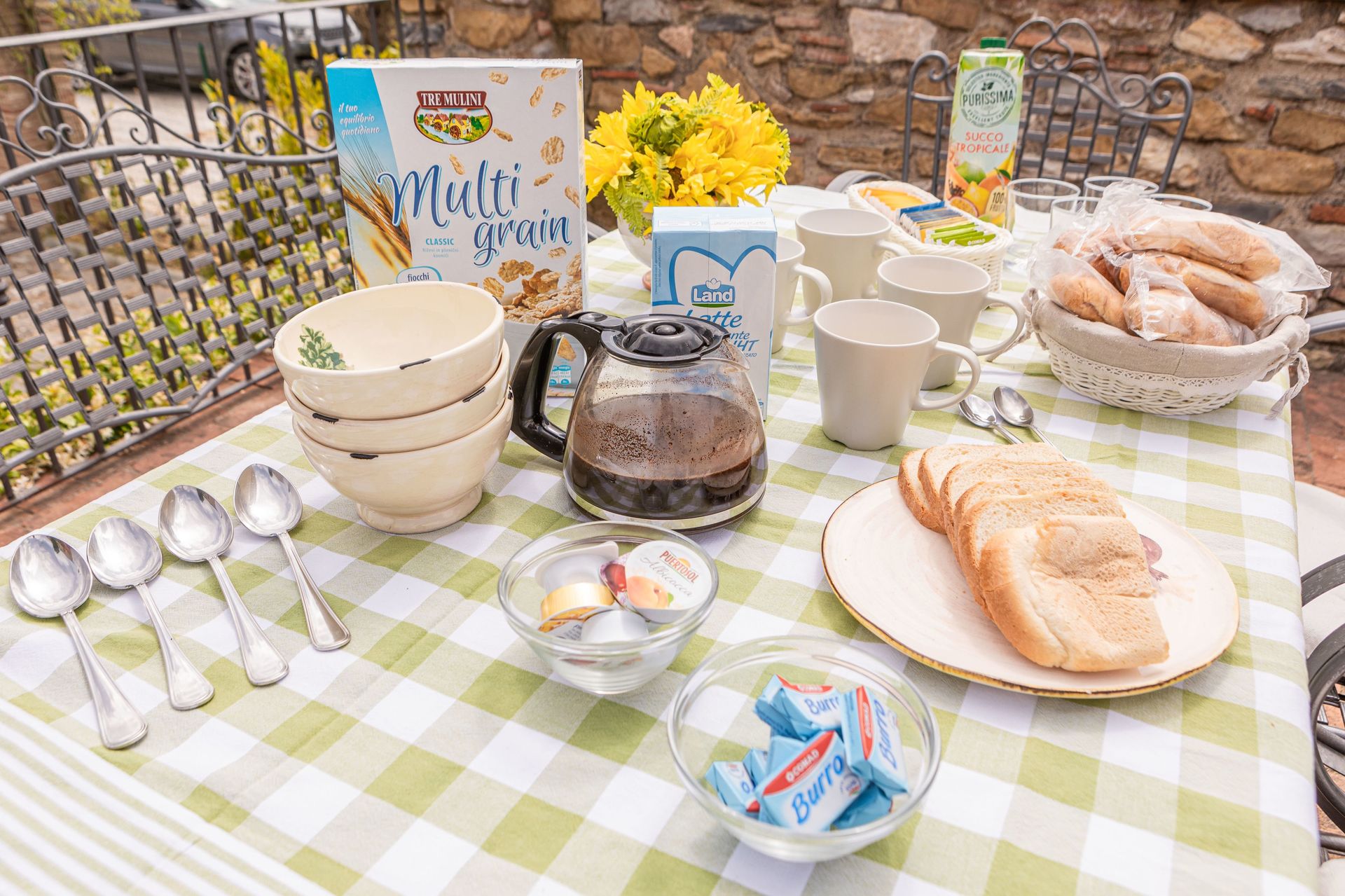 quanto necessario per colazione per la mattina successiva: toast, cornetti, marmellata, burro, miele, cereali, succo di frutta, caffè, tè, latte e zucchero
