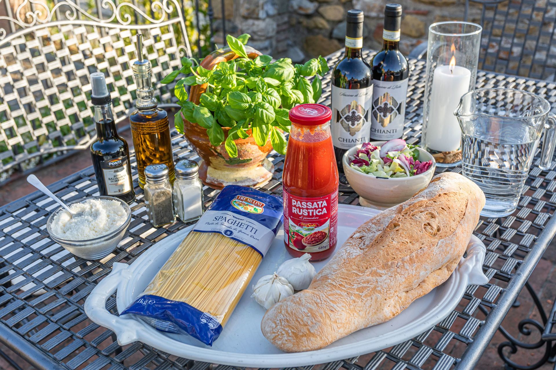 quanto necessario per cena la sera dell'arrivo: pasta fatta in casa, parmigiano, pane e insalata, vino Chianti e acqua