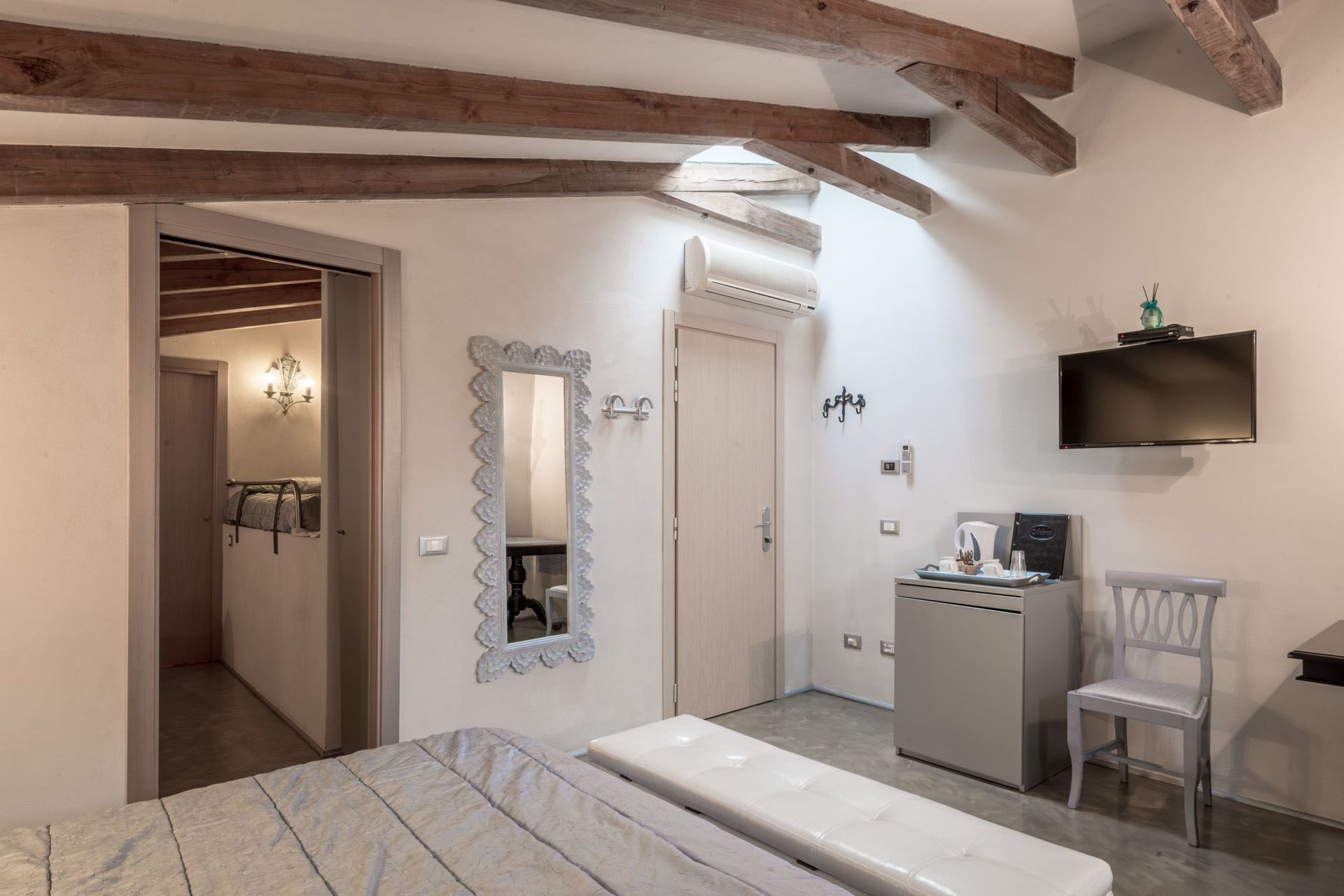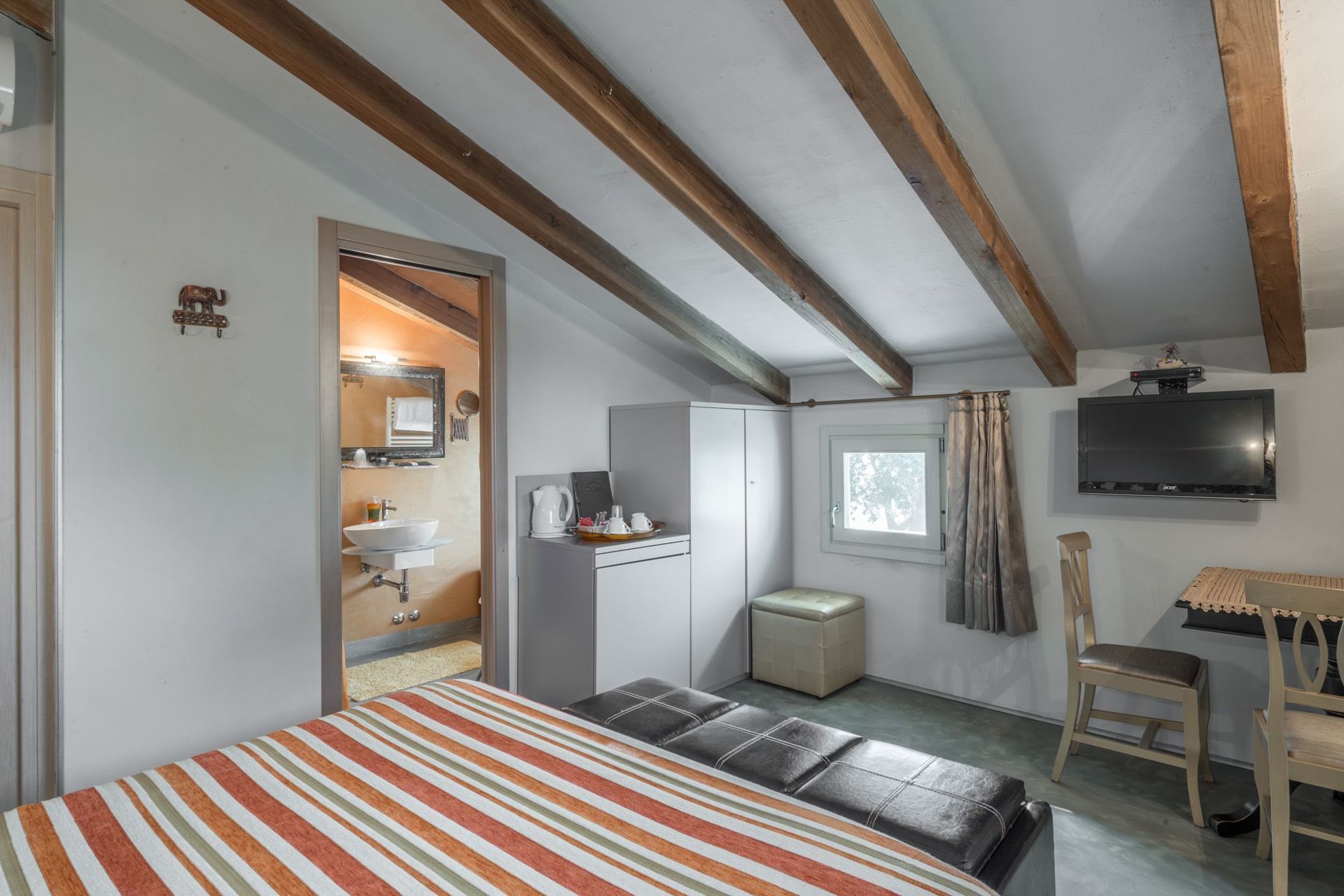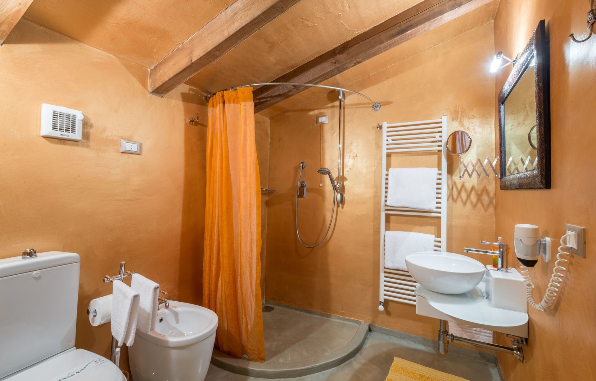 Camera da letto con bagno 2: letto matrimoniale, internet WIFI, aria condizionata, lavandino, wc, bidet, doccia, asciugacapelli.