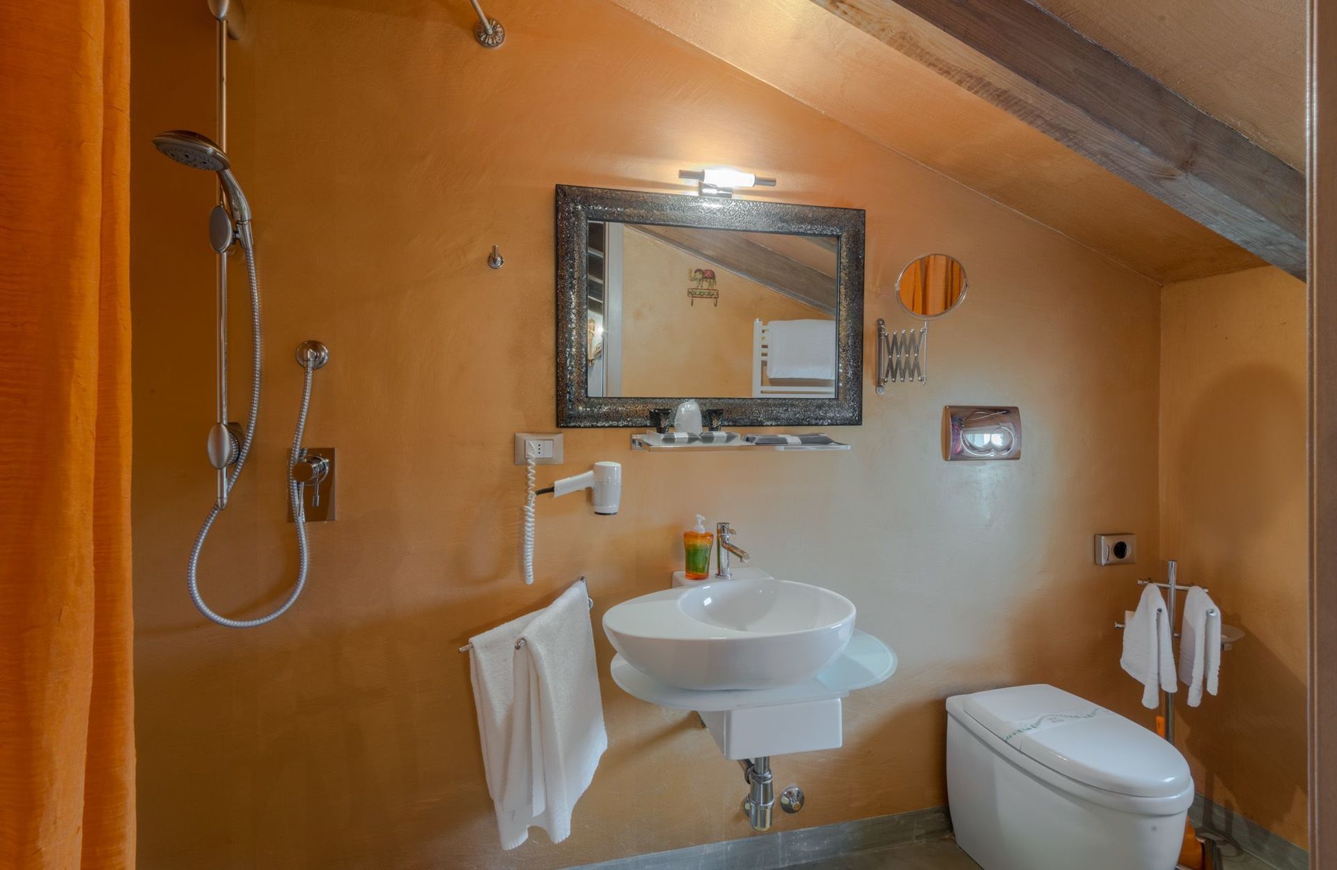 Camera da letto con bagno 2: letto matrimoniale, internet WIFI, aria condizionata, lavandino, bidet, doccia, asciugacapelli.