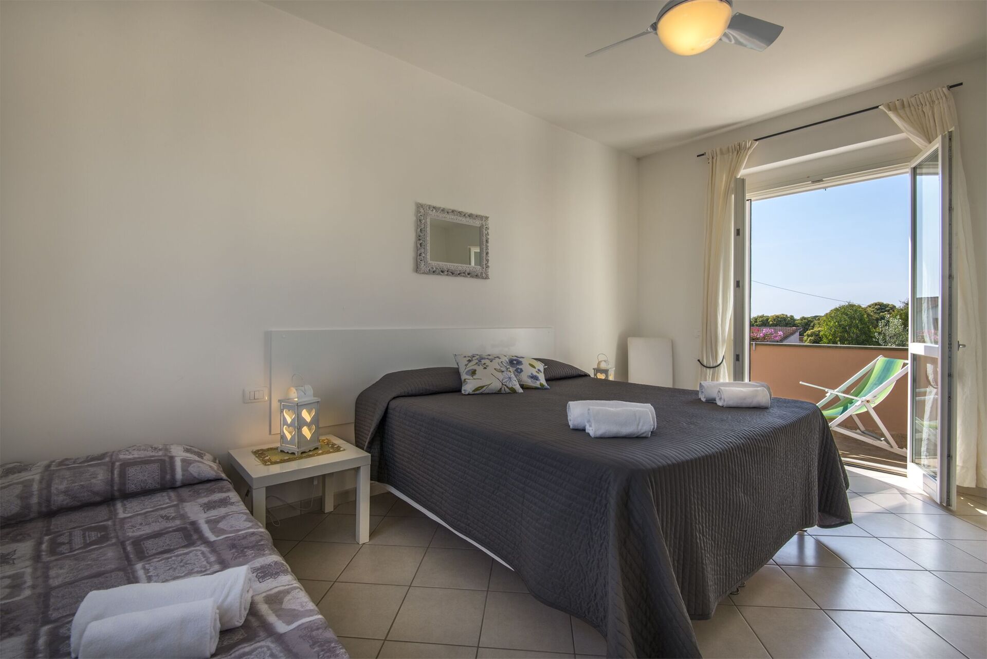 Camera da letto con bagno 4: letto matrimoniale, letto singolo, aria condizionata, zanzariere, tv satellitare, ventilatore a soffitto, lavandino, wc, bidet, doccia, uscita sulla terrazza.
