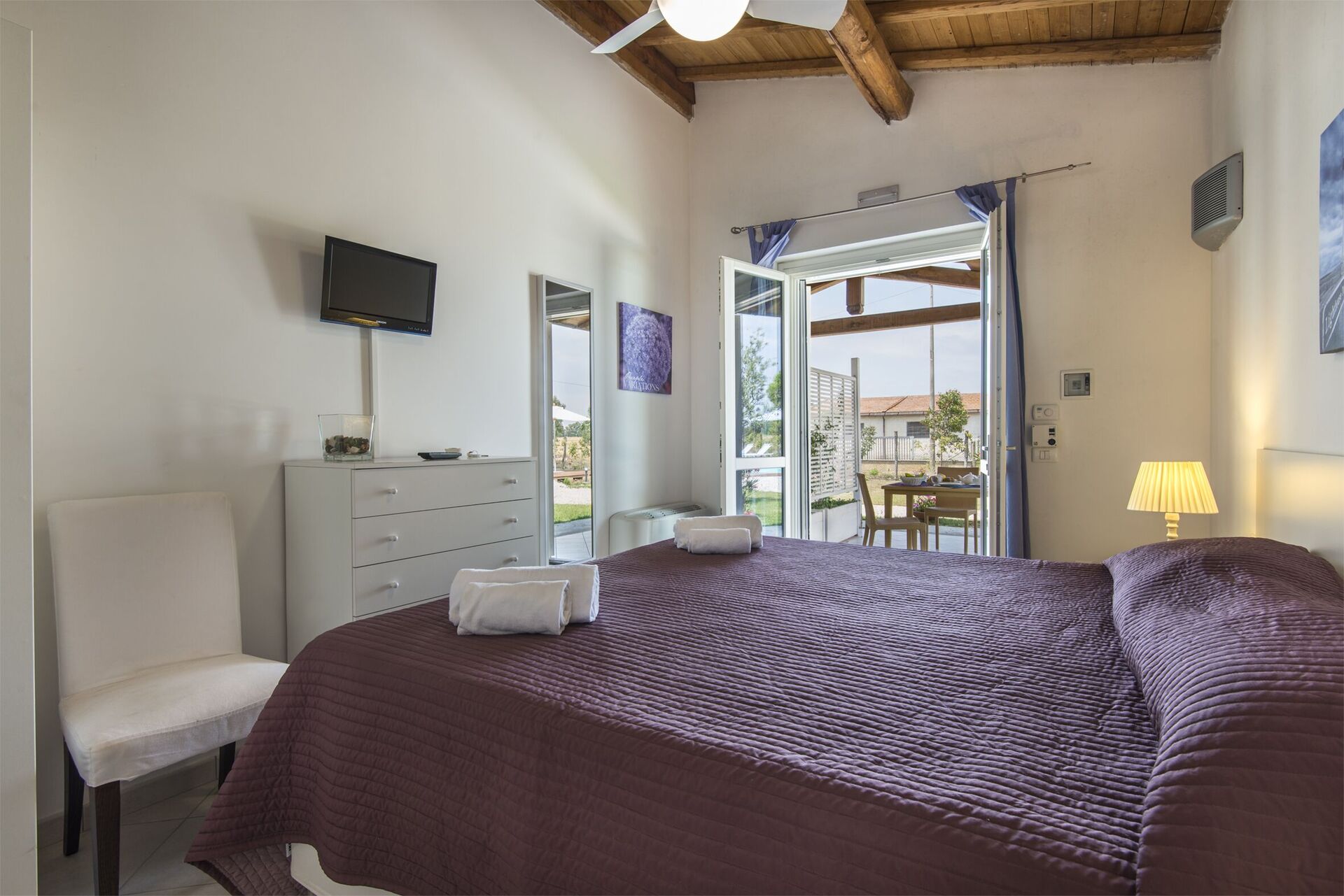 Camera da letto con bagno 7: letto matrimoniale, aria condizionata, zanzariere, tv satellitare, ventilatore a soffitto, divano, frigo, lavandino, wc, bidet, doccia, uscita sul giardino.