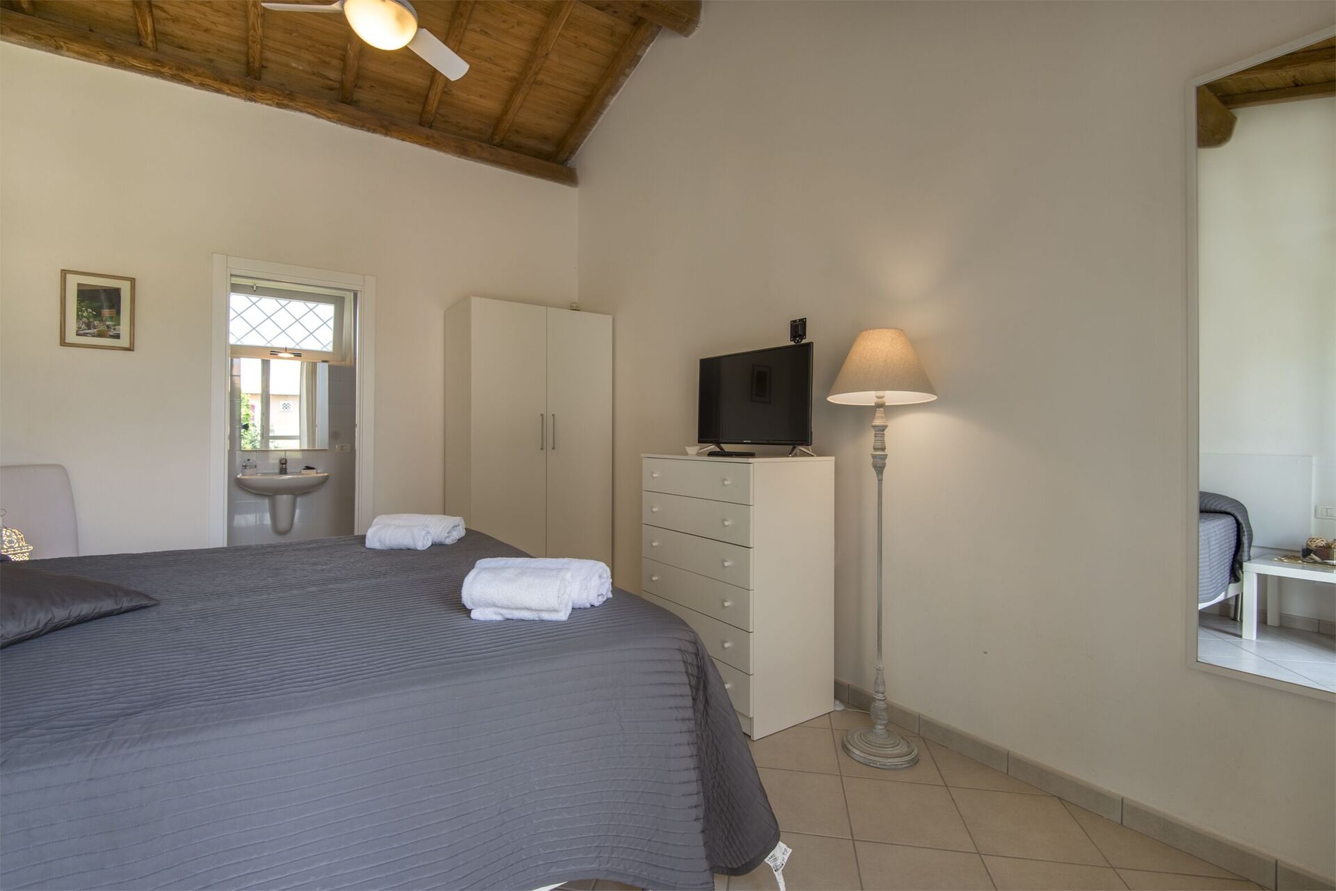 Camera da letto con bagno 5: letto matrimoniale, aria condizionata, zanzariere, tv satellitare, ventilatore a soffitto, lavandino, wc, bidet, doccia, uscita sul giardino.