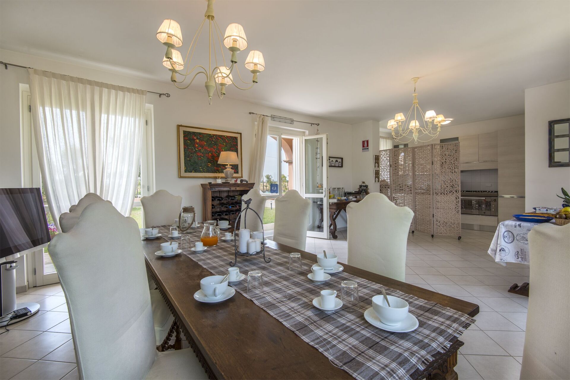 Cucina - soggiorno: cucina ben attrezzata, tavolo da pranzo (persone: 26), frigo, freezer, forno, caminetto, aria condizionata, tv satellitare, uscita sul giardino.