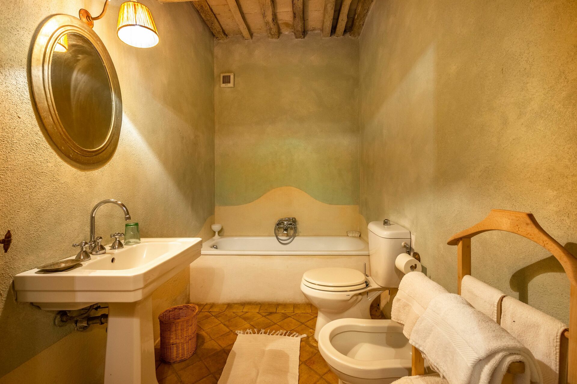 Bagno: lavandino, wc, bidet, vasca da bagno, asciugacapelli.