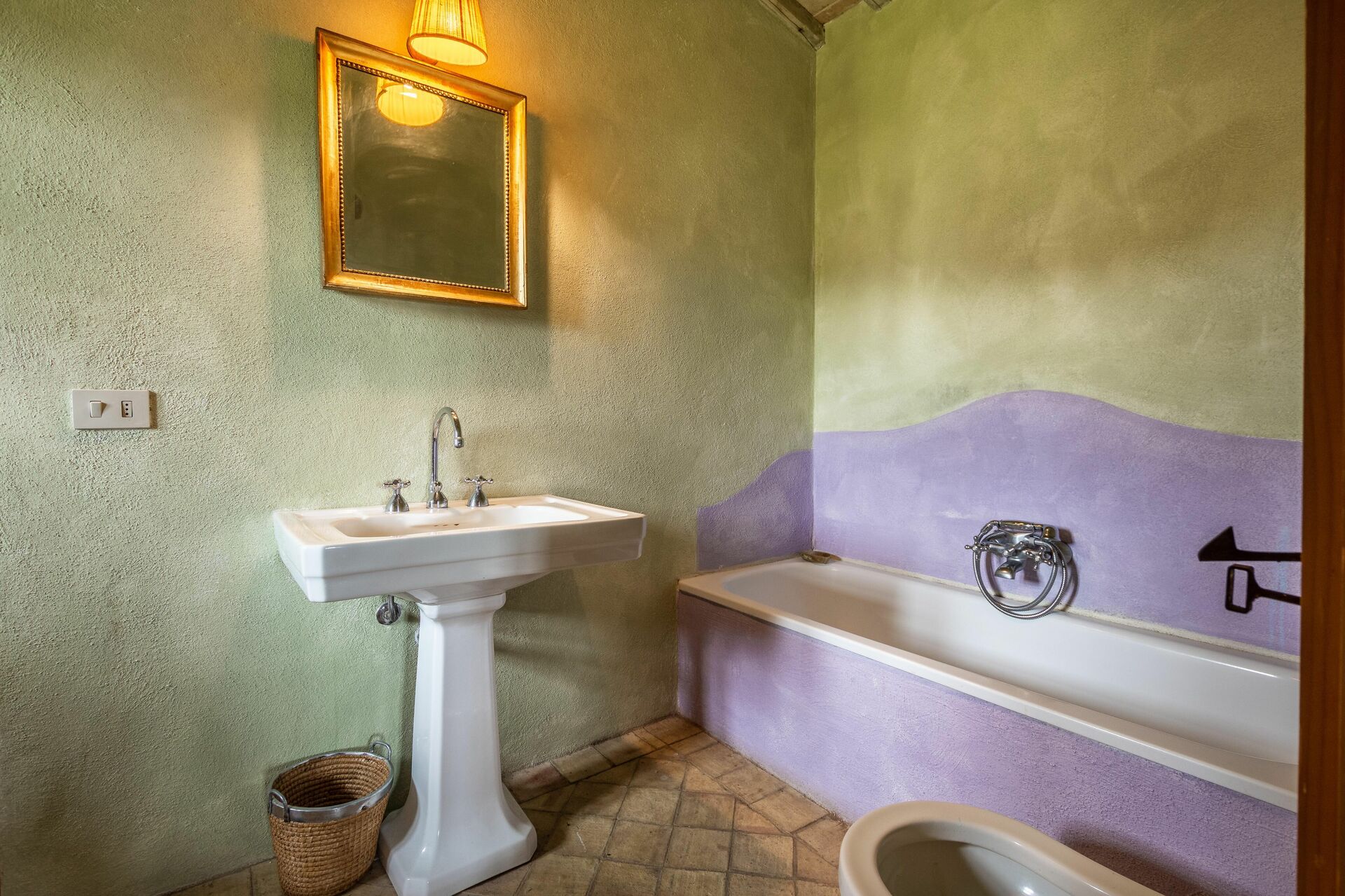 Camera da letto con bagno 2: letto matrimoniale, internet WIFI, aria condizionata, lavandino, wc, bidet, vasca da bagno.