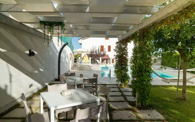 La proprietà offre ampi spazi esterni, tra cui un'area recintata di 1.500 m2 con un giardino e un cortile ben curati, perfetti per godersi il sole italiano. Rilassatevi accanto alla piscina recintata, di 12 x 6 m con una profondità che varia da 100 a 190 cm, dotata di un sistema di pulizia a elettrolisi salina per una nuotata rinfrescante durante la disponibilità stagionale dal 1° maggio al 30 ottobre. Una doccia esterna aggiunge comodità.