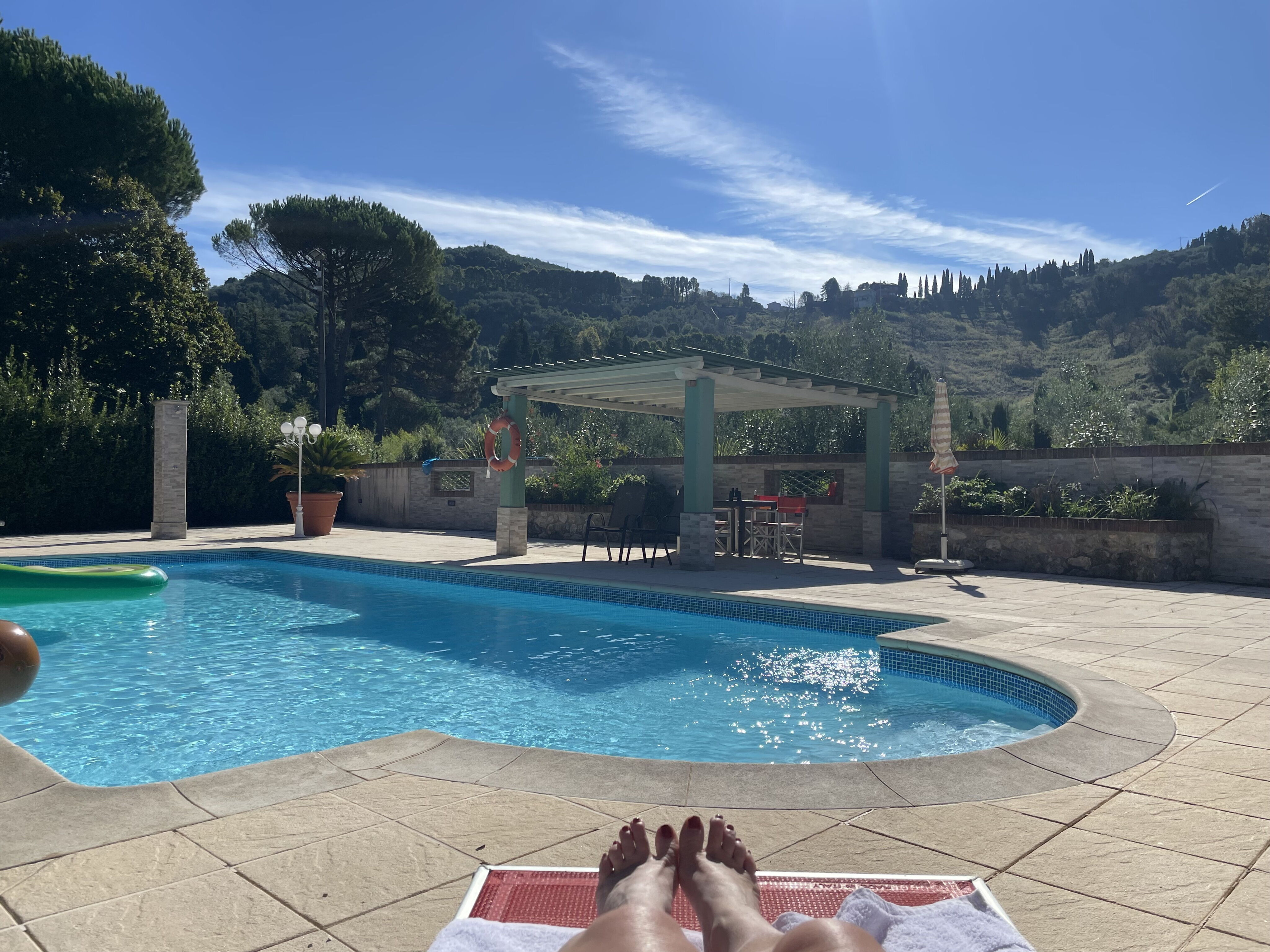 La piscina privata misura 10 x 5 metri con profondità da 120 a 150 cm ed è disponibile dal 6 maggio al 30 settembre. L'area piscina è dotata di un WC dedicato e di una doccia esterna. Una casetta in piscina è presente in loco, con una stufa da cucina e un tavolo da ping pong per attività ricreative e intrattenimento. La terrazza offre uno spazio piacevole per i pasti all'aperto. Il giardino privato, con la sua area naturalistica, il prato aperto e gli alberi ad alto fusto, crea un ambiente esterno armonioso e rigenerante. La manutenzione della piscina è svolta regolarmente dal proprietario e dal giardiniere.