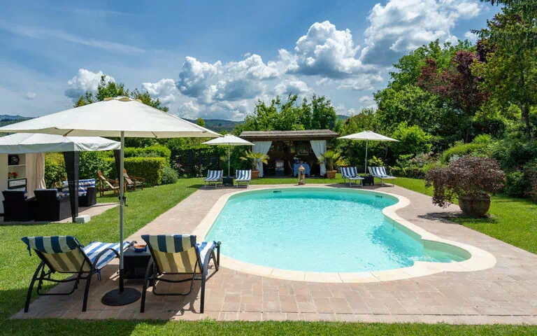 Gli spazi esterni si estendono su 10.000 m2 di terreno recintato. L'orto terrazzato comprende aree prative, alberi maturi e un frutteto produttivo, offrendo ampio spazio per rilassarsi e passeggiare in completa privacy. Una piscina a forma di rene misura 10 x 5 metri ed è disponibile dal 1° maggio al 30 settembre; accanto alla piscina si trova una casetta attrezzata con frigorifero, doccia esterna e mobili da patio. Lo spazio circostante consente di cenare all'aperto, riposare in riva all'acqua o passeggiare tra gli alberi da frutto.