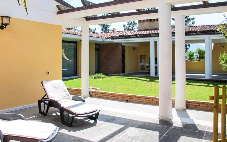 L'appartamento è un ampio appartamento di vacanza di 3 stanze situato al piano rialzato, con un'area totale di 120 metri quadrati. Dispone di un soggiorno/sala da pranzo arredato con gusto con un camino a focolare aperto (solo a scopo decorativo), un tavolo da pranzo e TV satellitare. Il soggiorno fornisce un accesso diretto al giardino, permettendoti di godere del bellissimo ambiente circostante. Ci sono due camere da letto, ciascuna dotata di un letto matrimoniale e un'uscita sul giardino. La cucina ben attrezzata dispone di un forno, lavastoviglie, 4 fuochi a gas, tostapane, bollitore, microonde, congelatore e una macchina elettrica per il caffè, oltre a un tavolo da pranzo e un'uscita sulla terrazza. L'appartamento dispone anche di una doccia/WC e un WC separato.