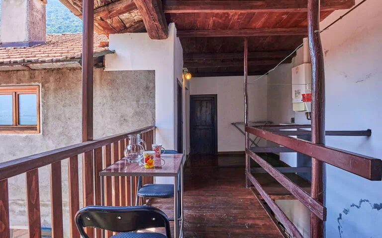 L'appartamento si estende su 55 m² distribuiti su un unico livello al secondo piano e accoglie fino a 4 ospiti in 1 camera da letto e 1 bagno. La zona giorno e notte è caratterizzata da un camino a focolare aperto a scopo puramente decorativo e da un'area letto, con accesso diretto al balcone. La camera da letto è arredata con 1 letto singolo e 1 letto matrimoniale e si affaccia anch'essa sul balcone. La cucina a vista è completamente attrezzata e si integra con tavolo e angolo pranzo. Il bagno è dotato di vasca e WC. I pavimenti in pietra naturale caratterizzano l'intera unità. Un piccolo balcone arredato con mobili da esterno completa la configurazione.