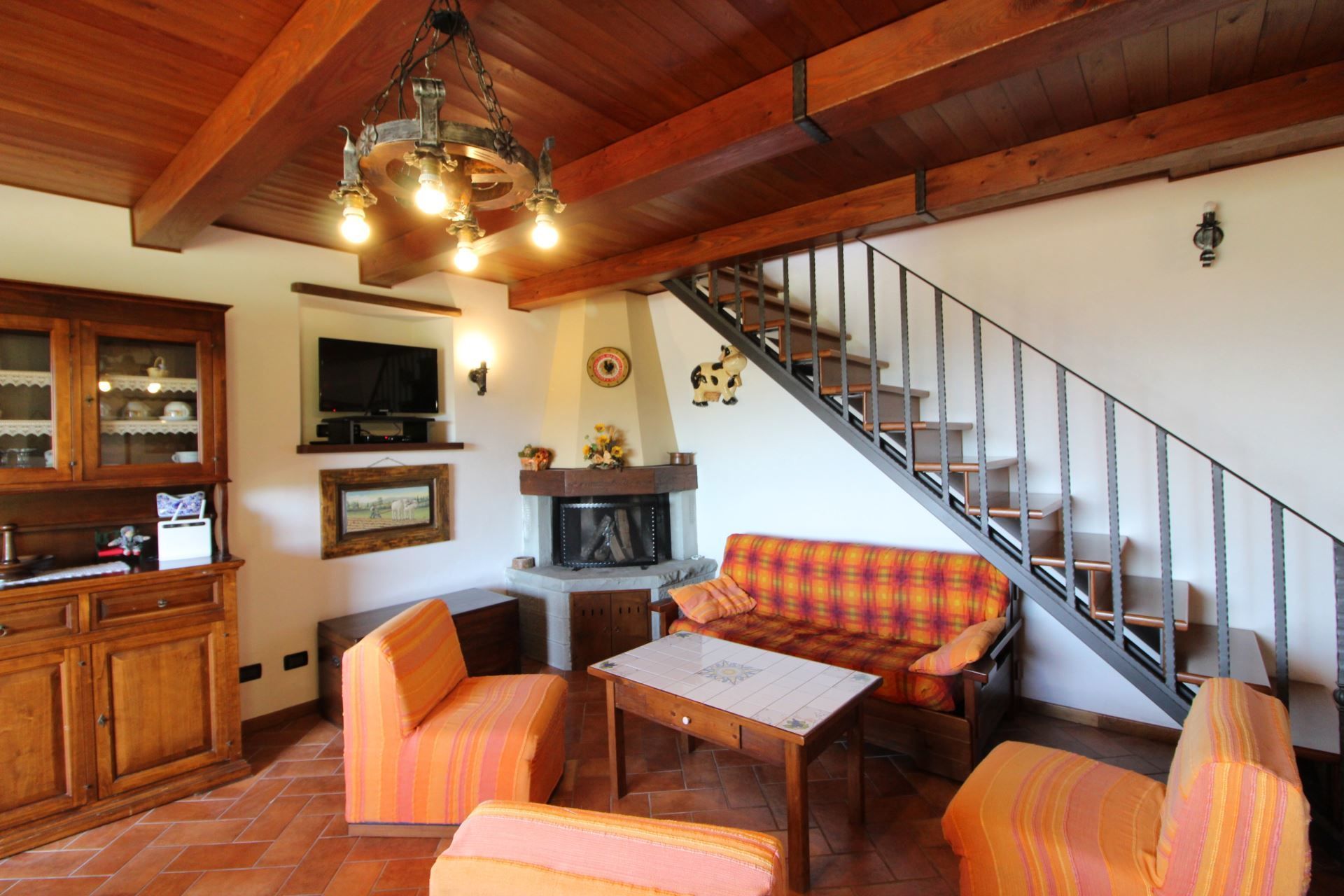 PIANO TERRA: Ingresso su ampio e luminoso soggiorno-pranzo con splendida vista sulla vallata del Casentino, con camino e divano letto matrimoniale, cucinotto, bagno con doccia. Dal soggiorno uscita su ampio terrazzo coperto e panoramico equipaggiato per mangiare fuori. Garage con lavatrice.