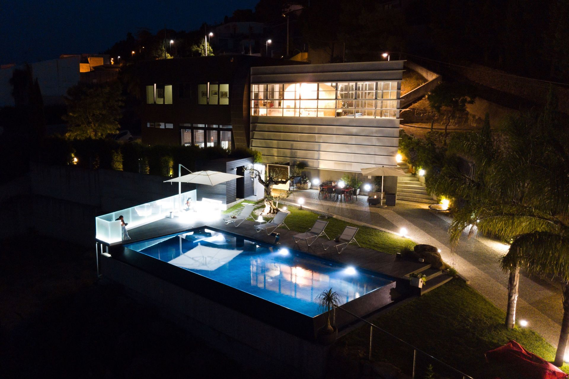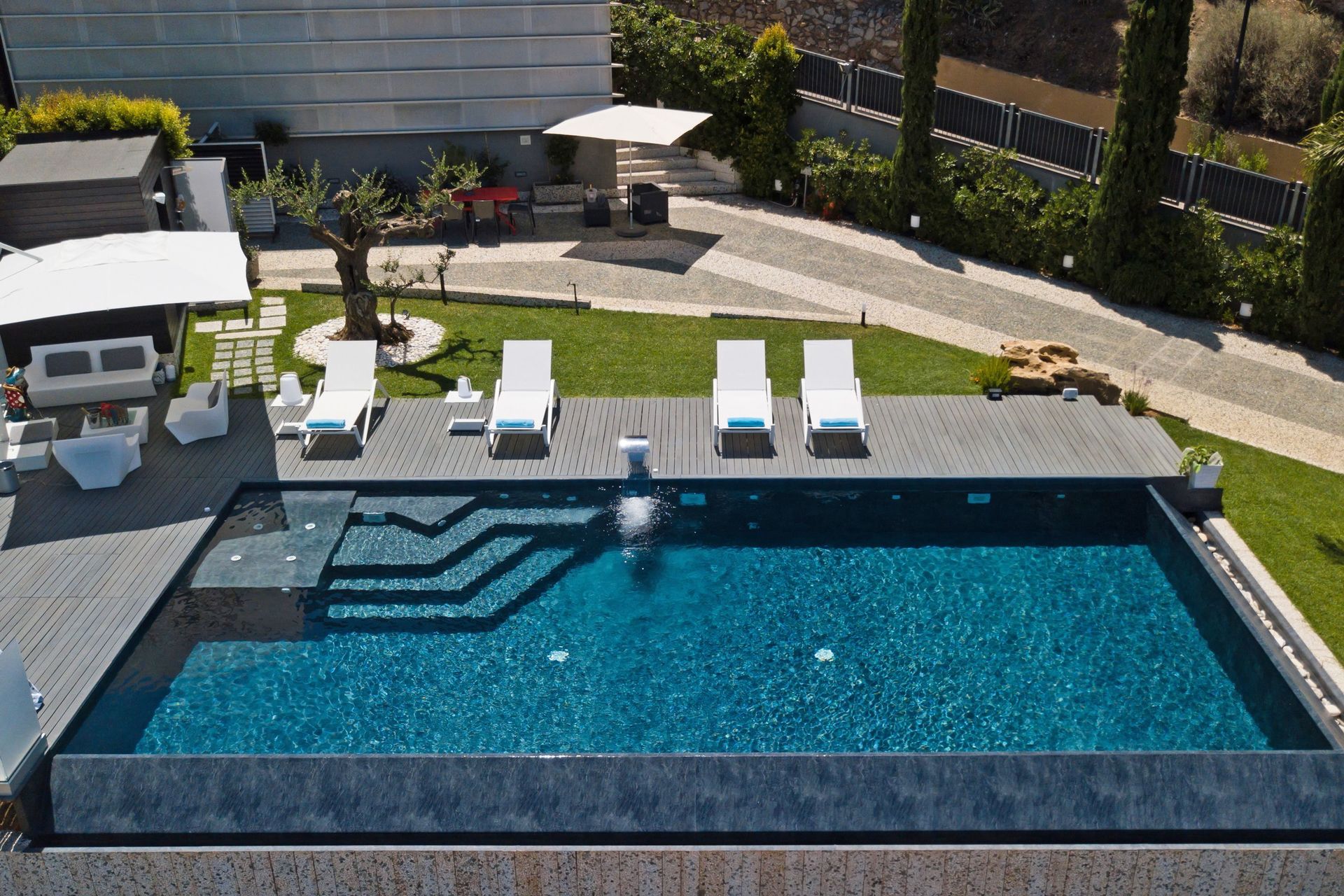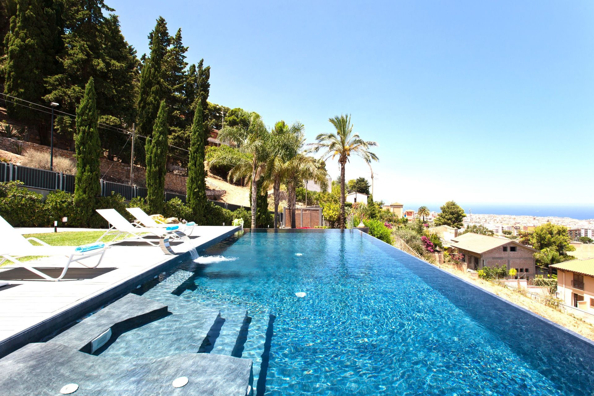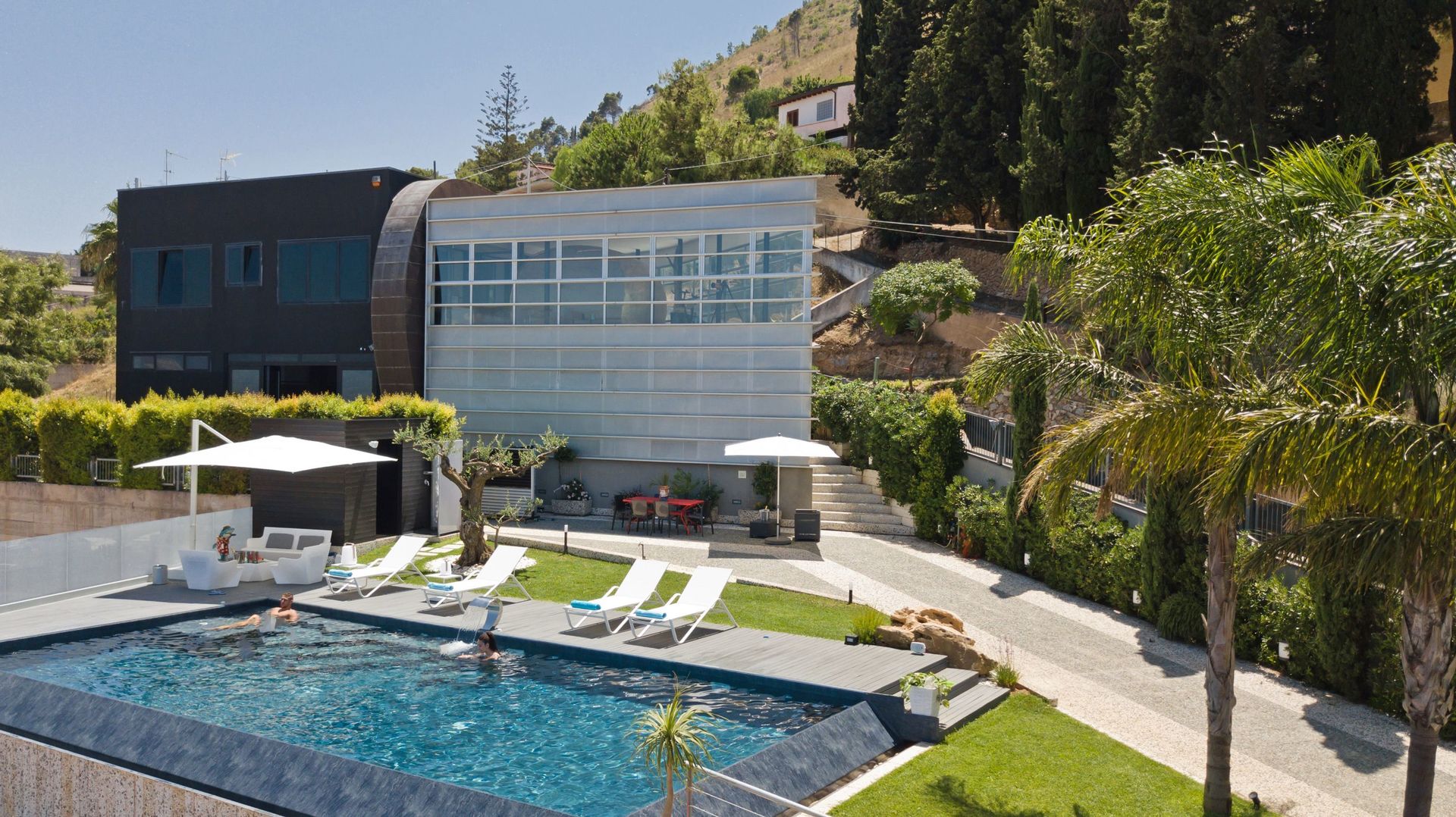 A disposizione degli ospiti: giardino ben curato e recintato, piscina panoramica con bordo a sfioro (11 x 5 metri; profondità massima: 1,40 metri), zona idromassaggio e cascata d'acqua, parcheggio nella proprietà (recintata), spazio esterno attrezzato con barbecue e tavolo con sedie per mangiare all'aperto, tavolo da calcio balilla.