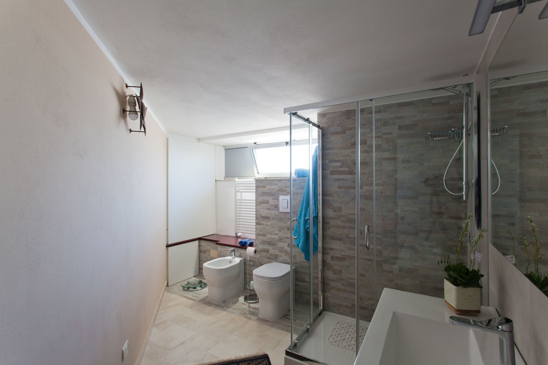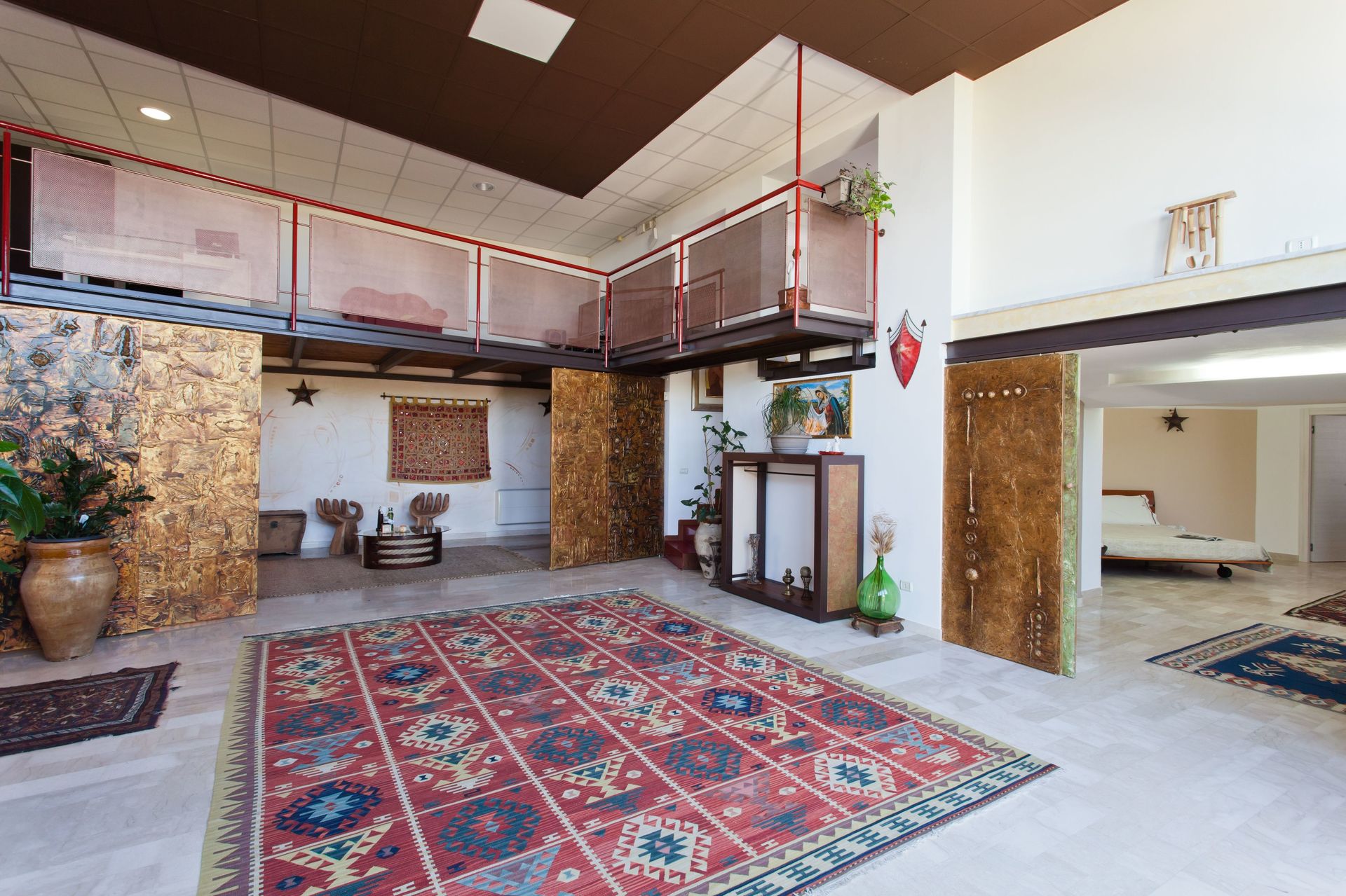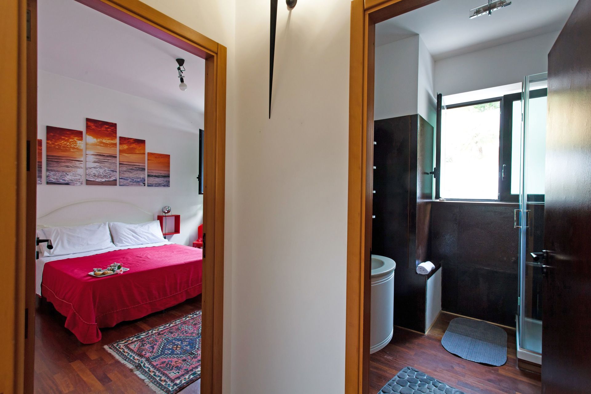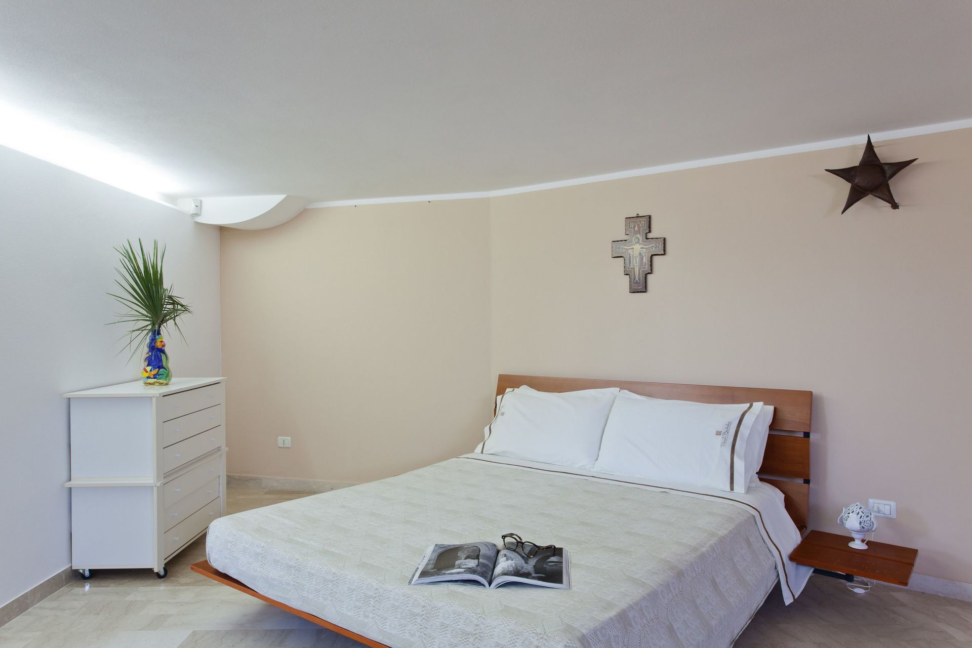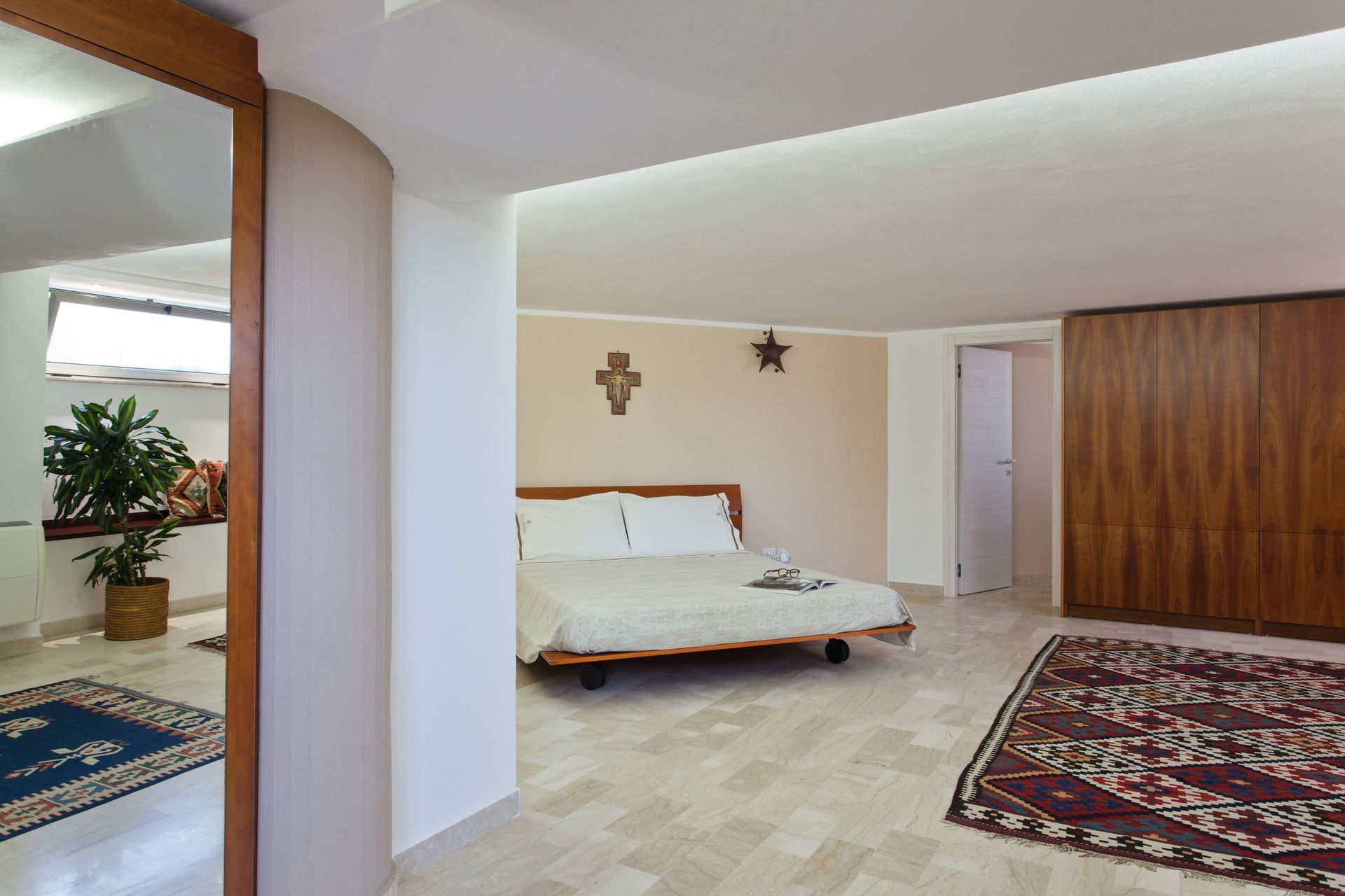 Soppalco (aperto sulla zona sottostante e dotato di 2 split per l'aria condizionata): letto matrimoniale e letto alla francese (divisi da un separè costituito da armadiature), bagno con doccia.