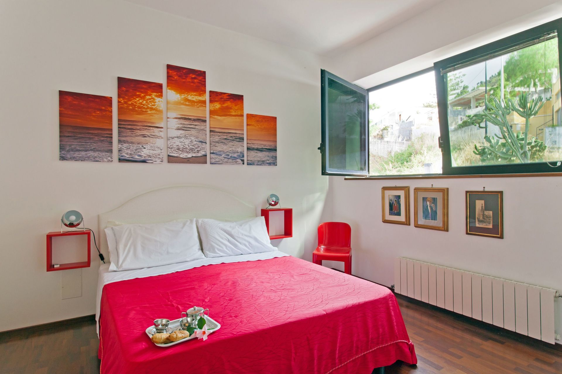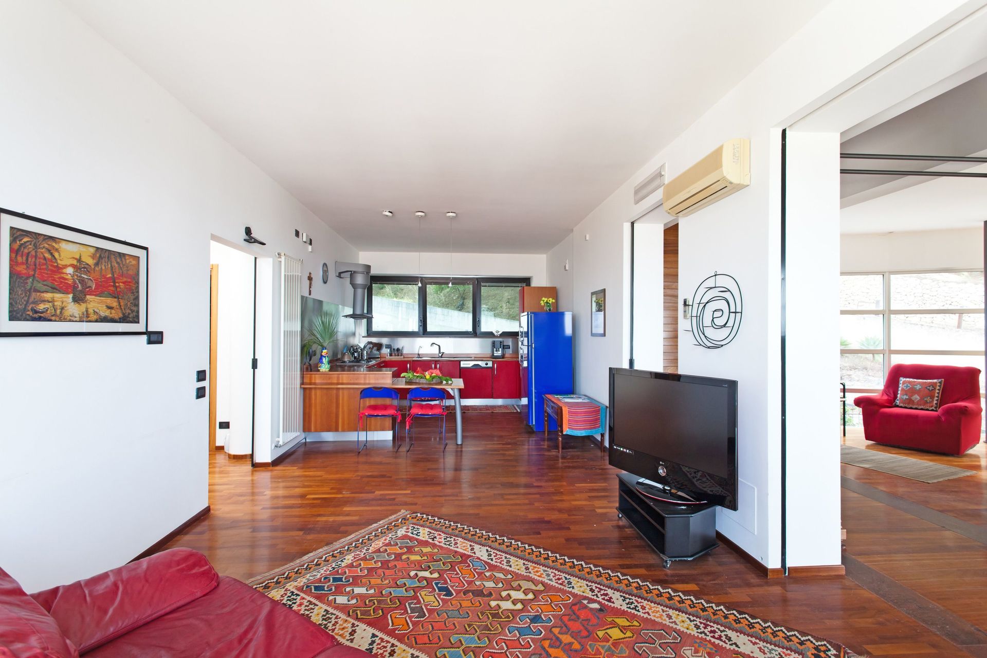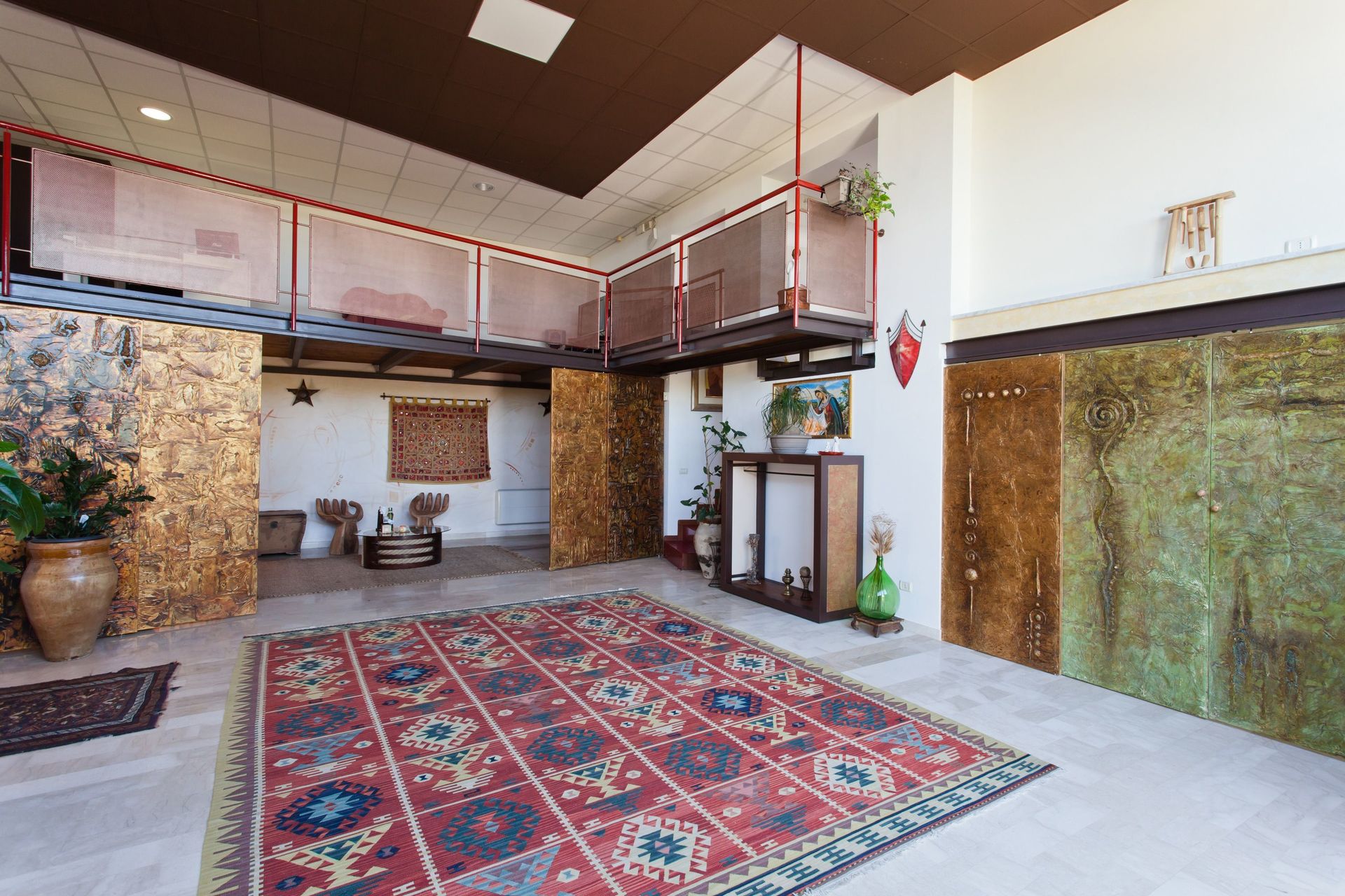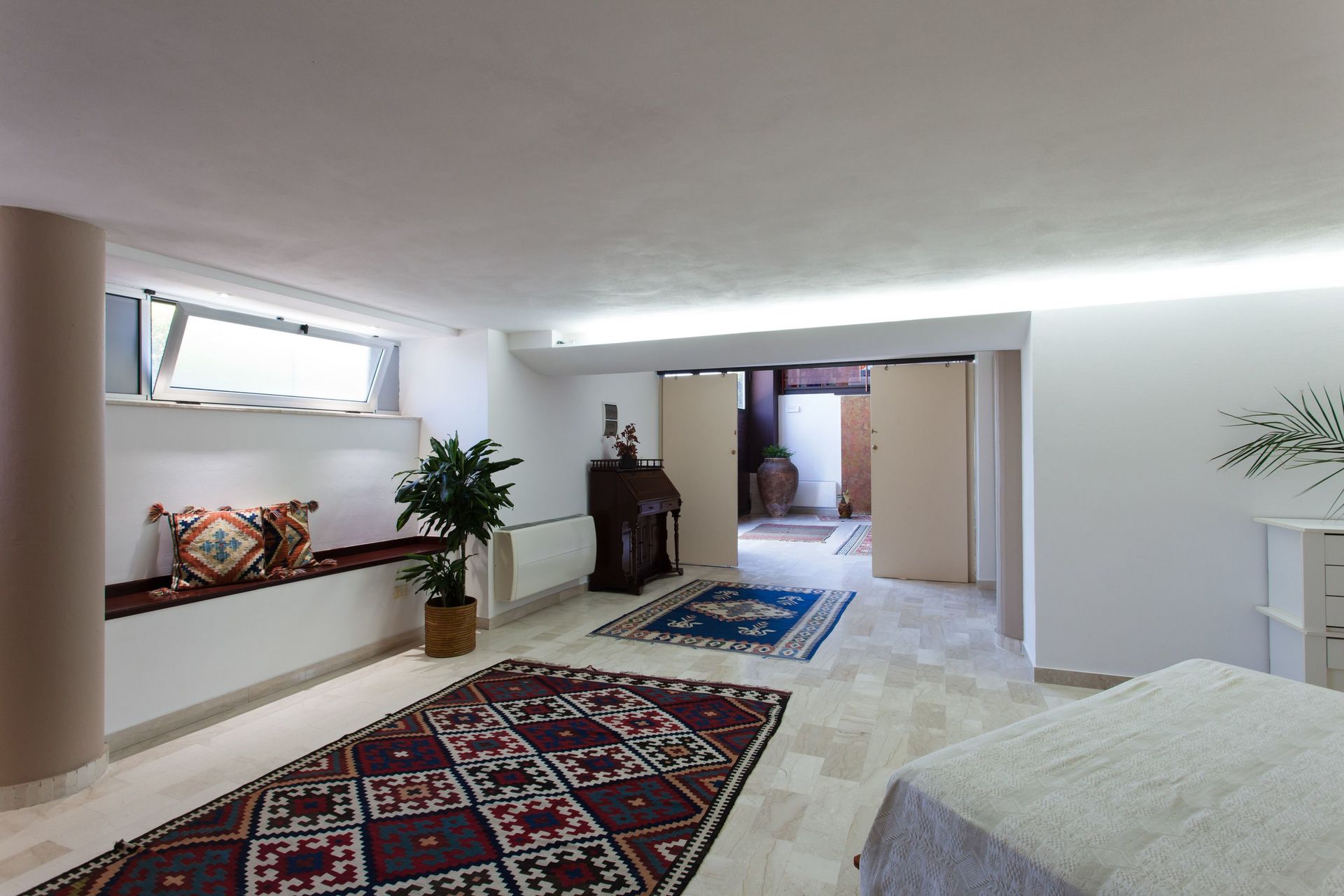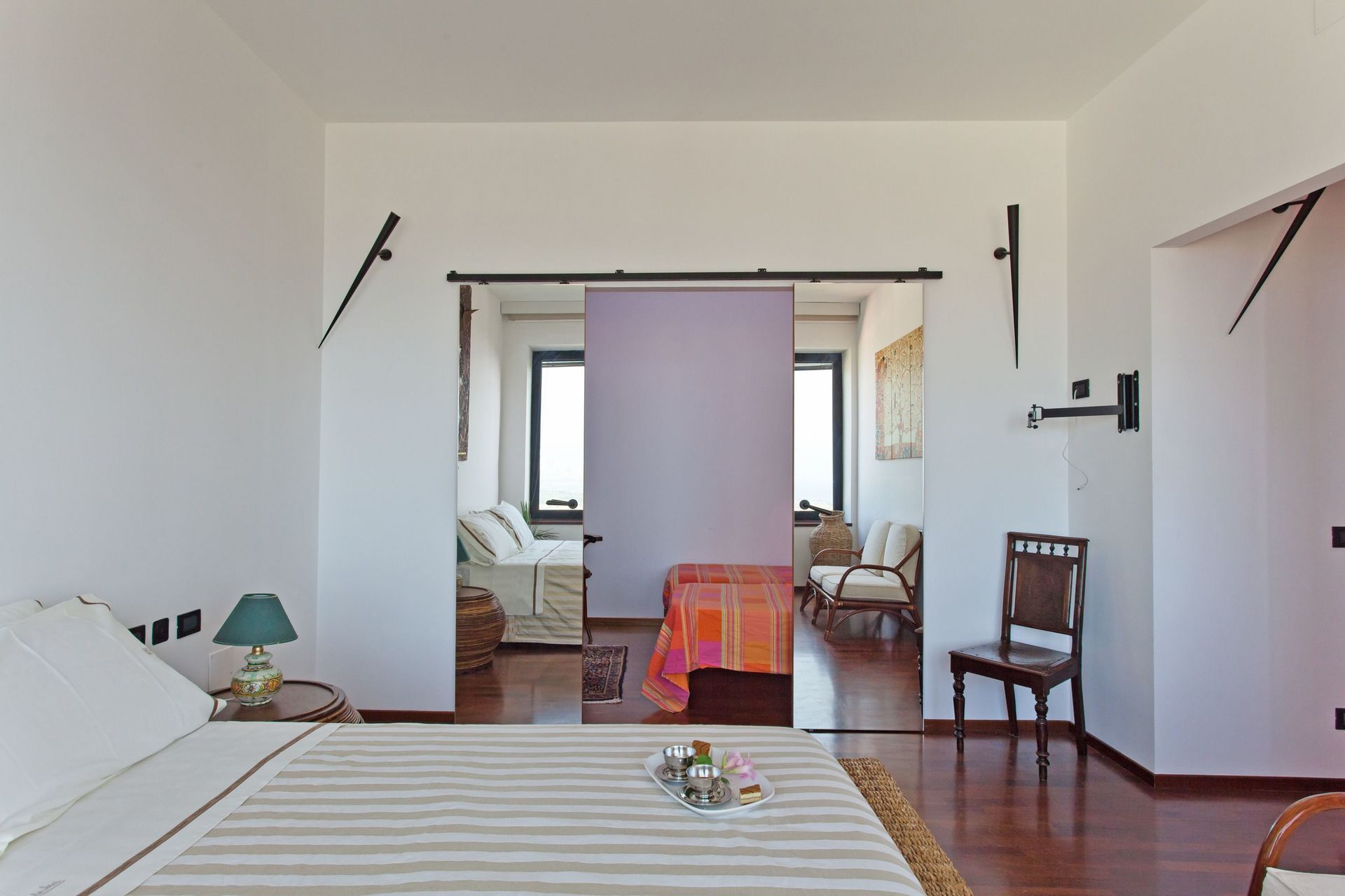 Soppalco (aperto sulla zona sottostante e dotato di 2 split per l'aria condizionata): letto matrimoniale e letto alla francese (divisi da un separè costituito da armadiature), bagno con doccia.