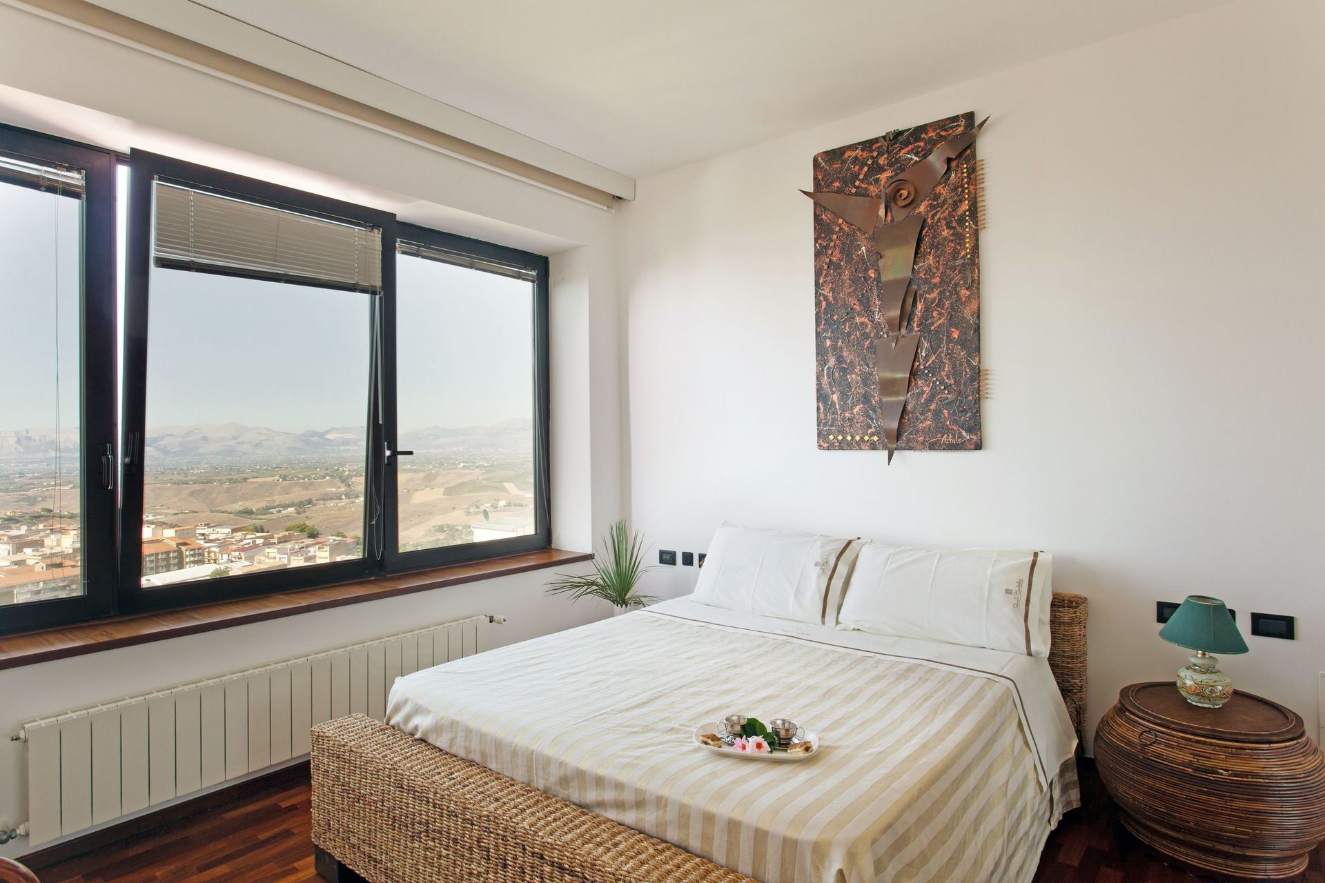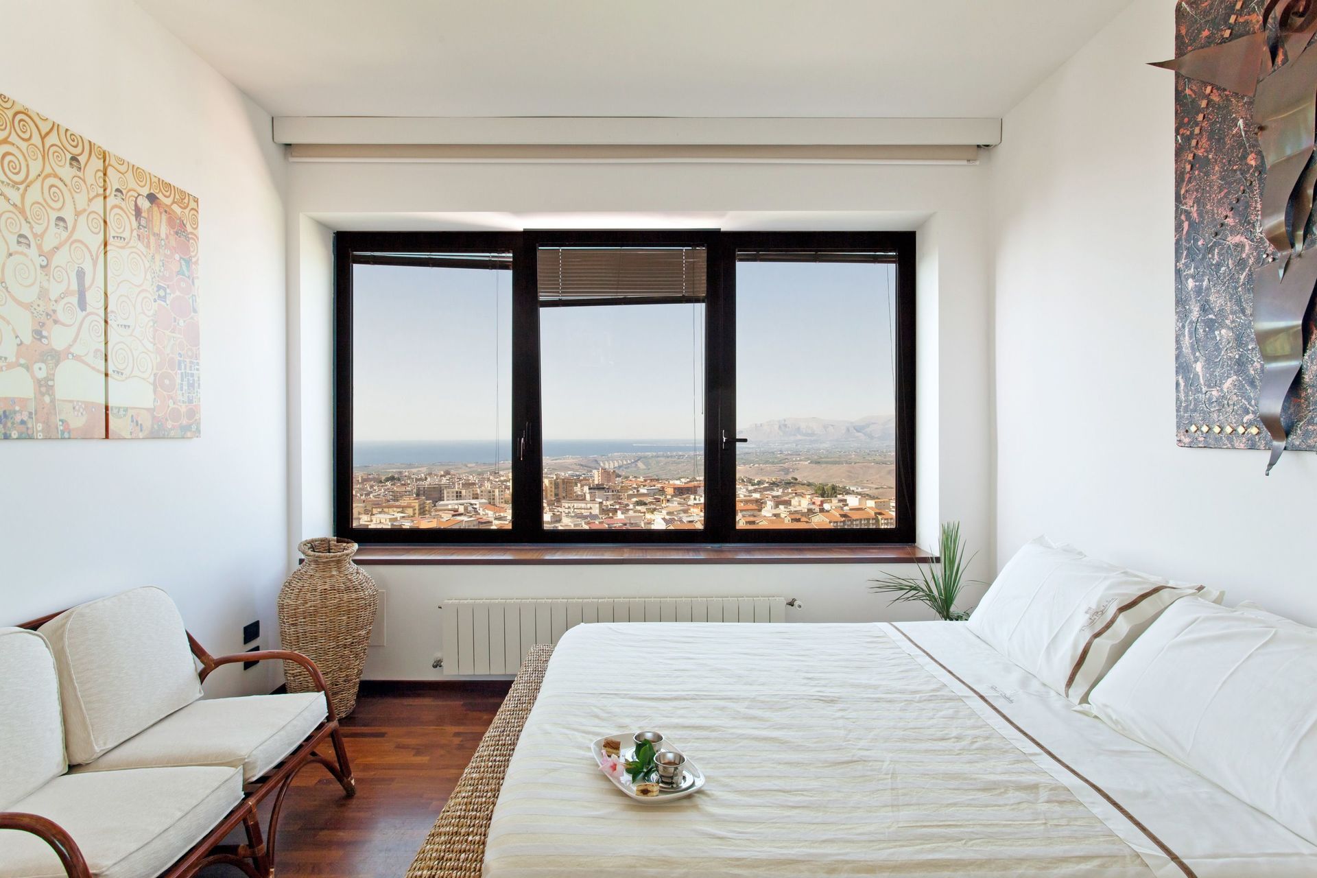 Primo piano (accessibile esternamente): ingresso su spettacolare soggiorno (aria condizionata) con grandi vetrate che si affacciano sul paese di Alcamo e sul mare, cucina (forno, freezer, lavastoviglie, lavatrice) con zona pranzo (aria condizionata), camera (aria condizionata) con letto matrimoniale e letto singolo, bagno con vasca idromassaggio, una camera con letto matrimoniale (aria condizionata) e letto singolo e bagno privato con vasca/doccia, camera matrimoniale (aria condizionata).