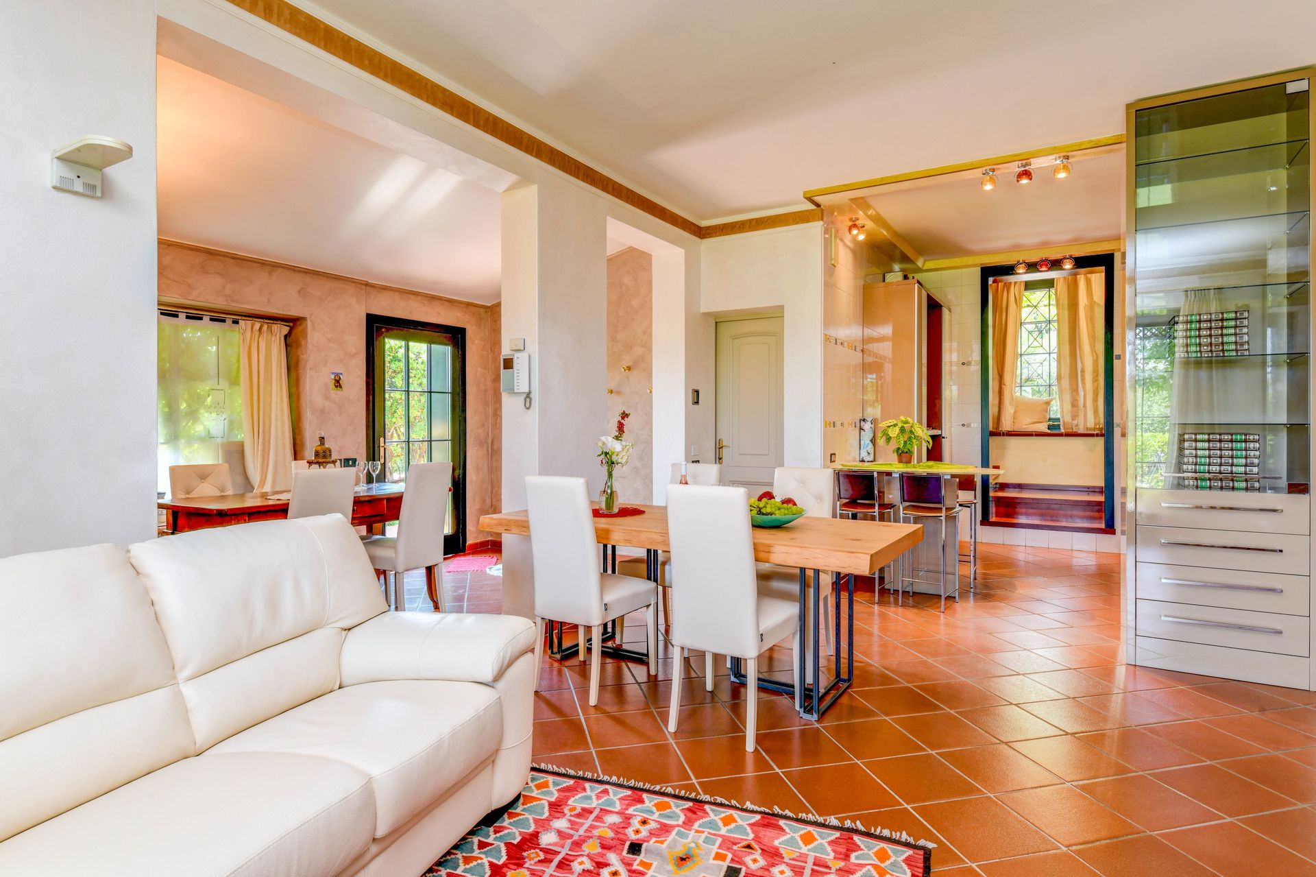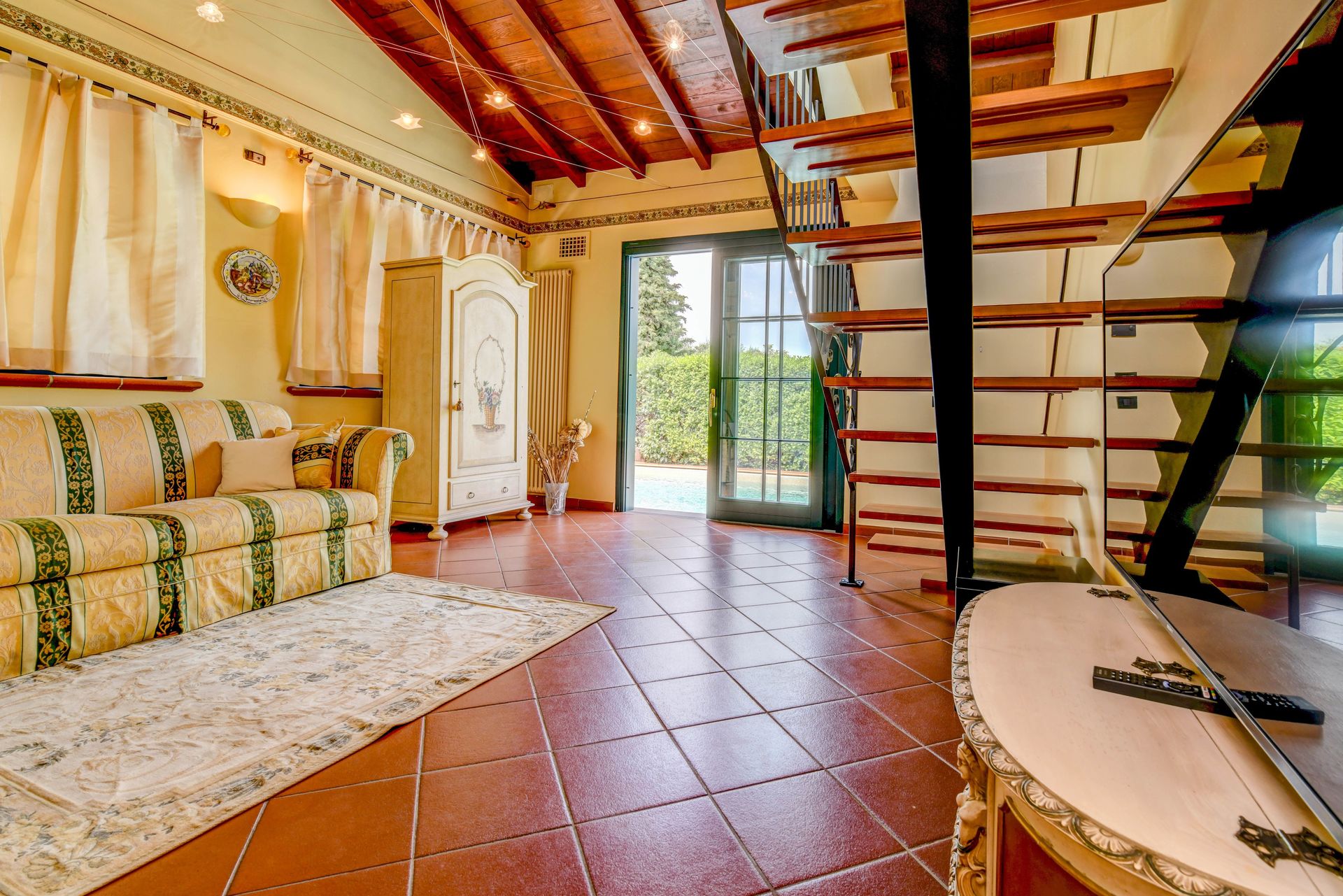 Soggiorno: due tavoli da pranzo (persone: 4), divano letto, internet WIFI, aria condizionata, televisione, uscita sul giardino, uscita sul giardino.