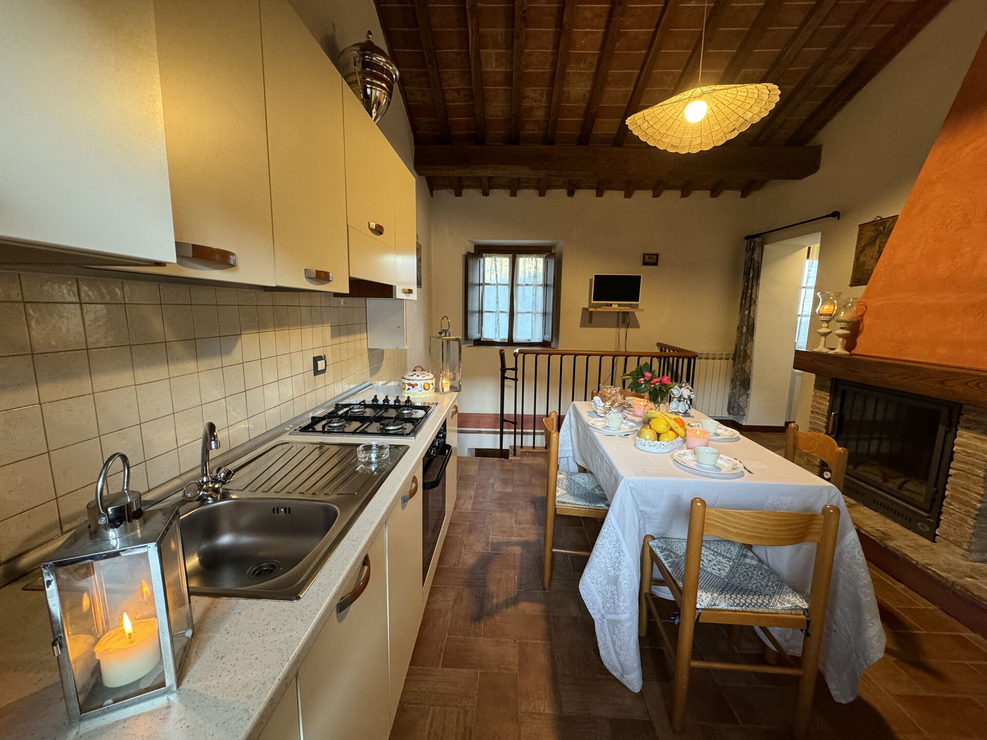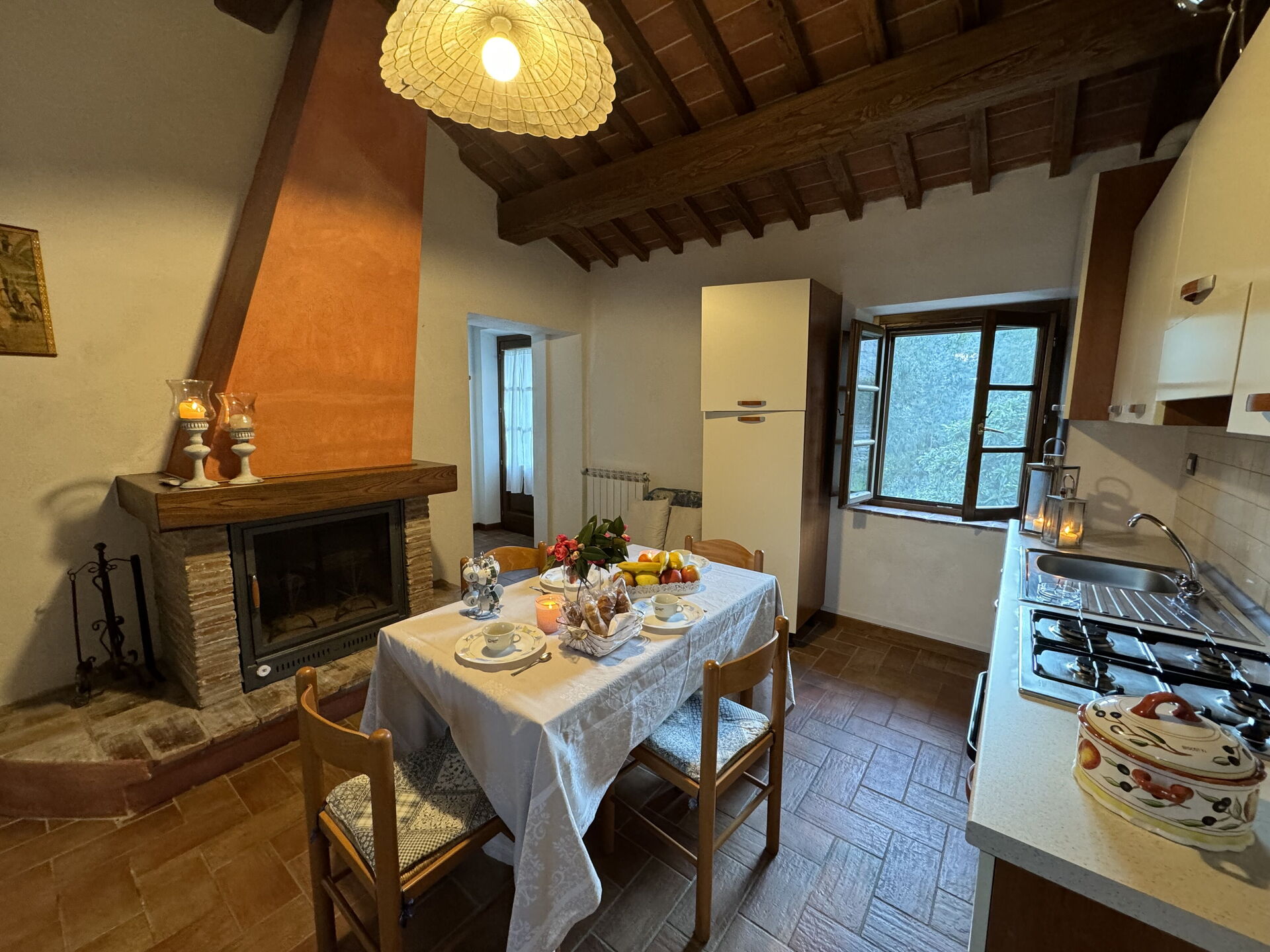 Cucina - soggiorno: tavolo da pranzo, lavastoviglie, frigo, piano cottura, divano, caminetto.