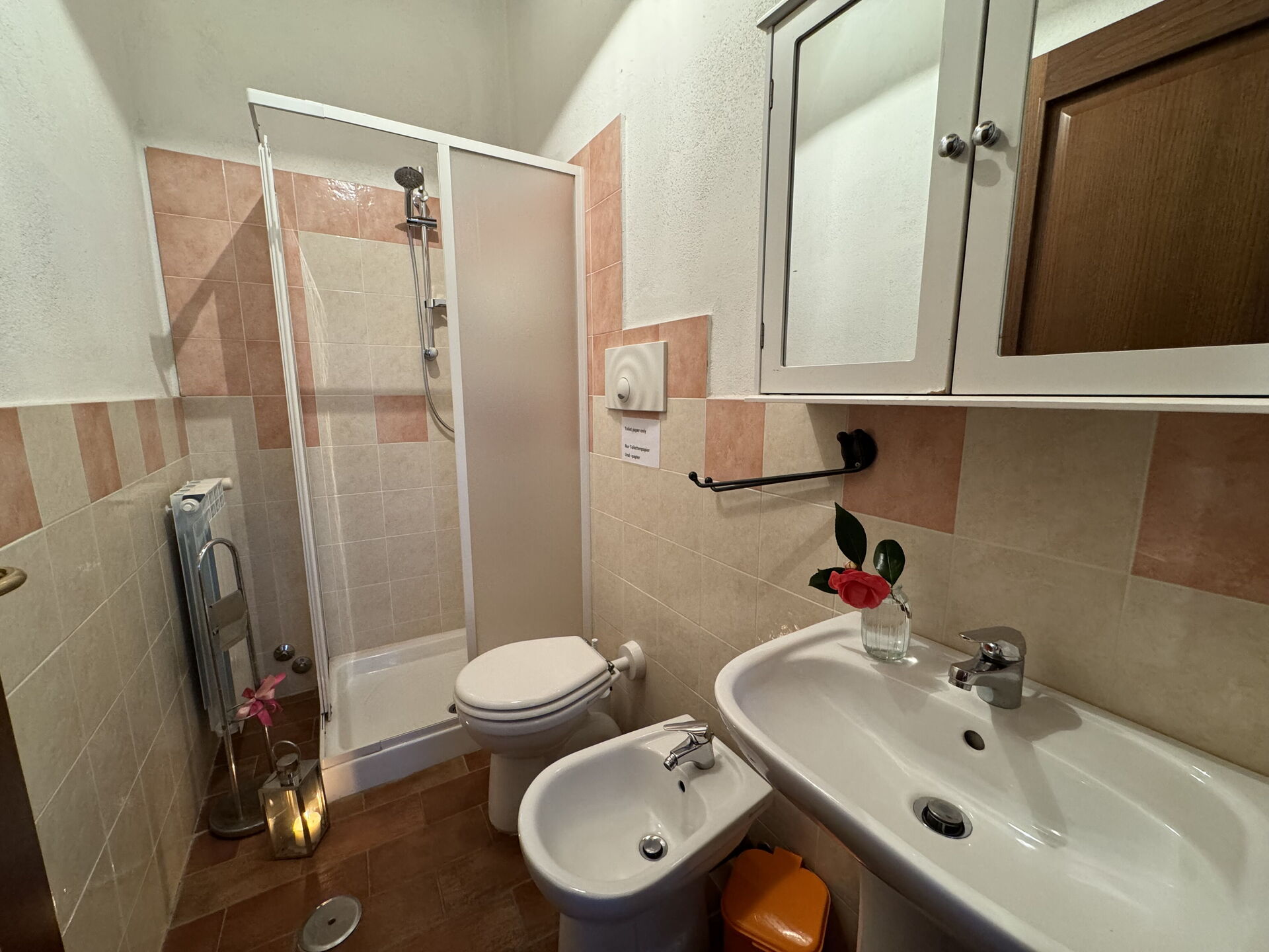 Bagno: lavandino, wc, bidet, doccia.
