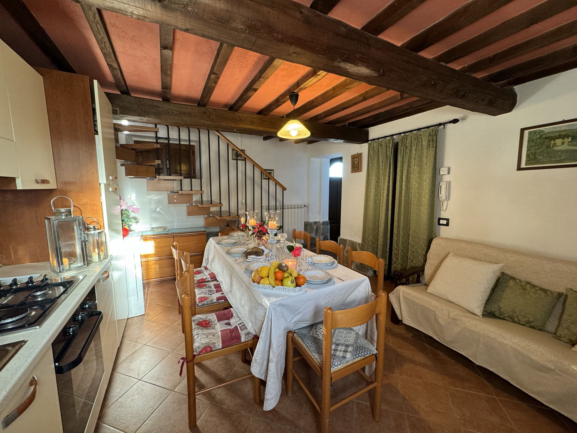 Cucina - soggiorno: tavolo da pranzo, piano cottura, forno, divano.