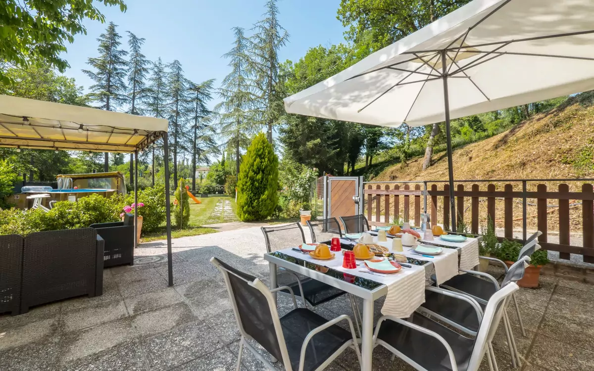 Situata ad Auditore, in Italia, questa Green Wellness House semi-indipendente offre un'esperienza di vacanza idilliaca. La proprietà su due piani presenta un ampio giardino privato recintato e un giardino naturalistico, arricchiti da una piscina fuori terra disponibile da maggio a settembre. Goditi l'aria aperta con comodità come una doccia esterna, un tavolo da ping-pong, mobili da giardino, un barbecue e un'area giochi per bambini. All'interno, puoi rilassarti nella sauna, nella vasca idromassaggio e nell'area spa, ideali per rigenerarsi. La casa vanta anche servizi come Internet WiFi e parcheggio sul posto.
