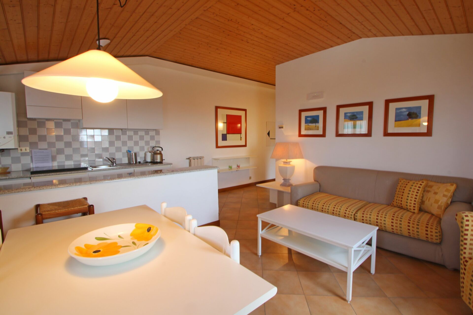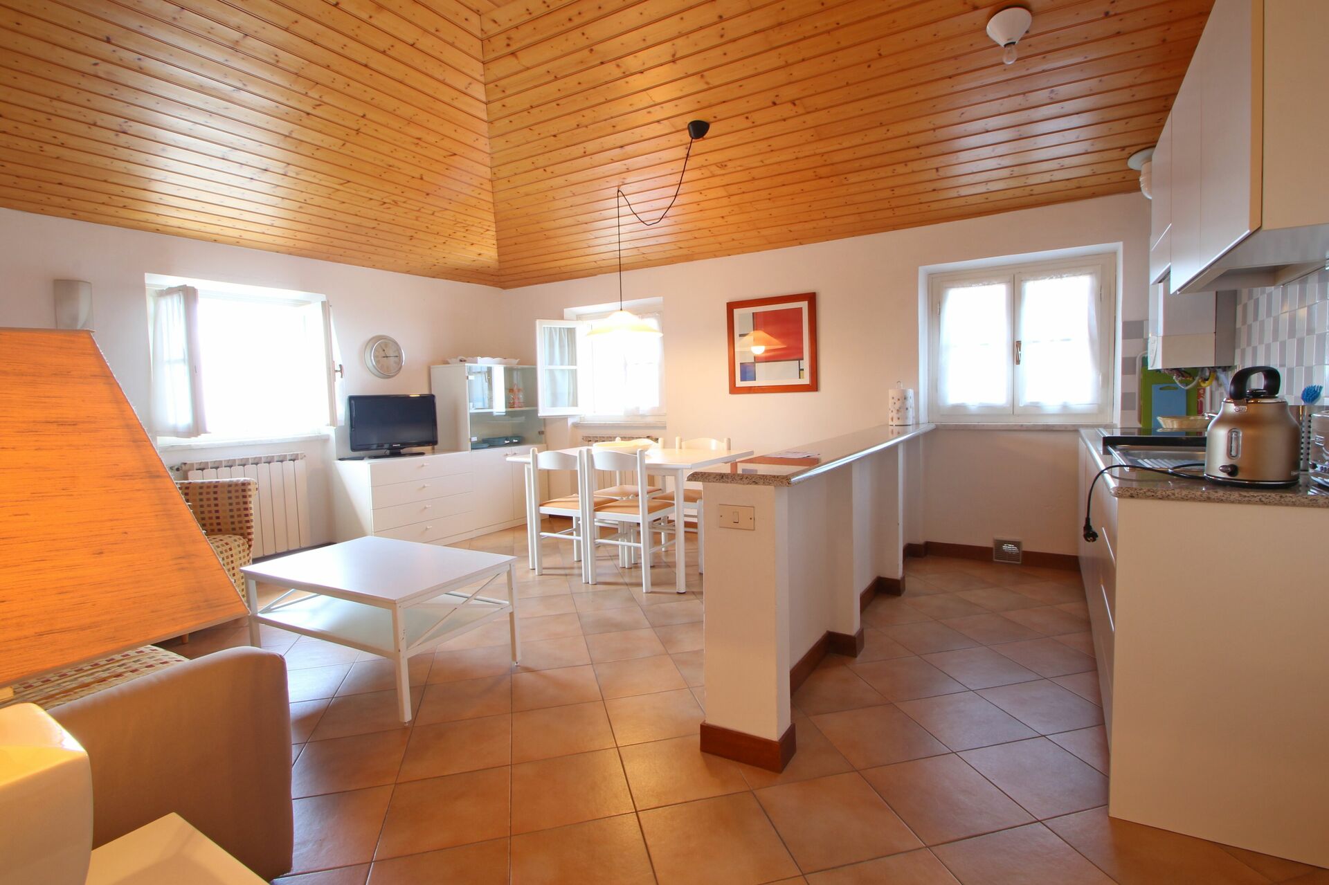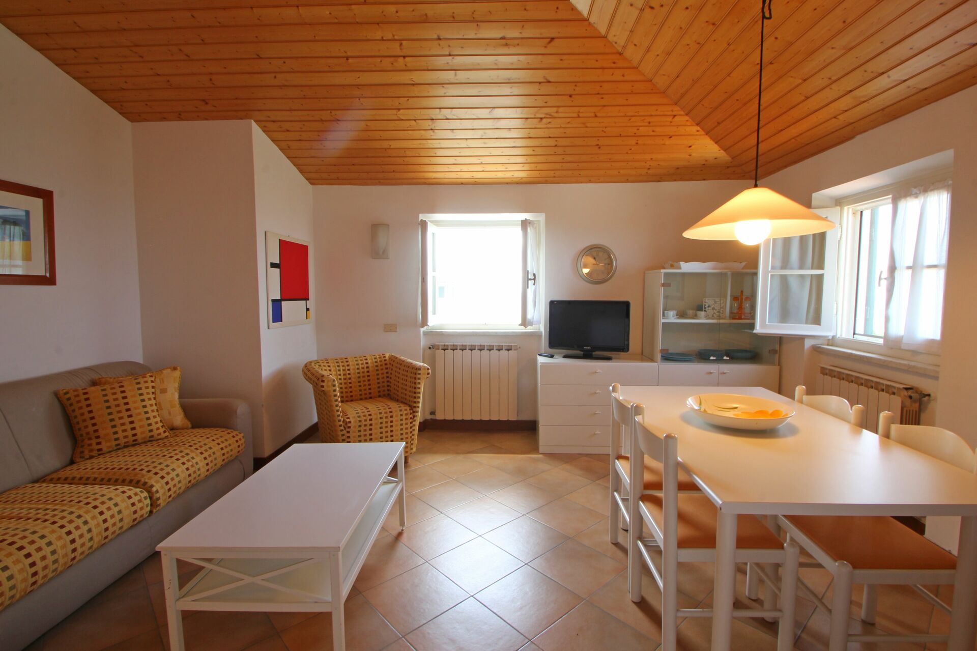 L'appartamento ha vista mare e vista panoramica su frazioni e borghi, disimpegno, bagno con doccia con finestra, cucina a vista con tavolo da pranzo, soggiorno con divano letto estraibile e TV, zanzariere, WiFi.