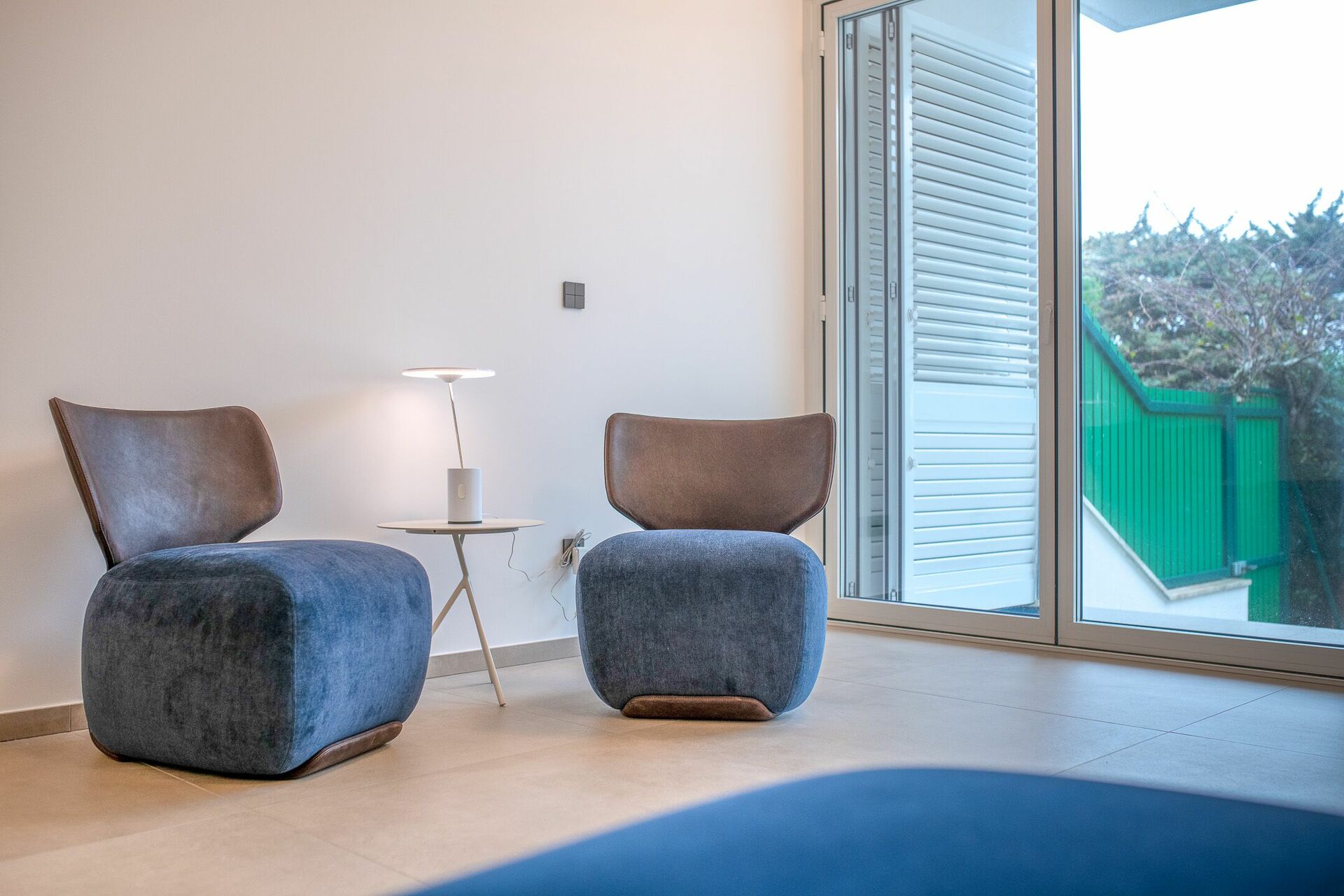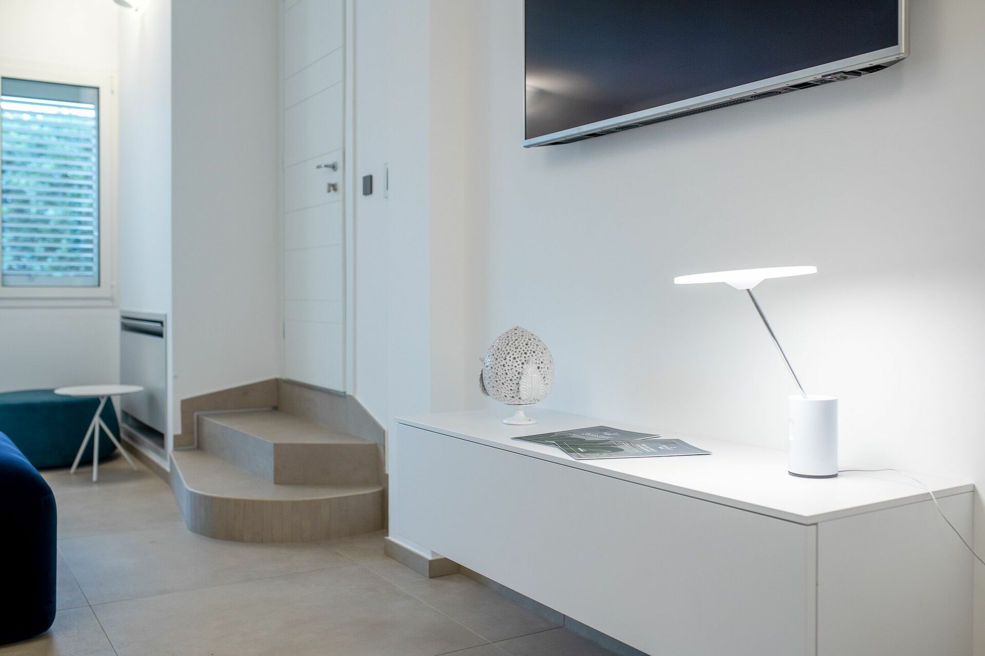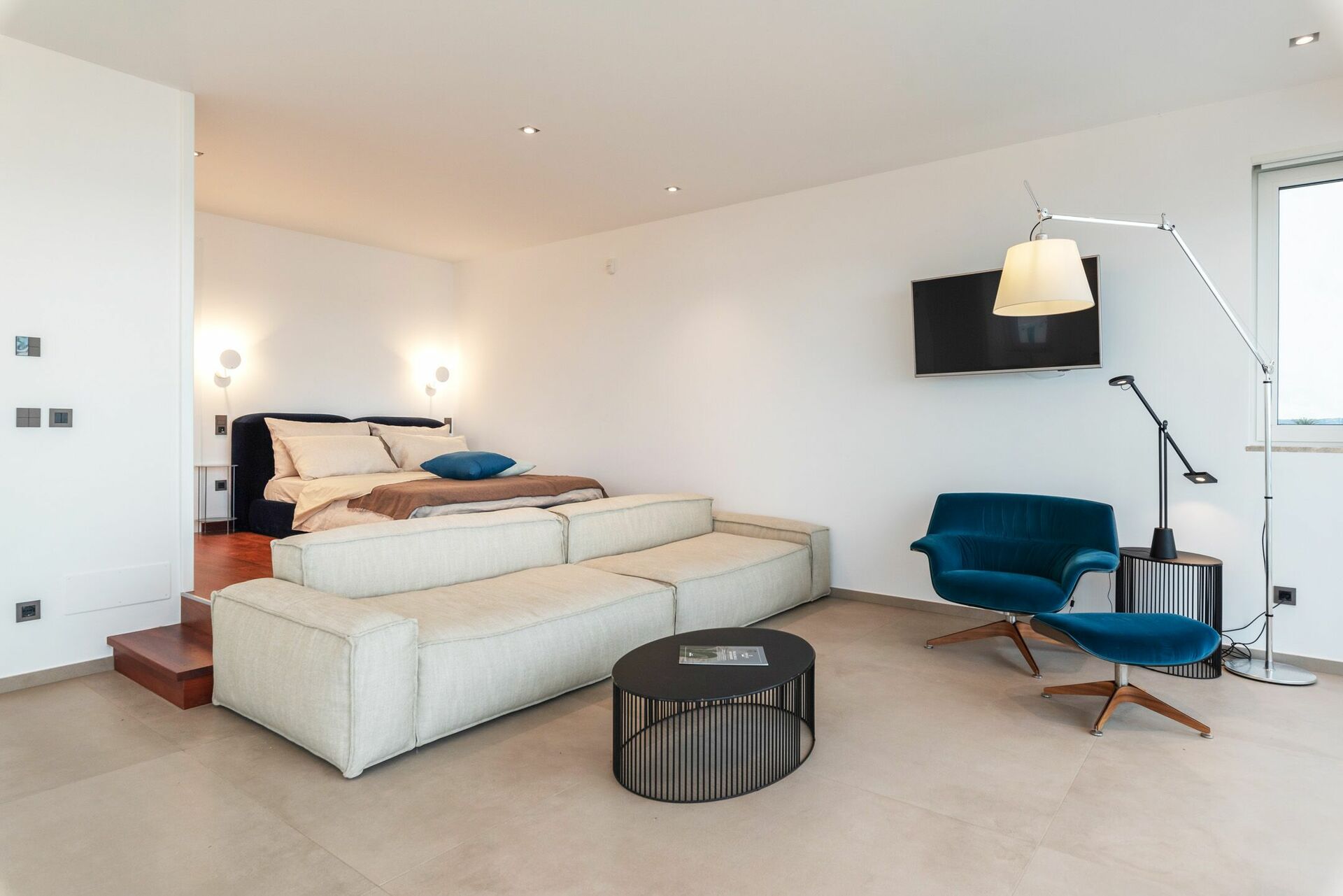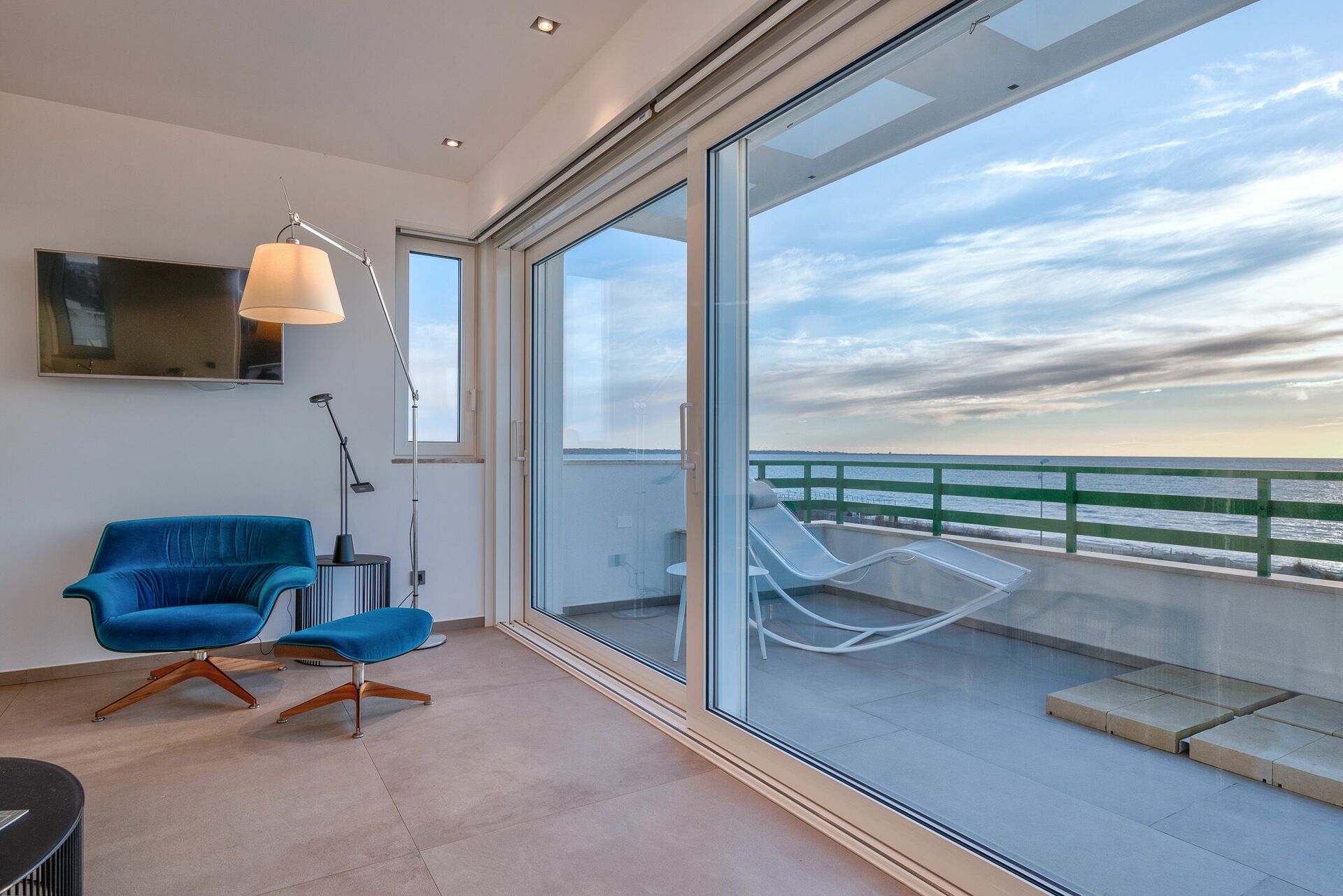 Le vetrate hanno una doppia chiusura domotizzata per equilibrare l’ingresso della luce all’interno della stanza. In corrispondenza delle vetrate c’è inoltre l’ampio divano che può ospitare comodamente 4 persone e la poltrona con poggiapiedi Amura Design e punto luce.