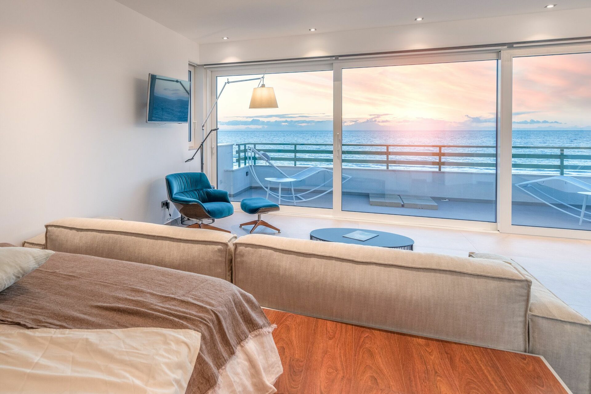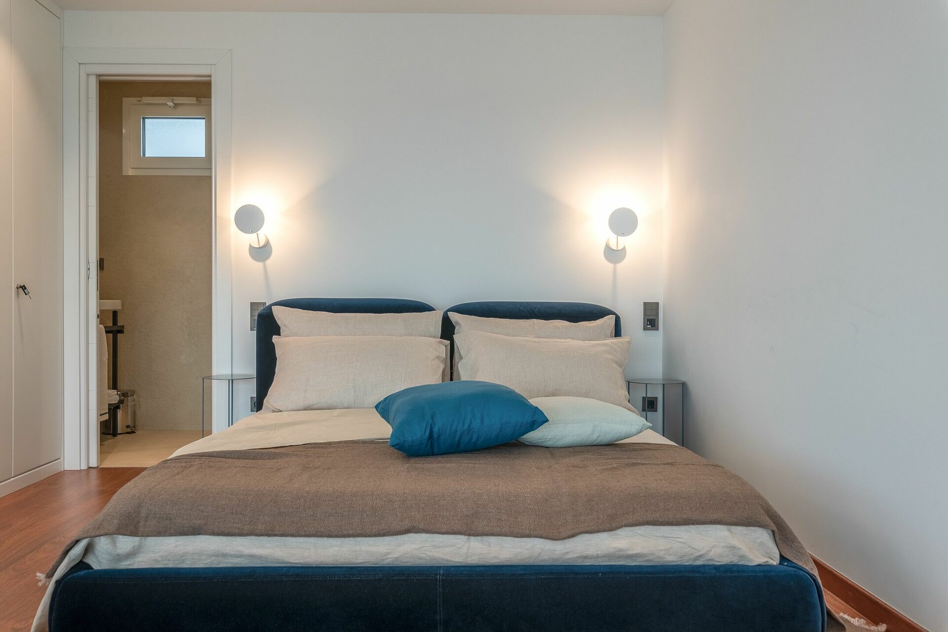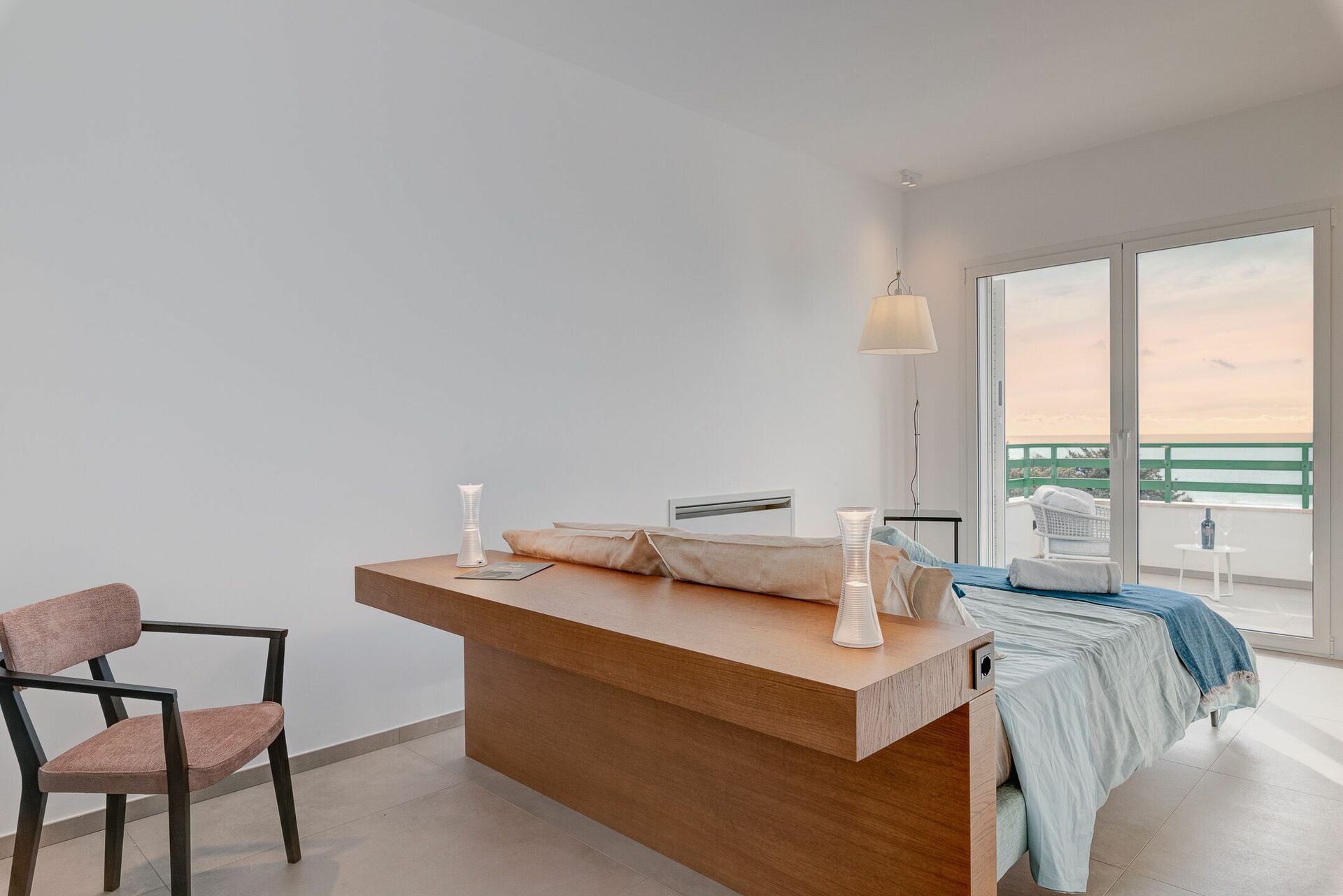 La Master Suite, posta al secondo piano, è un’ampia camera da letto con vetrate a tutta vista e balcone panoramico con vista mare. Il letto matrimoniale (king size) della collezione Amura Lapis Bed, ha una comoda e morbida testiera in velluto, ed è posizionato su un palchetto con parquet per rendere ancora più emozionante la vista mare.