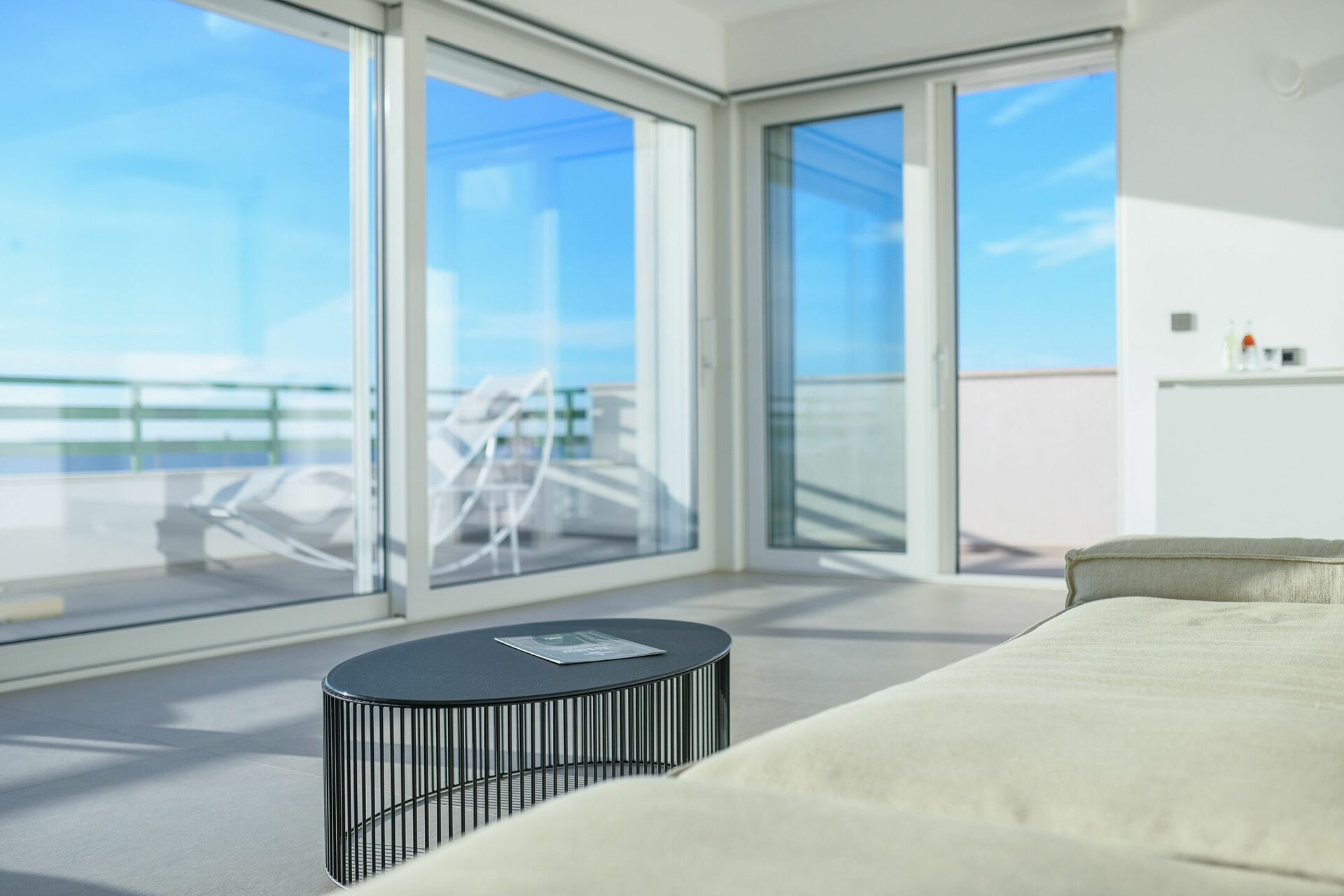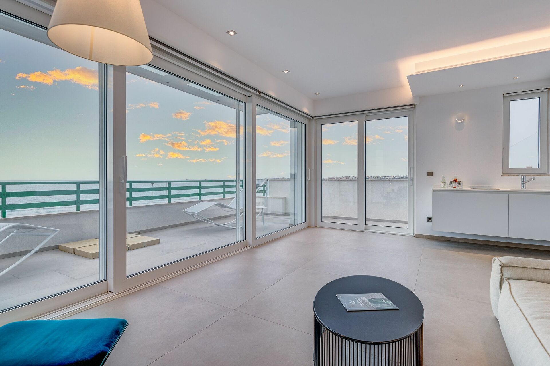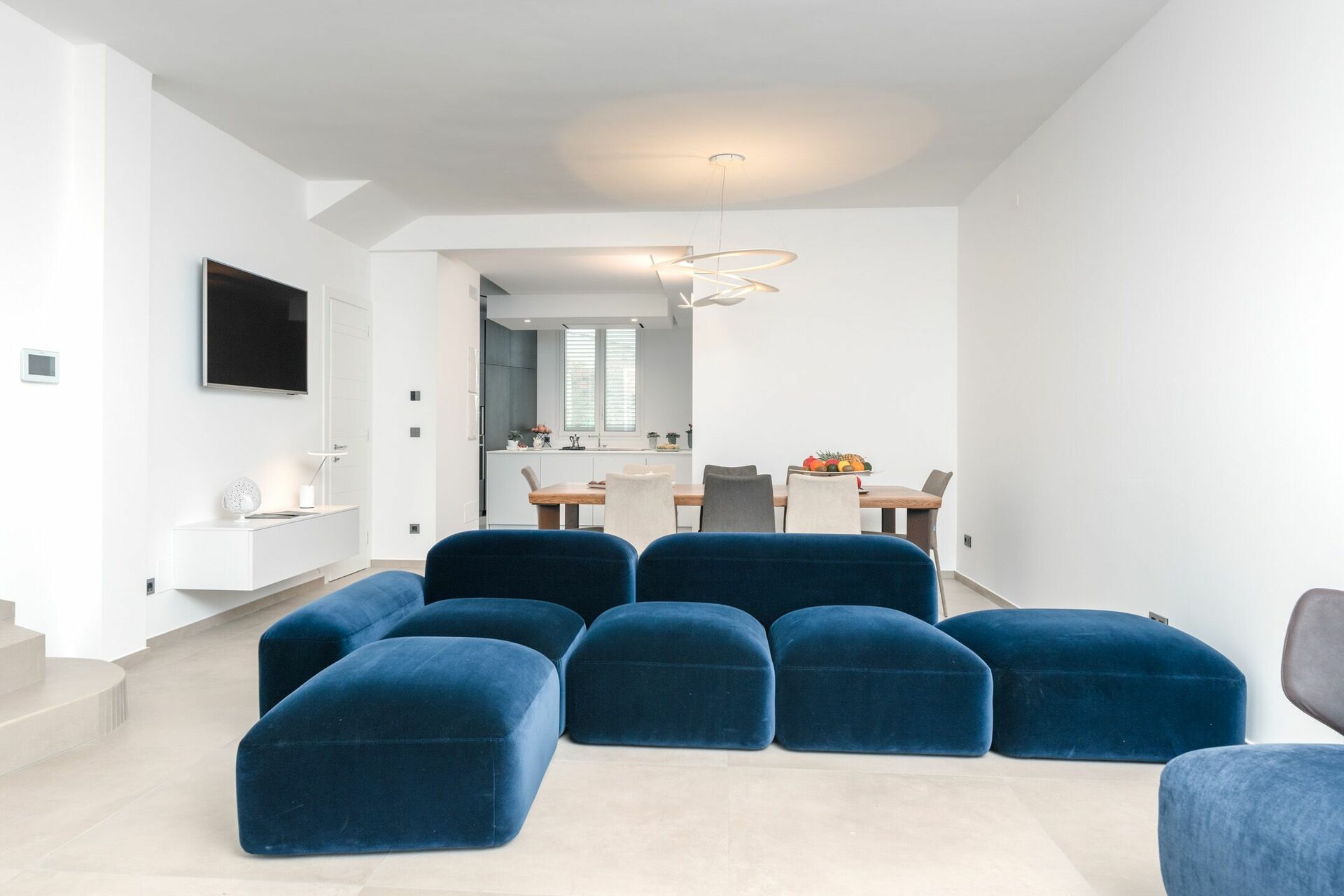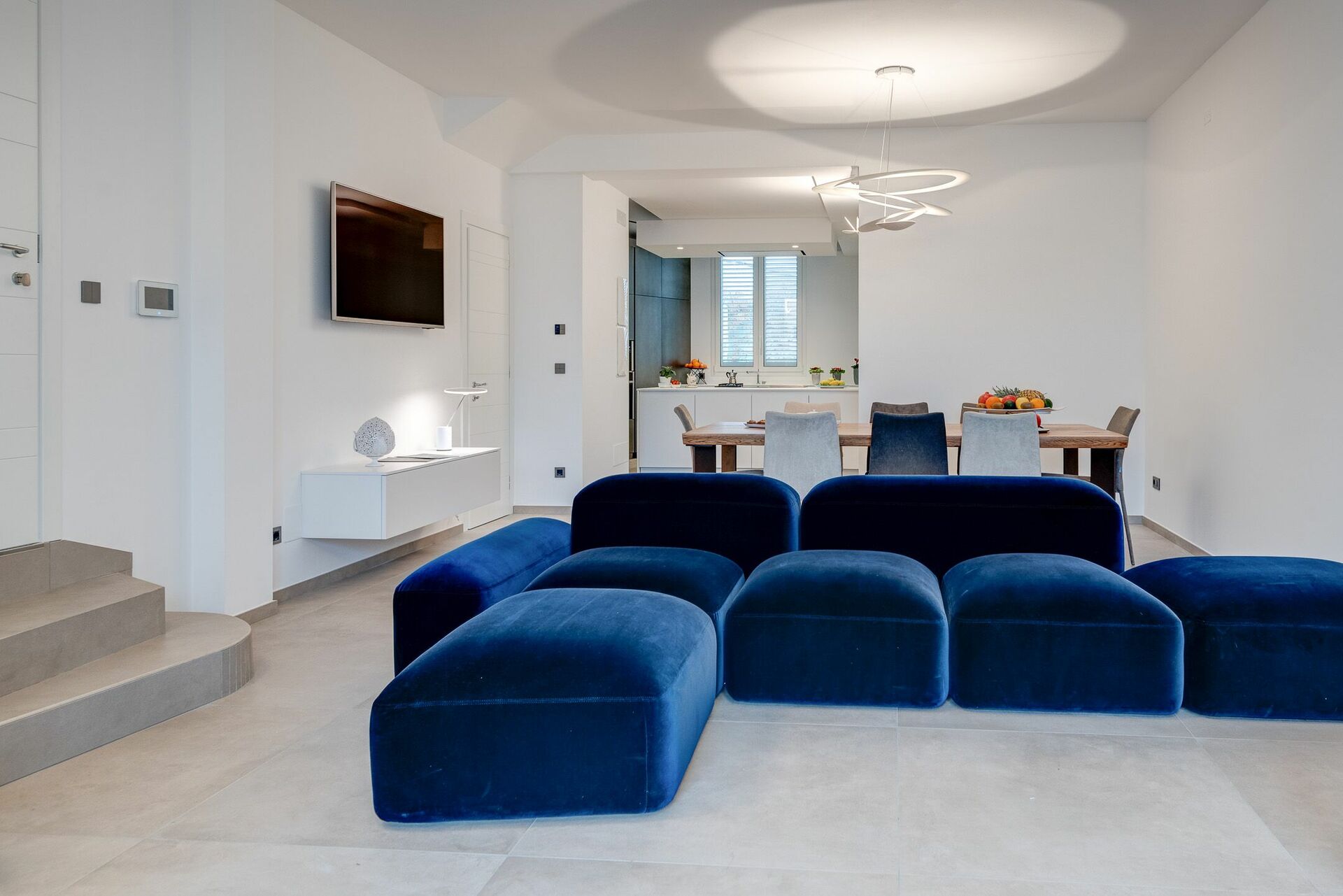 L'ampio soggiorno, con la sua porta finestra a tutta vista, presenta numerose sedute, un divano Amura Design e tv, ricreando un ambiente ideale per ospitare fino a 12 persone in pieno comfort.
