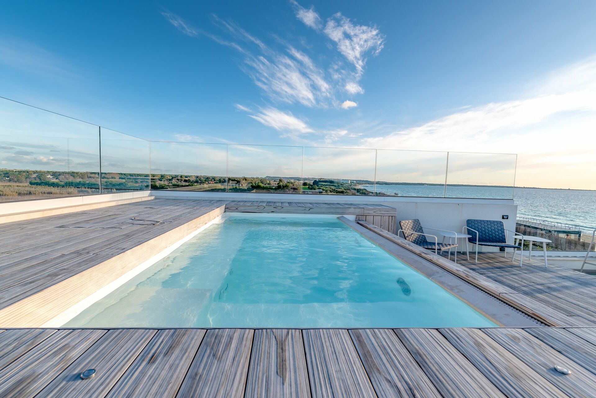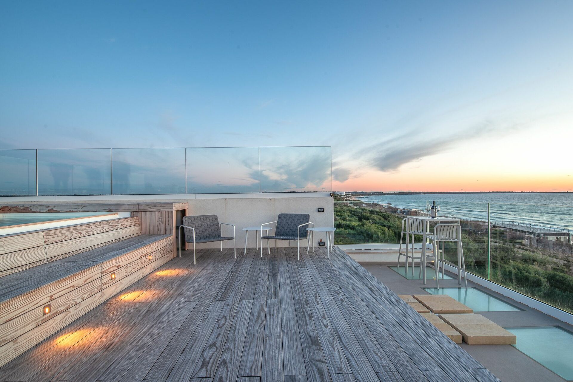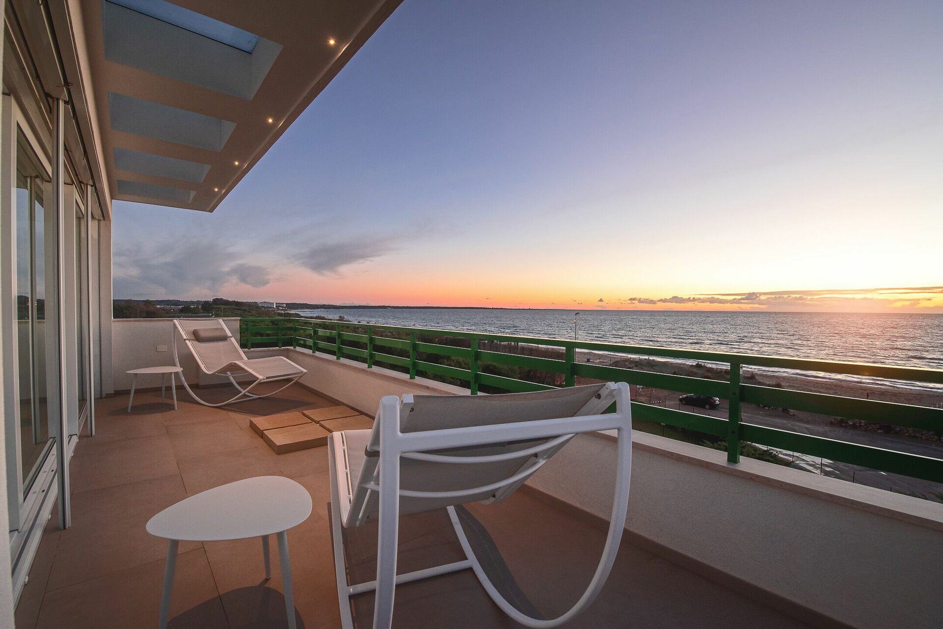 Dal balcone, allestito con arredi esterni è, possibile accedere alla terrazza panoramica sulla Baia Verde di Gallipoli con splendida vista mare e piscina a sfioro con getti massaggianti (2,5x4x0,90). Su richiesta, con pagamento extra, è disponibile il riscaldamento dell’acqua della piscina. La grande terrazza con pavimento in pregiato tavolato, è arredata di lettini prendisole e tavolini con ombreggianti per trascorrere favolosi tramonti in compagnia. Così come durante una regata in barca a vela, da un comodo sportellino potrai ritrarre la doccia a scomparsa e così rinfrescarti.
