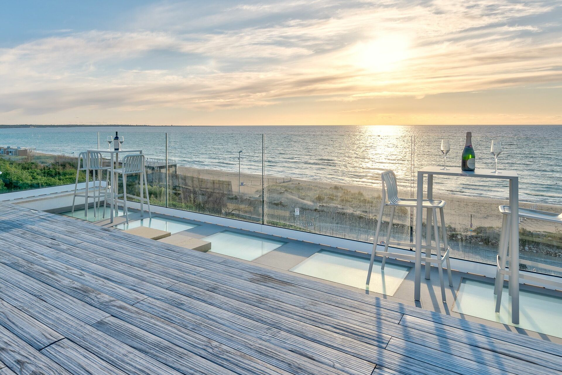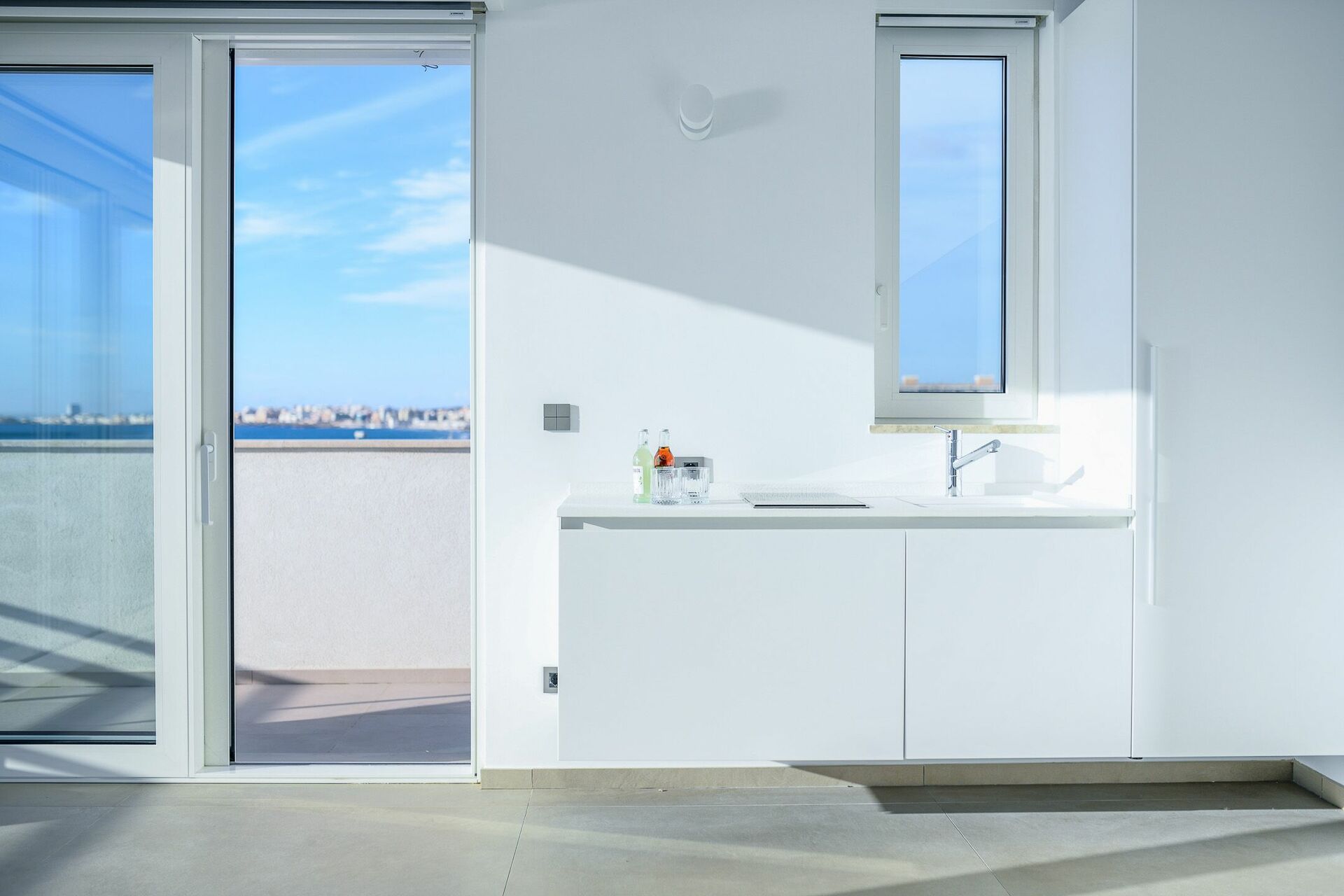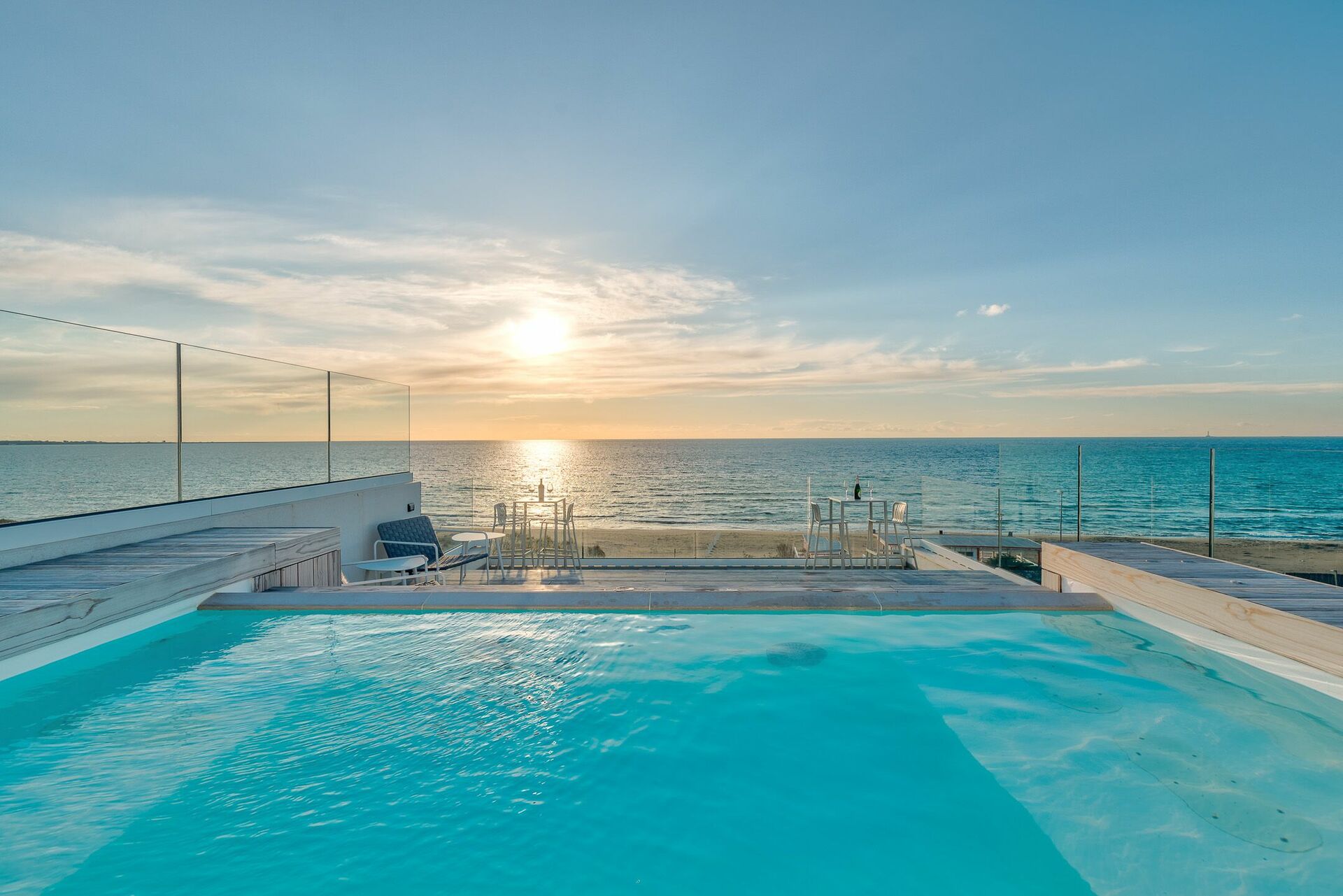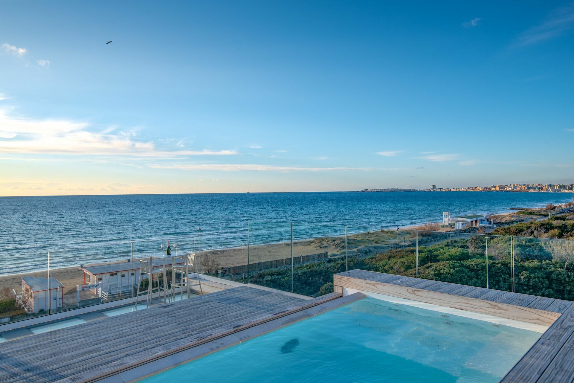 Dal balcone, allestito con arredi esterni è, possibile accedere alla terrazza panoramica sulla Baia Verde di Gallipoli con splendida vista mare e piscina a sfioro con getti massaggianti (2,5x4x0,90). Su richiesta, con pagamento extra, è disponibile il riscaldamento dell’acqua della piscina. La grande terrazza con pavimento in pregiato tavolato, è arredata di lettini prendisole e tavolini con ombreggianti per trascorrere favolosi tramonti in compagnia. Così come durante una regata in barca a vela, da un comodo sportellino potrai ritrarre la doccia a scomparsa e così rinfrescarti.