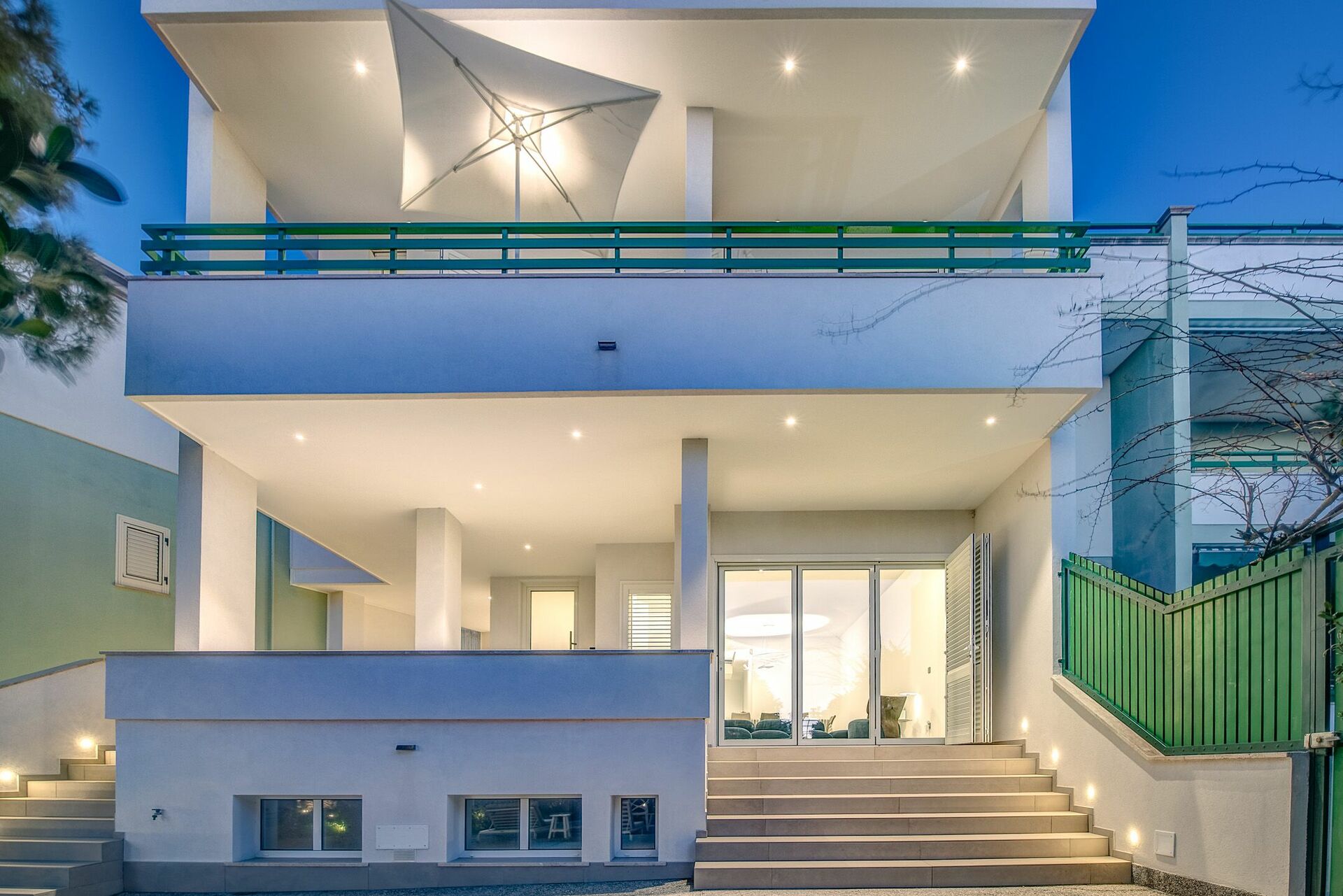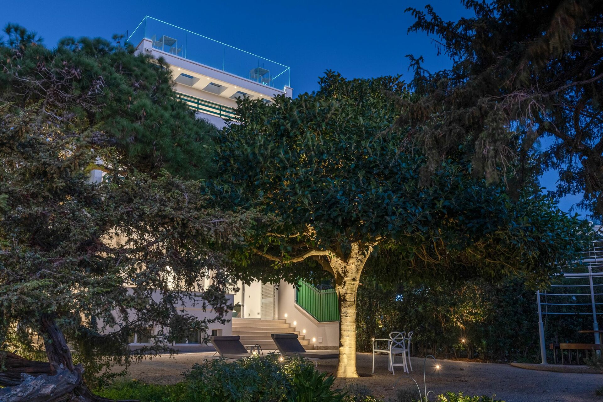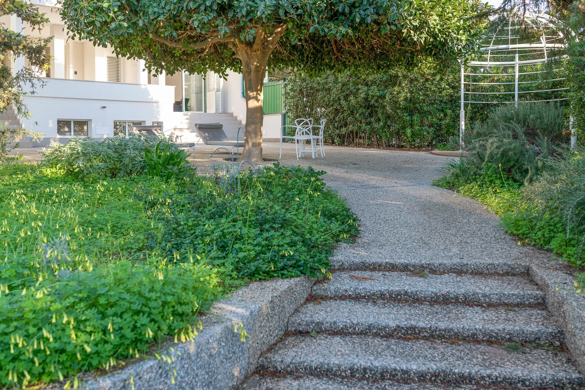 Il giardino, con ricca vegetazione mediterranea e arredi esterni, permette pranzi, cene e aperitivi all’aperto. Sul retro della villa in affitto è possibile parcheggiare un’auto.